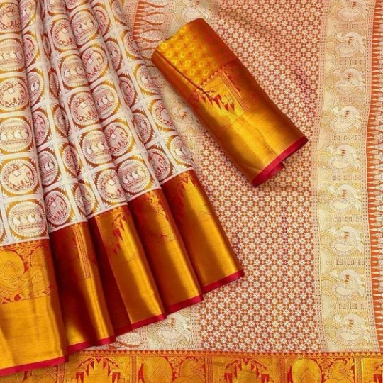 Kanchipuram Silk - Heavy silk saris with contrasting borders and elaborate patterns, often with gold and silver zari. Known for their durability and grandeur, frequently used in weddings and special occasions.