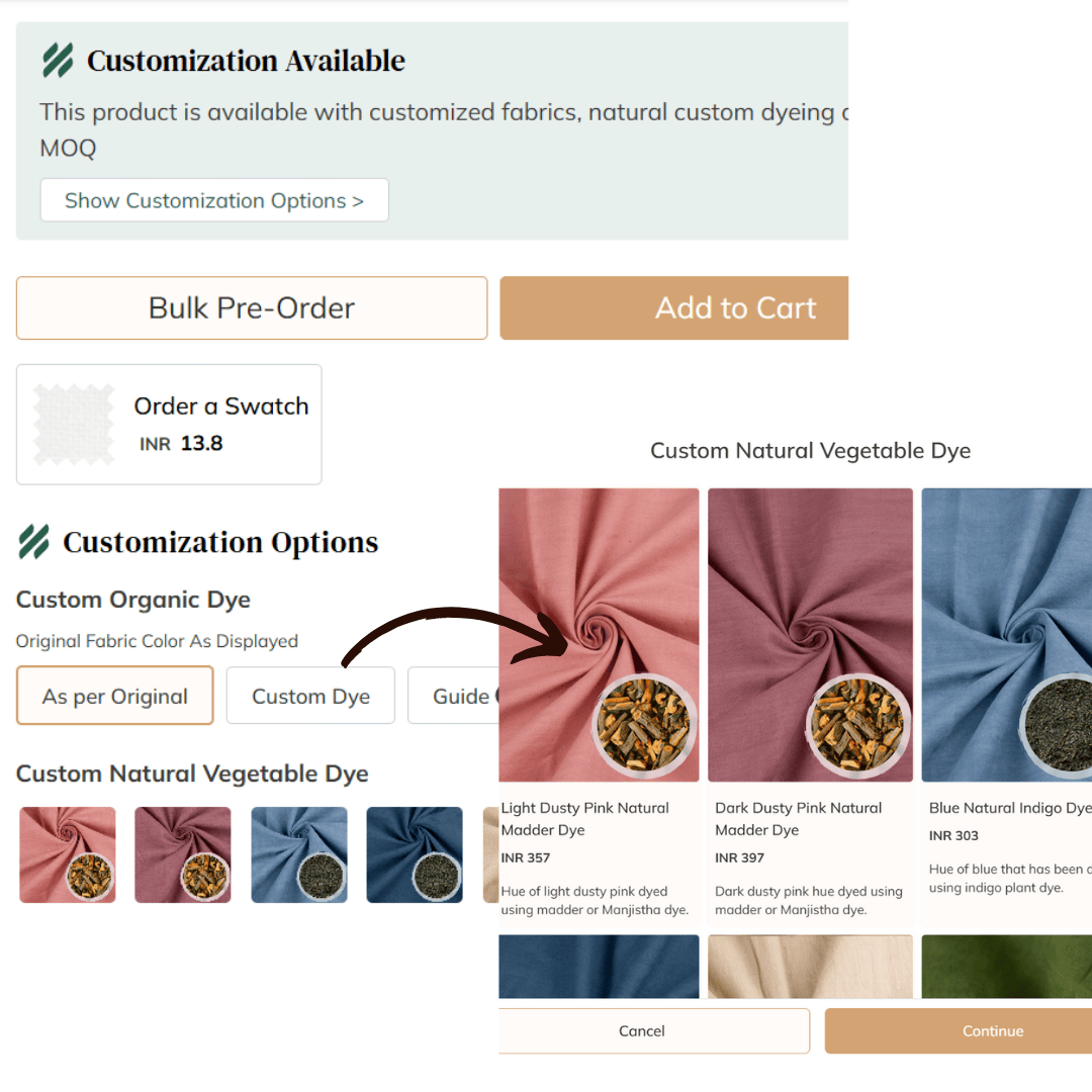 We currently offer natural dyeing on a wide range of cotton, silk, khadi, linen, and handwoven blends. These fabrics not only look beautiful but also feel good to wear and work with.