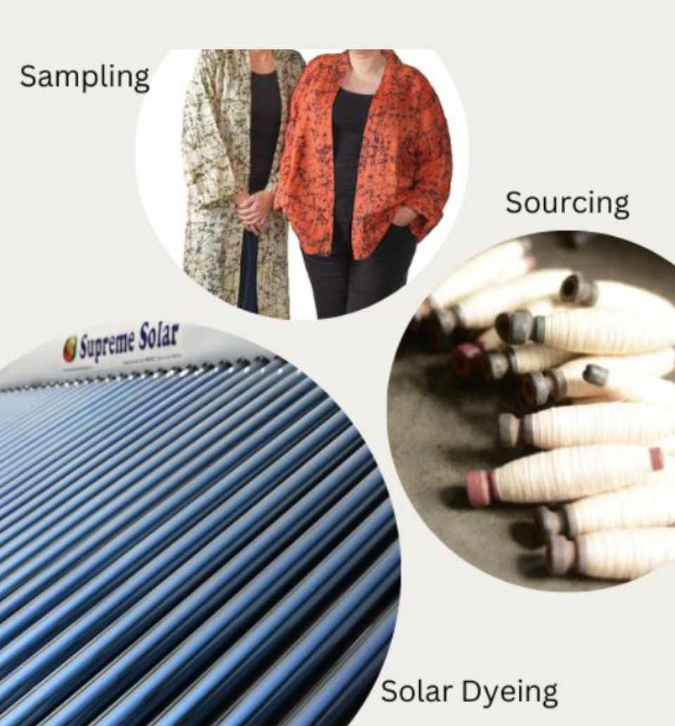 Production: We are committed to sustainable Made-to-order production practices, using solar energy and handlooms that do not require fuel or electricity in all of its production processes. We also offer flexibility in smaller quantities of sampling which further eliminates wastage of resources.
