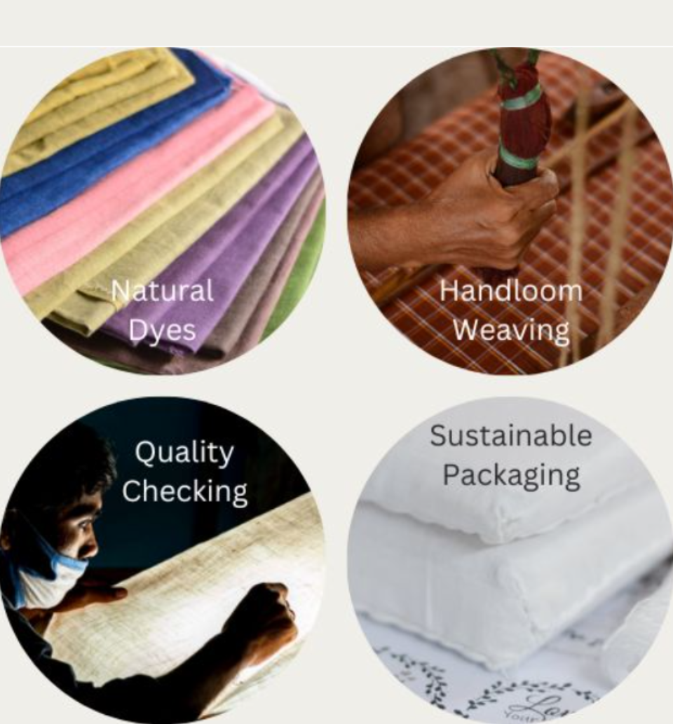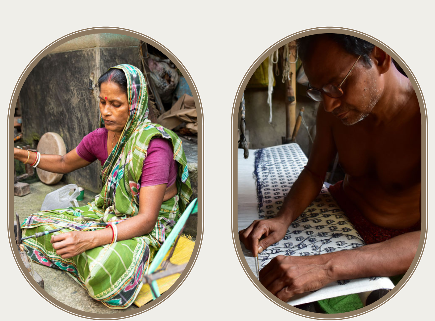 Weaving: Anuprerna works with handloom weavers from rural parts of West Bengal, supporting traditional crafts and local communities. The Handspinning & handlooms do not require fuel or electricity, further reducing the environmental impact of the weaving process.