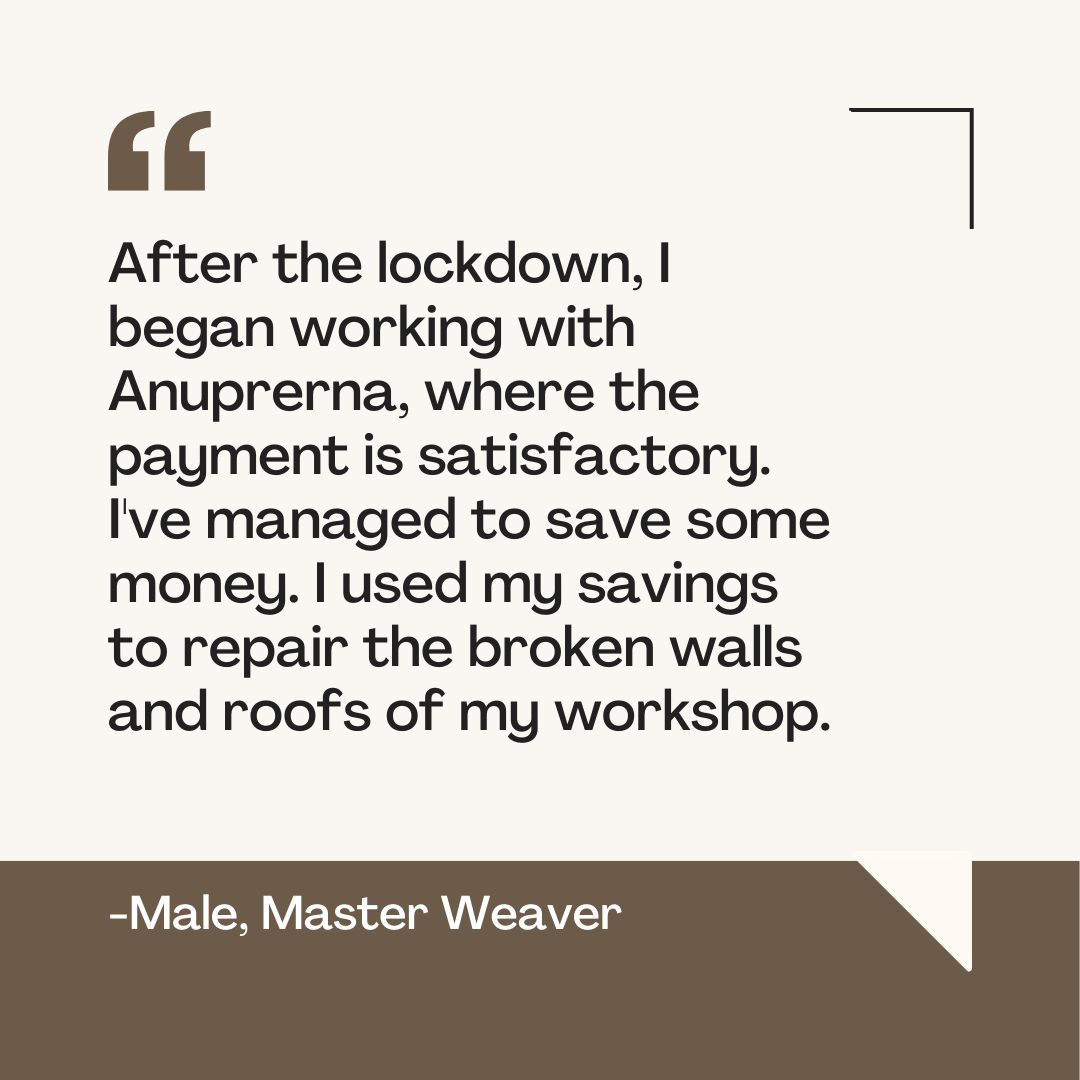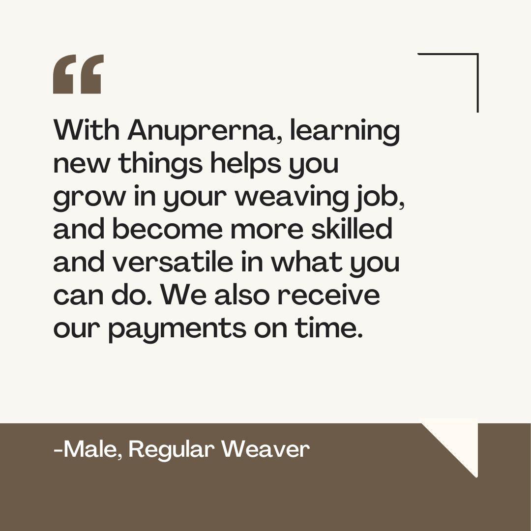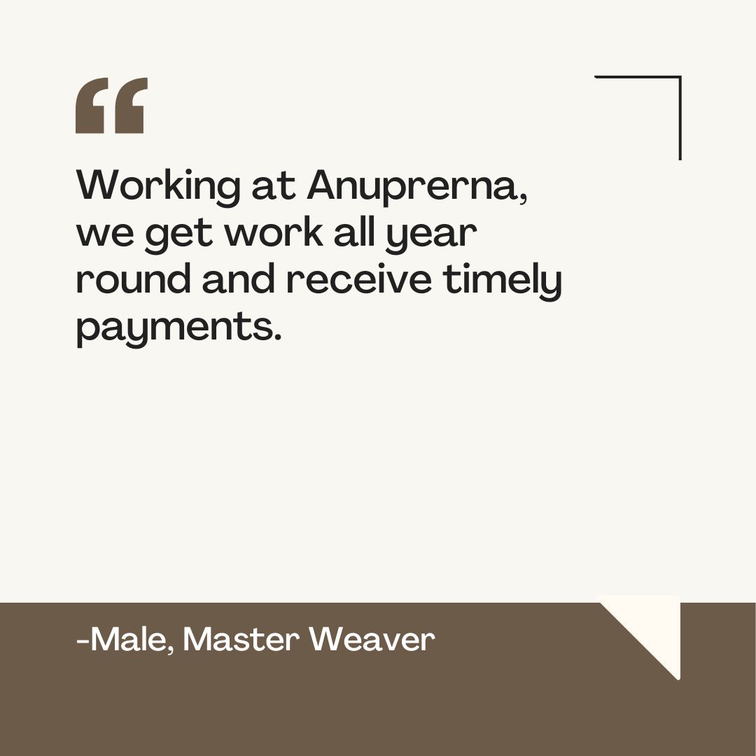 This in-depth study offers a window into the lives of artisans like this master weaver, whose livelihood has been transformed through consistent work and fair compensation. Anuprerna’s impact extends beyond financial security—it empowers artisans to improve their quality of life and invest in their future.