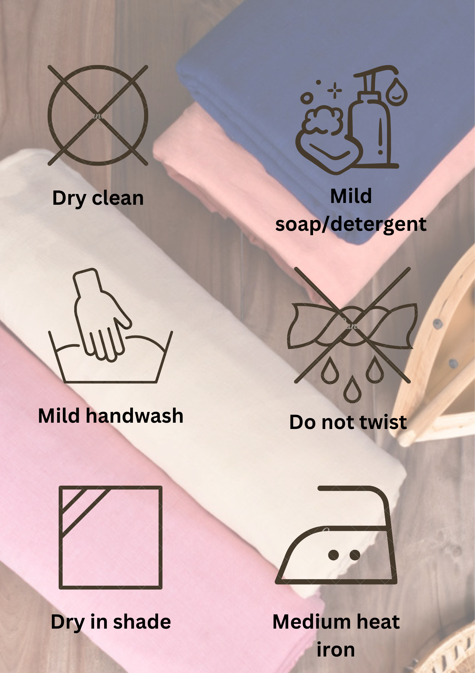 - Do not wring—gently squeeze excess water. Avoid tumble drying.