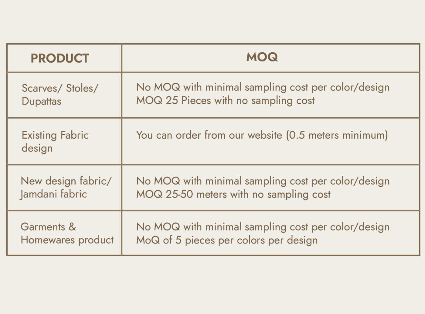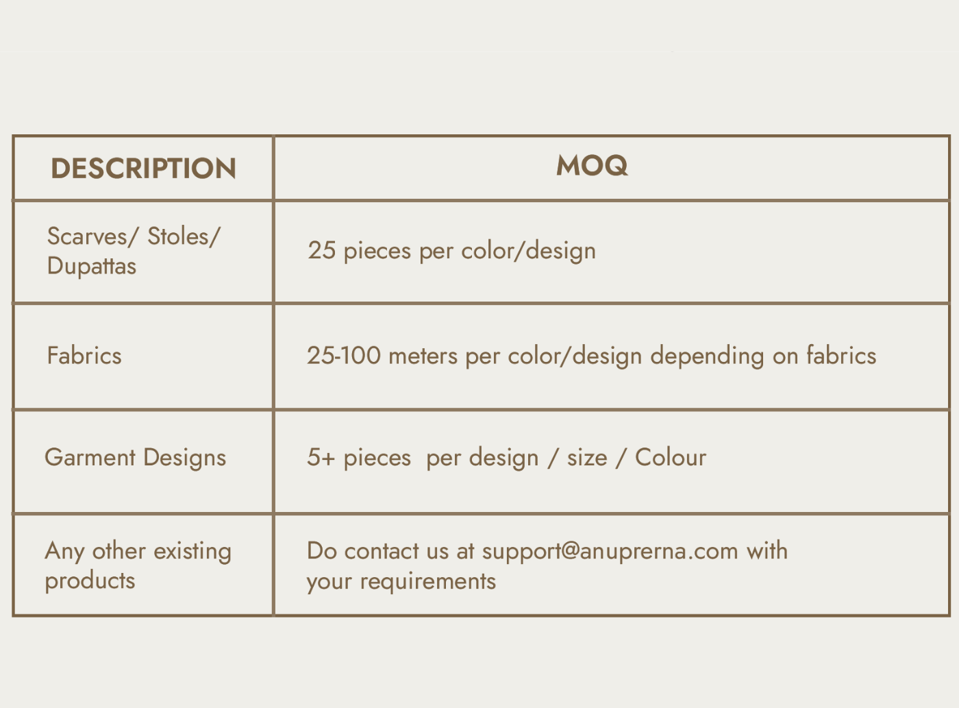 Anuprerna sets a minimum order quantity (MOQ) of 25 pieces per color/design for scarves/stoles/dupattas, with fabric requirements ranging from 25-100 meters based on fabric type. Garment designs require a minimum of 5 pieces per design, size, and color. For other products or inquiries, contact support@anuprerna.com to discuss your requirements.