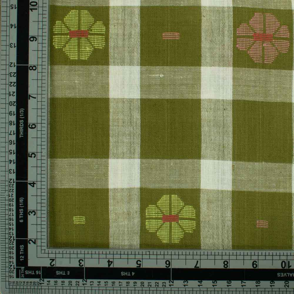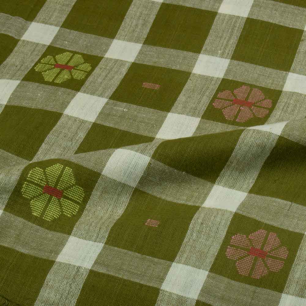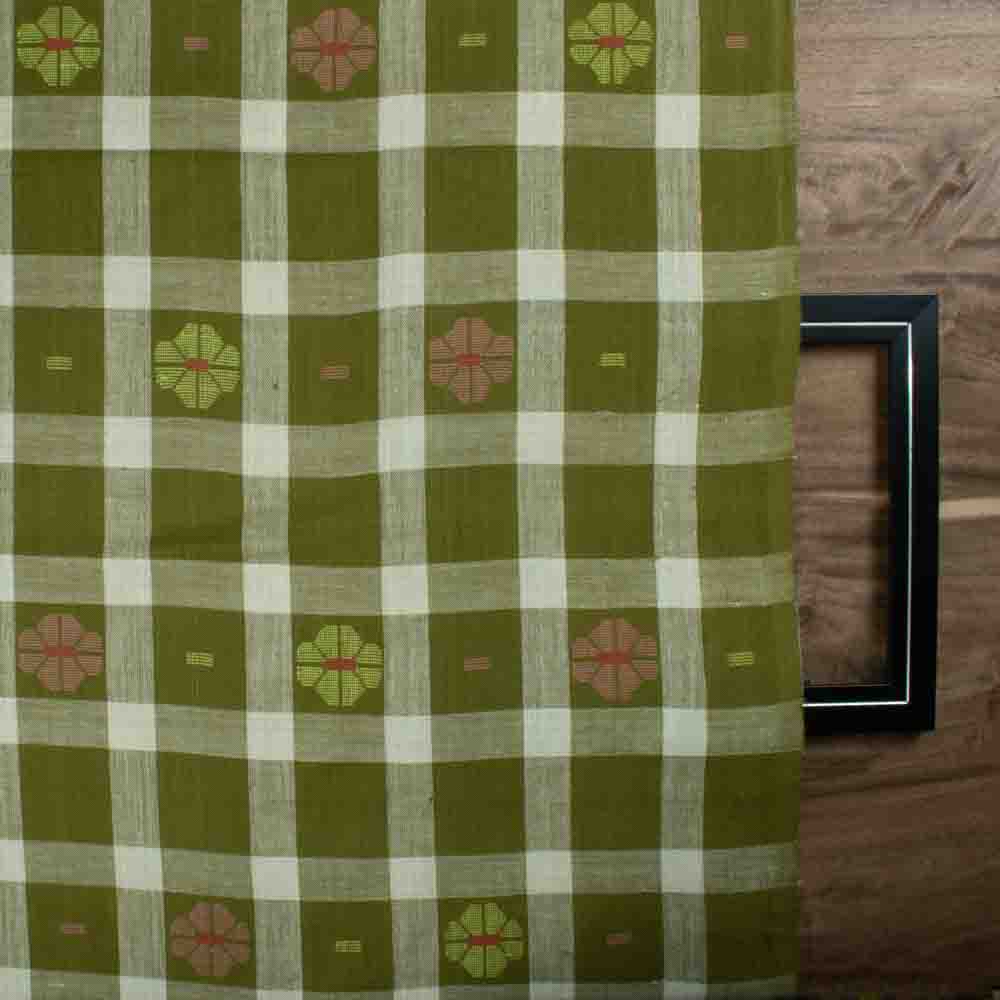 Crafted for ethical and sustainable designers, this Jamdani Fabric in Olive and Cream blends intricate check patterns with the finesse of pure cotton warp and weft. Weighing just 120 GSM, it offers a soft, breathable, and durable finish. Its airy lightness and artisanal texture make it ideal for lightweight curtains, blouses, dresses, flowy scarves, and kidswear, embodying both charm and conscious craftsmanship.