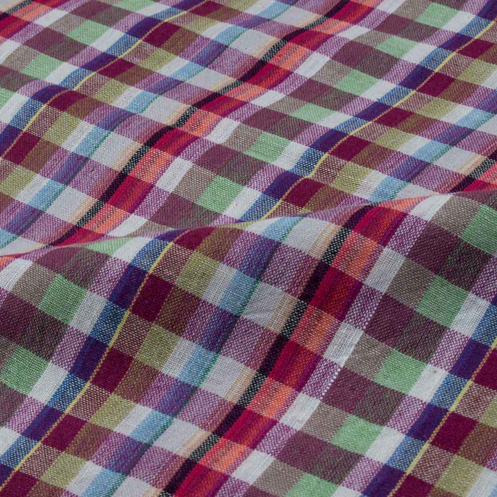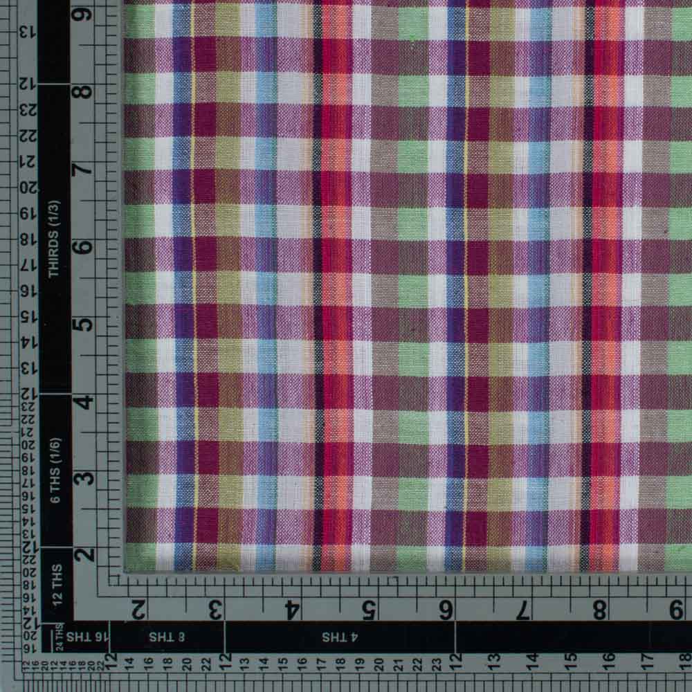 This Multicolour Check Cotton & Khadi Blend 120 GSM Handwoven Fabric brings together the breathability of cotton and the textured charm of khadi. Featuring a lively palette of green, red, purple and white checks, it adds subtle colour and structure to casual and semi formal wear. The medium light 120 GSM weight offers a smooth drape with gentle firmness, making it perfect for shirts, dresses, kurtas, co ord sets, tops and kidswear.