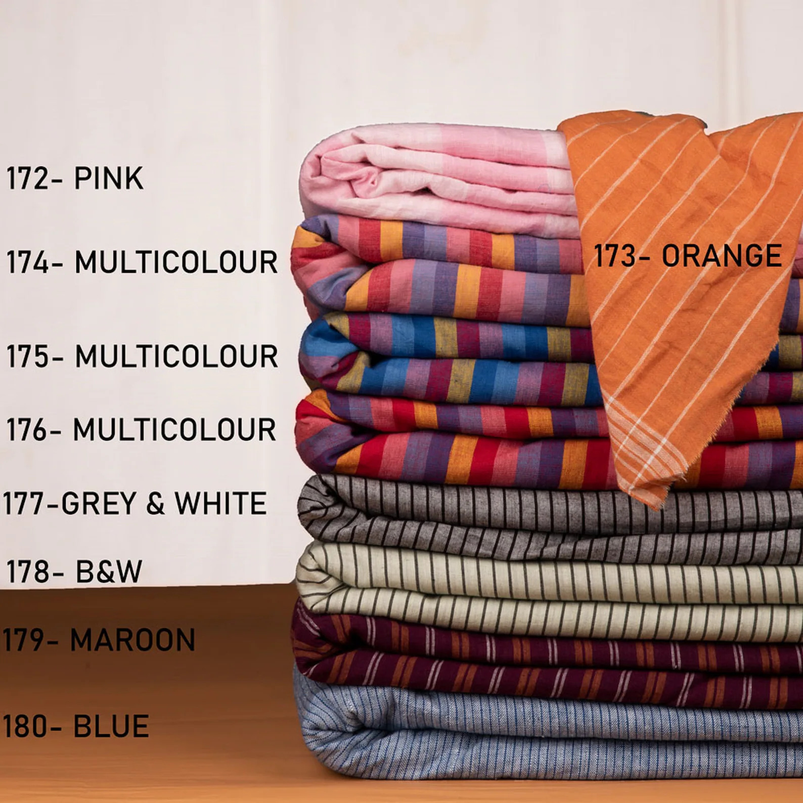 This stripe fabric in pure cotton is handwoven with alternating bands of red, orange, mustard, and violet, creating a bold, vibrant aesthetic that celebrates traditional weaving with a modern twist. Crafted from 100% natural cotton yarns, it is lightweight at 86 GSM, offering an airy, breathable, and soft texture that ensures comfort in warm climates. Its smooth drape makes it versatile for summer dresses, casual shirts, blouses, scarves, and kidswear, while its striking multicolour stripes add character to home décor items such as sheer curtains or cushion covers.