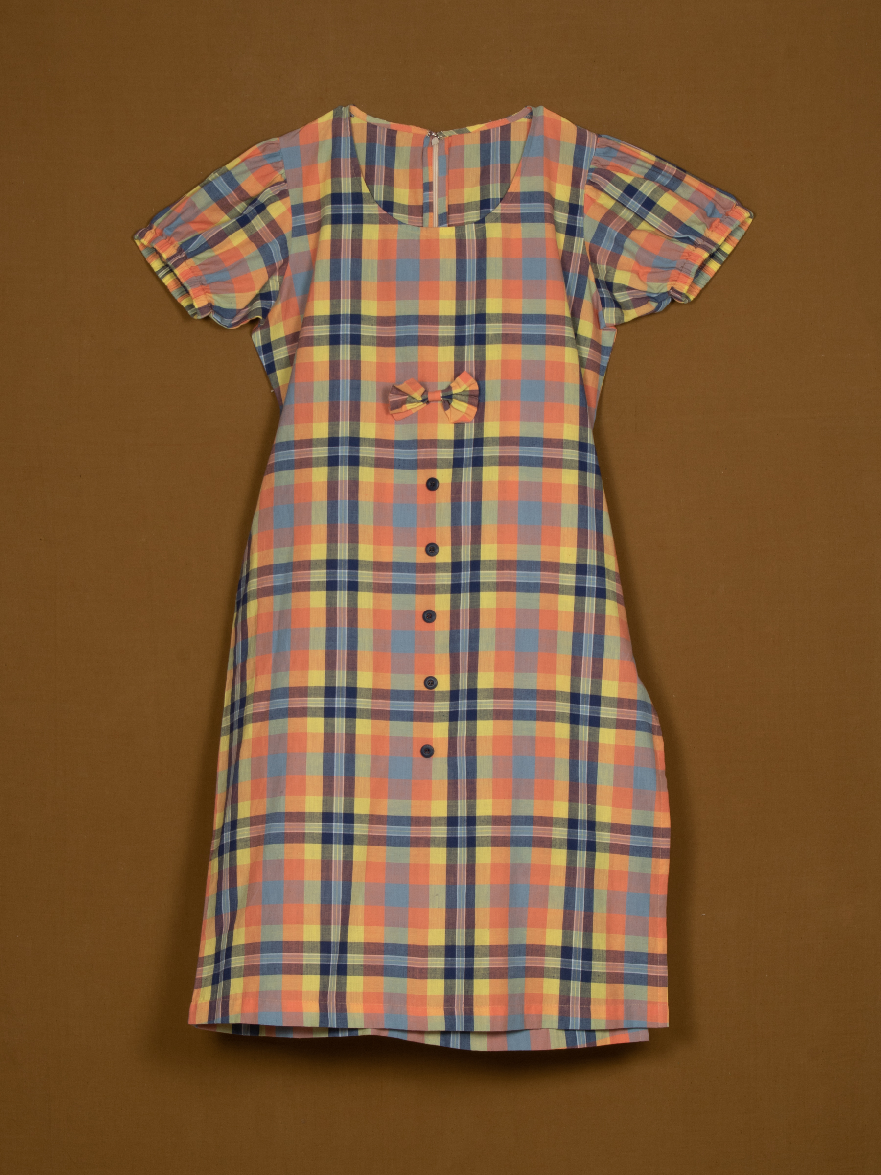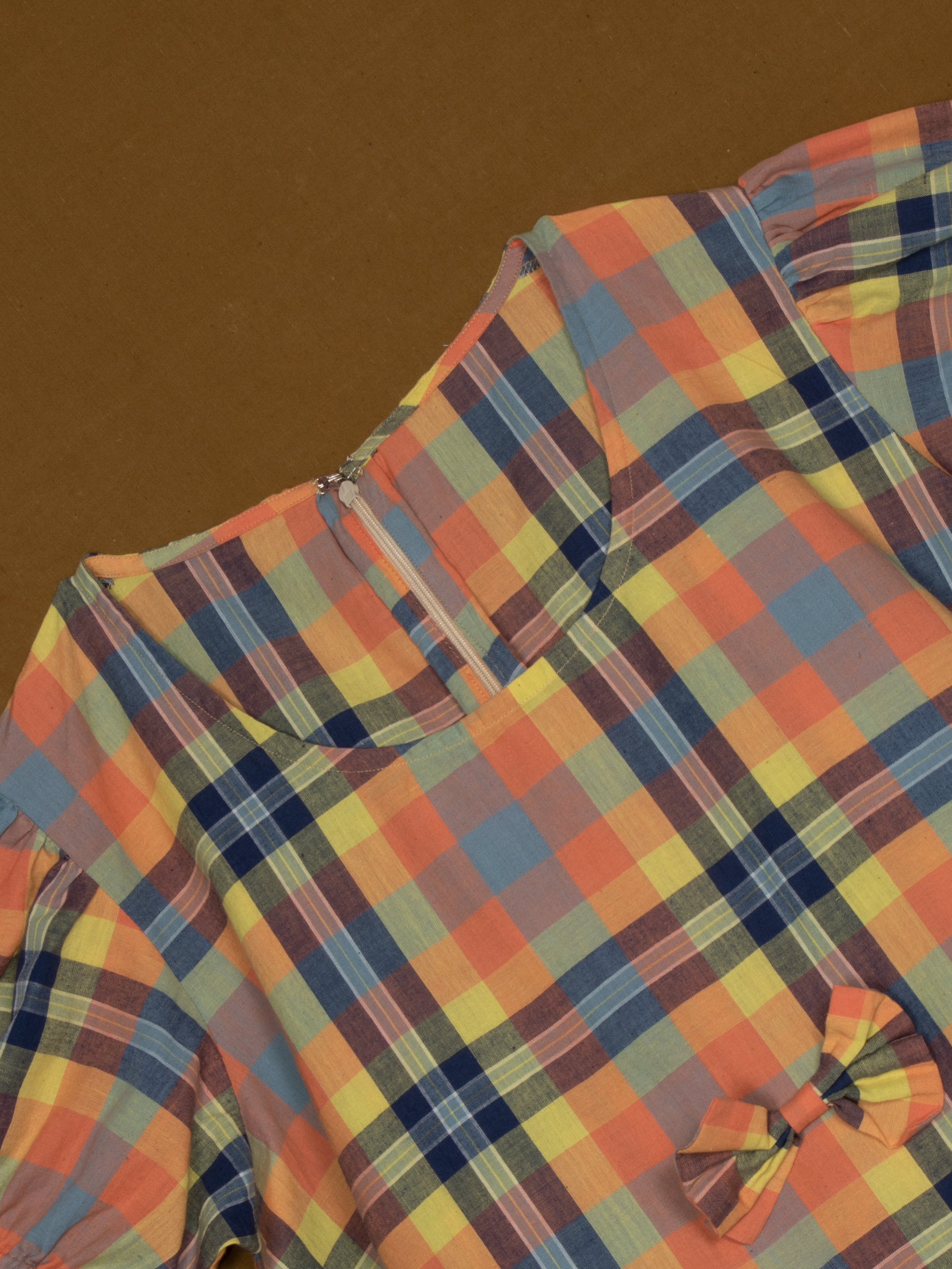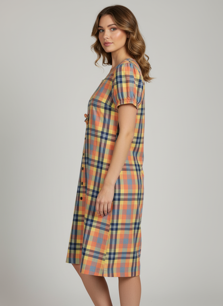 Charming and playful, this Bow-Tie Fishtail Balloon Sleeve Dress adds a lively touch to women’s dresses. Designed in a colorful check pattern, it features short balloon sleeves, a front bow-tie detail, and a neat fishtail-inspired cut for added flair. Soft and breathable, it’s perfect for casual gatherings or daytime outings.