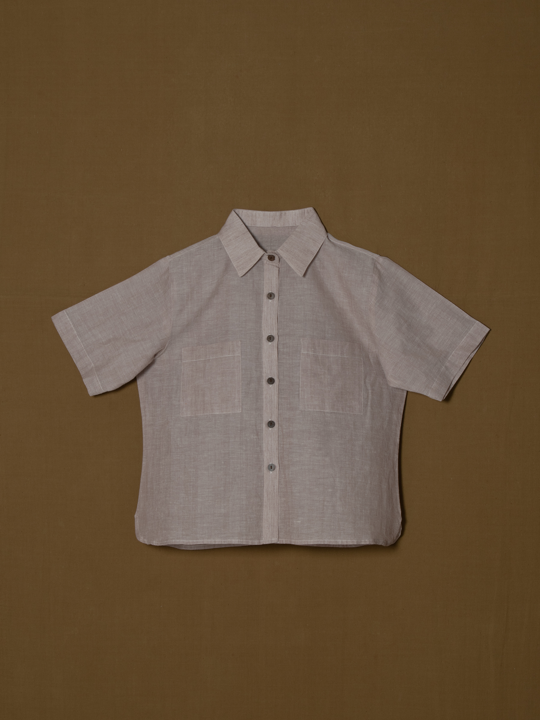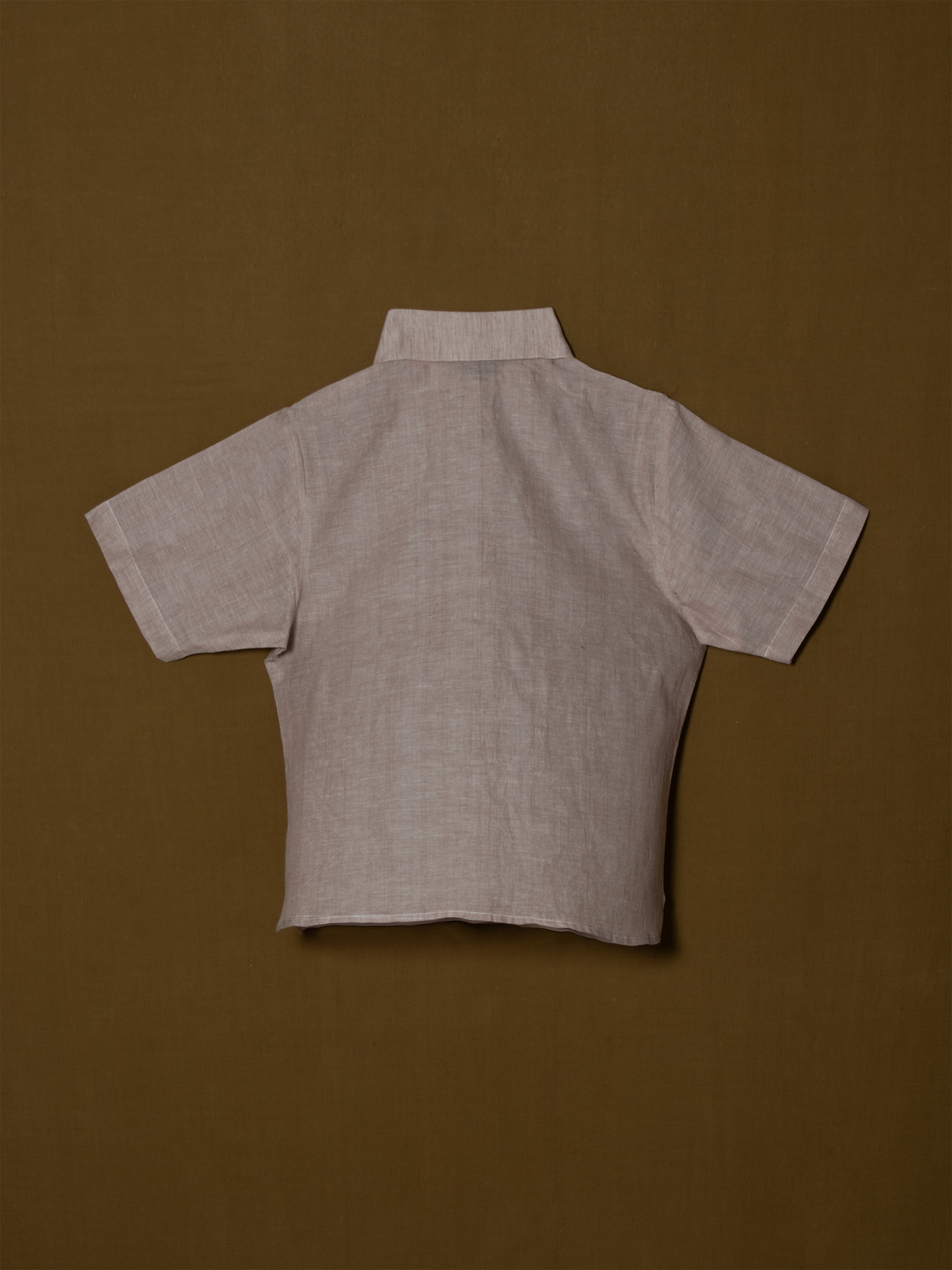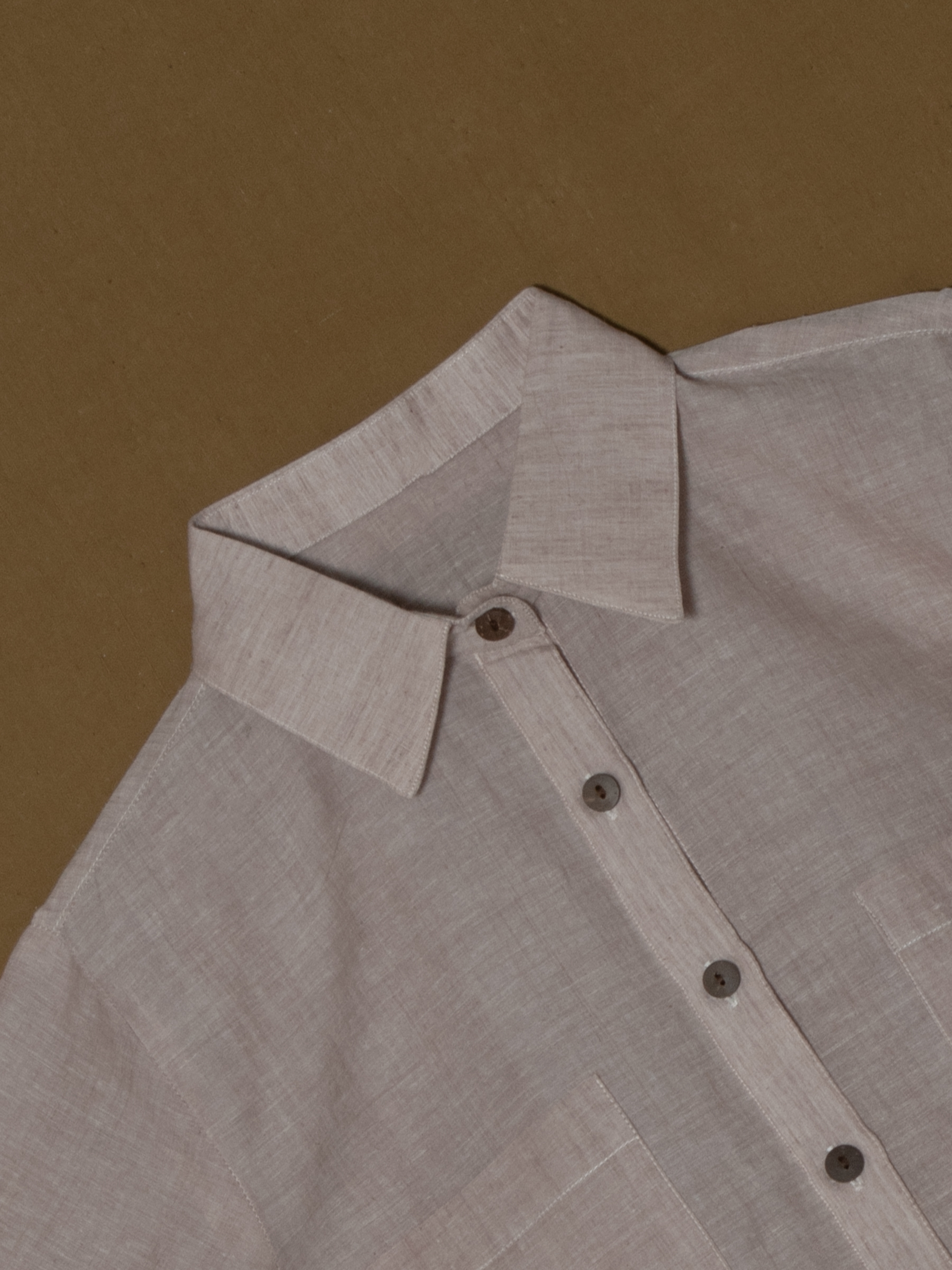 Soft blush tone with structured collar and button-down placket.