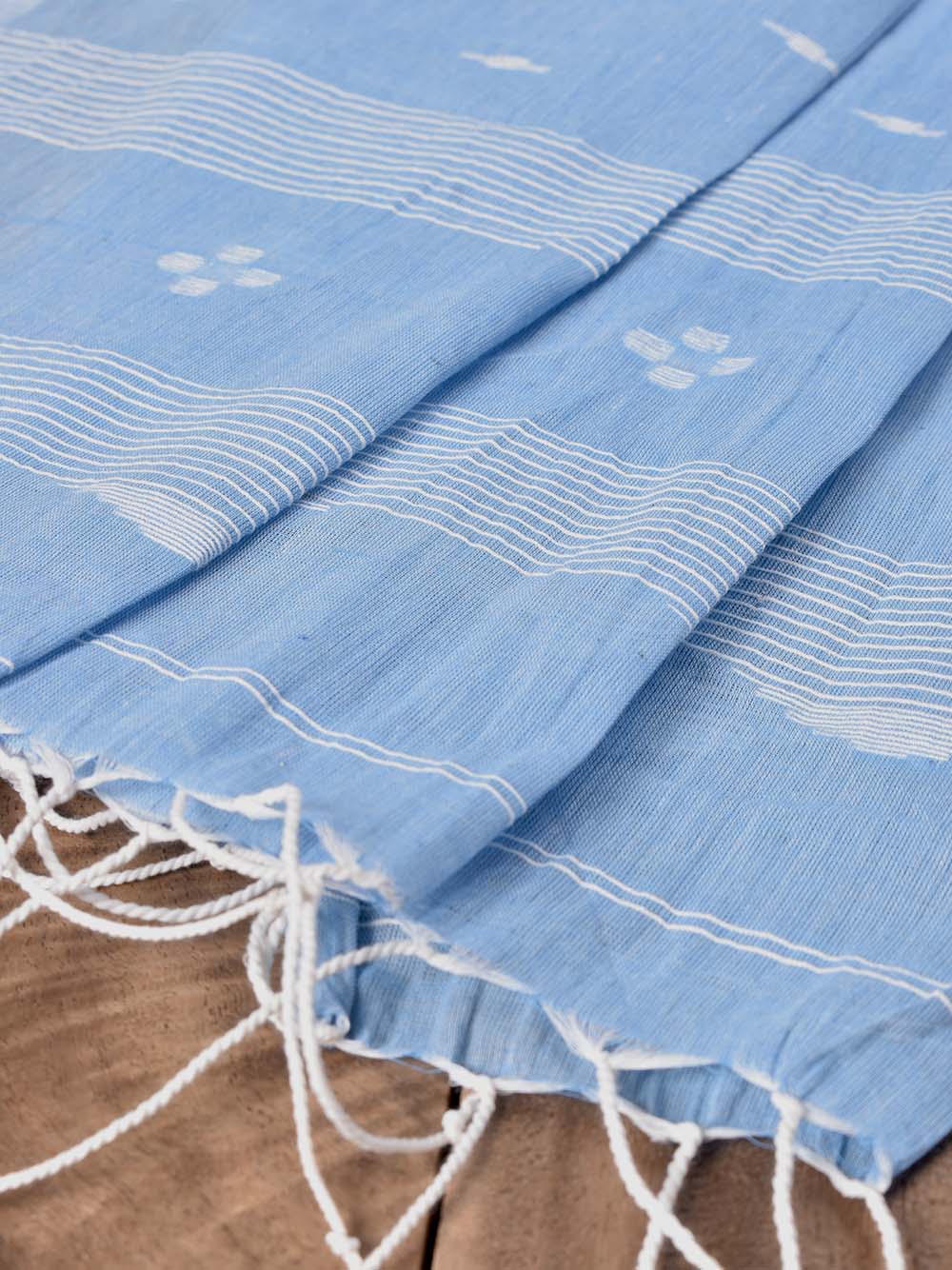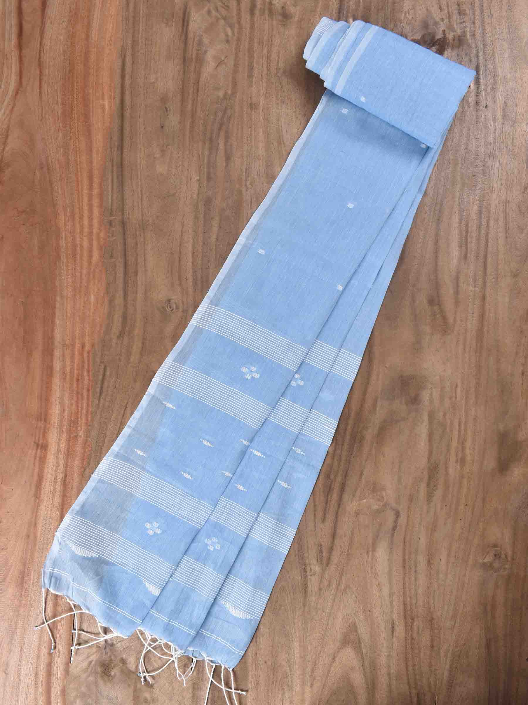 This exquisite sky scarf features delicate geometric motifs, intricately handwoven using the traditional Jamdani extra-weft technique on pure cotton fabric. Its soft blue hue and subtle stripe accents make it a versatile accessory for pairing with women’s casual shirts, blouses, dresses, and other warm-weather outfits.