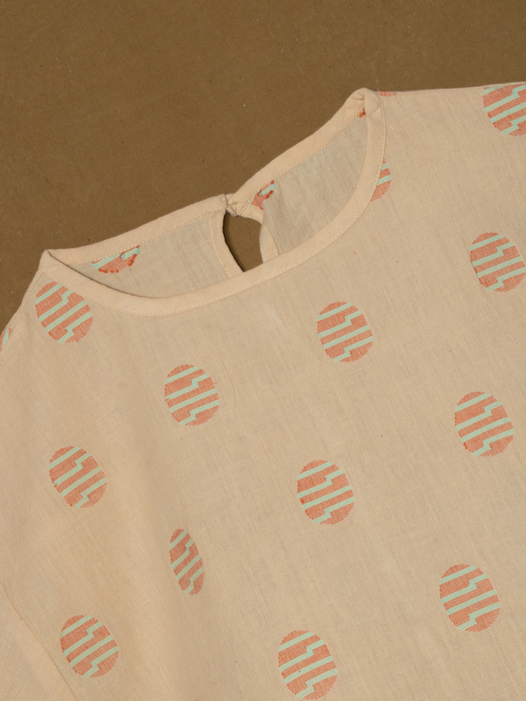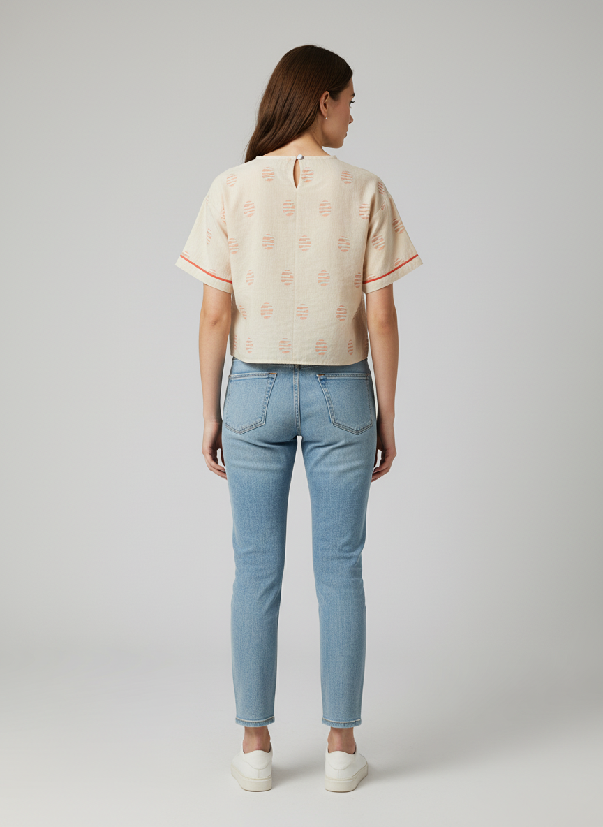 Handwoven for comfort and charm, the Jamdani crop top is the perfect women's casual top to elevate everyday dressing. Designed with subtle Jamdani motifs and a relaxed silhouette, it pairs effortlessly with skirts, trousers, or jeans for a modern yet artisanal look. The short sleeves and airy weave make it ideal for all-day wear, combining tradition with contemporary ease.