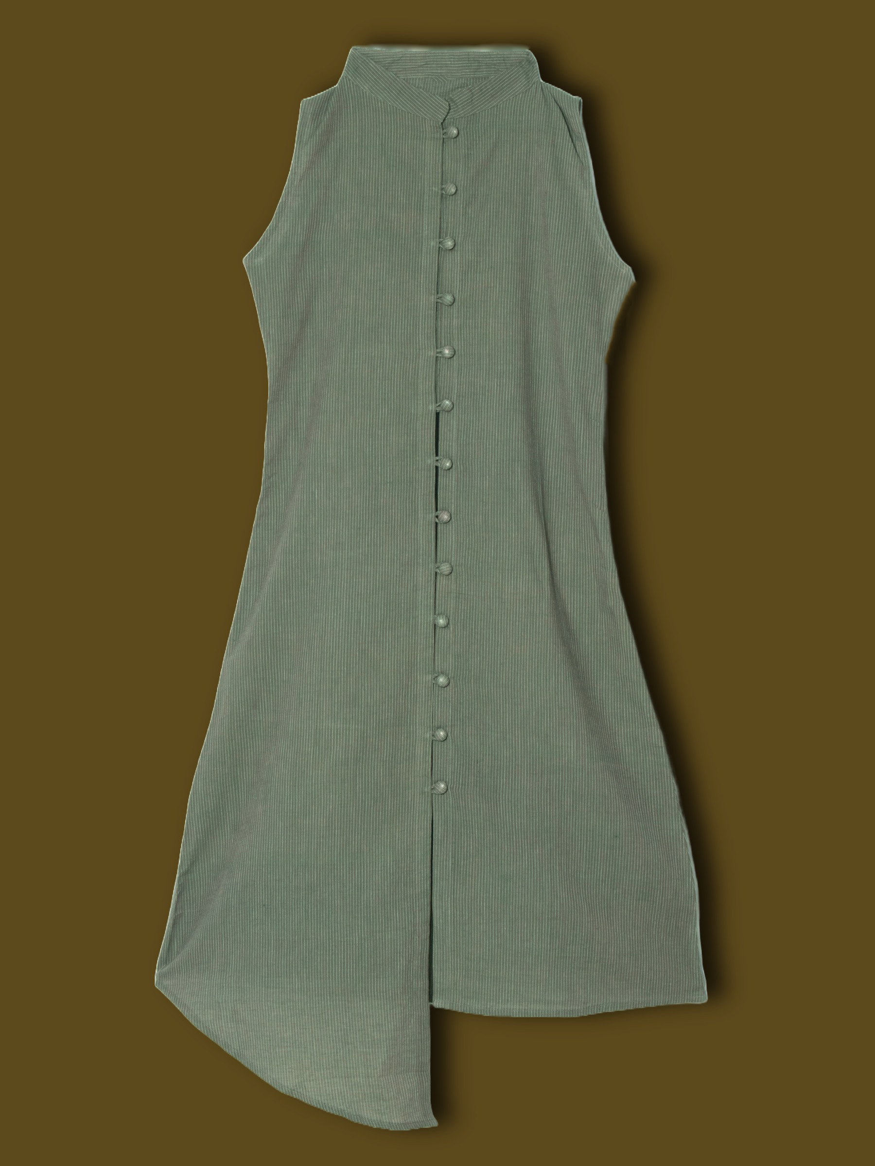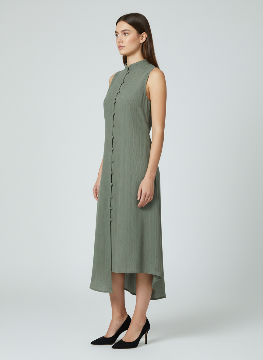 Sleek and minimal, this Mandarin Collar Dress brings modern sophistication to women’s dresses. Designed in a muted green tone with a button-down front, it combines clean structure with everyday comfort. The sleeveless cut and soft drape make it a versatile choice for both casual outings and semi-formal occasions.
