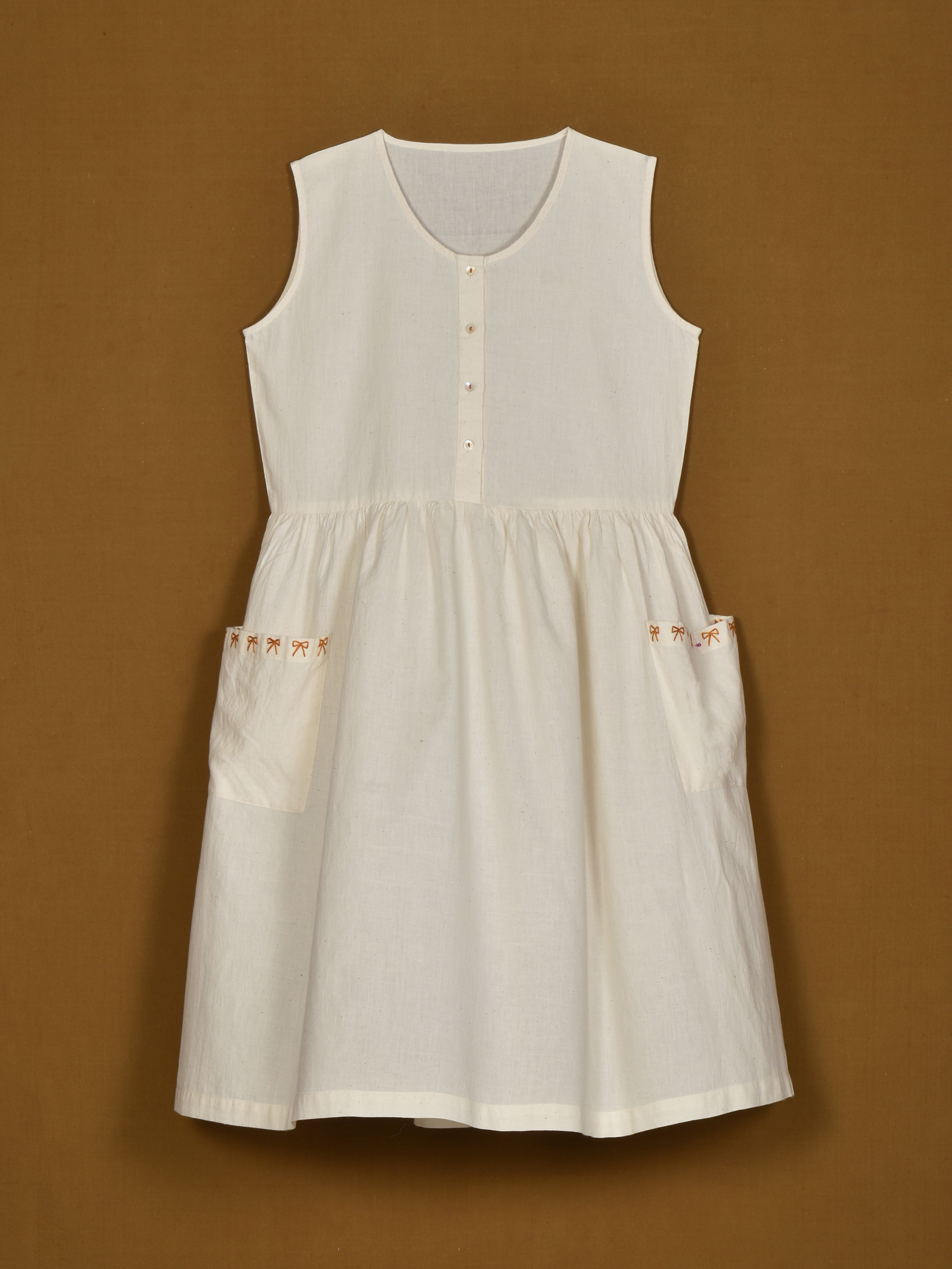 A graceful addition to the world of women's dresses, this midi dress blends charm with utility. Designed with soft pleats and delicate embroidered bows, it is perfect for everyday comfort with a touch of elegance.