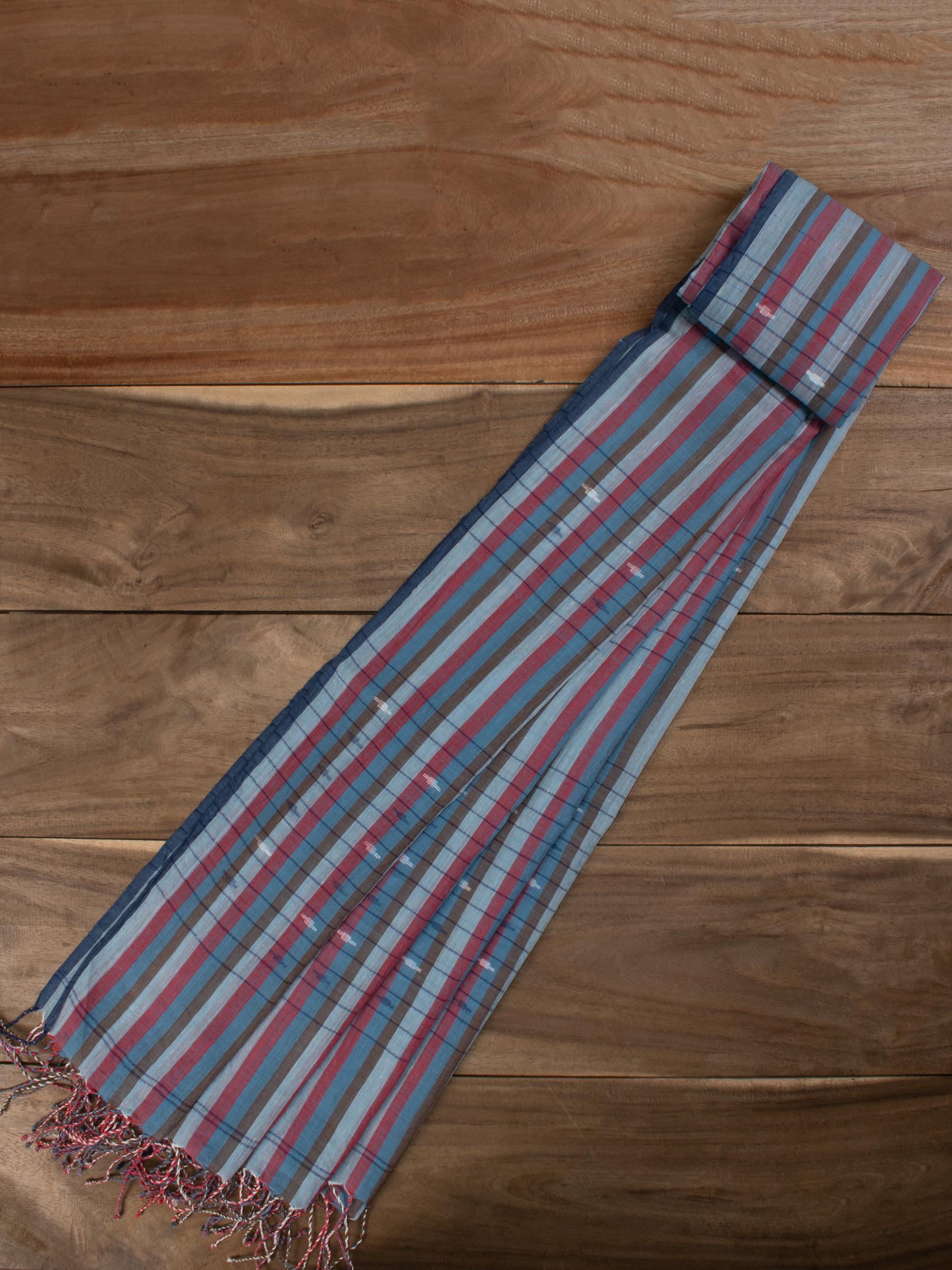 This vibrant multicolour scarf showcases the artistry of Jamdani weaving, featuring alternating stripes in bold hues of blue, red, and black, accented with delicate white geometric motifs. Handwoven from pure cotton, the scarf carries a lightweight, breathable texture that makes it a versatile accessory for pairing with casual shirts, blouses, dresses, or even layering over summer outfits for a pop of artisanal charm.
