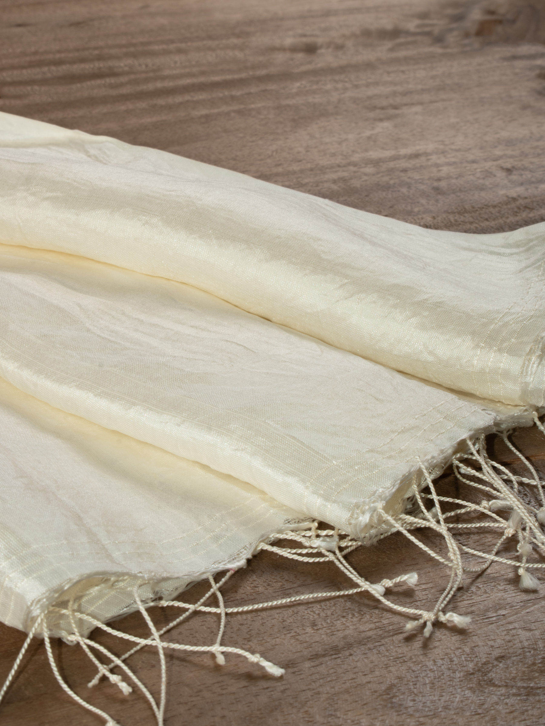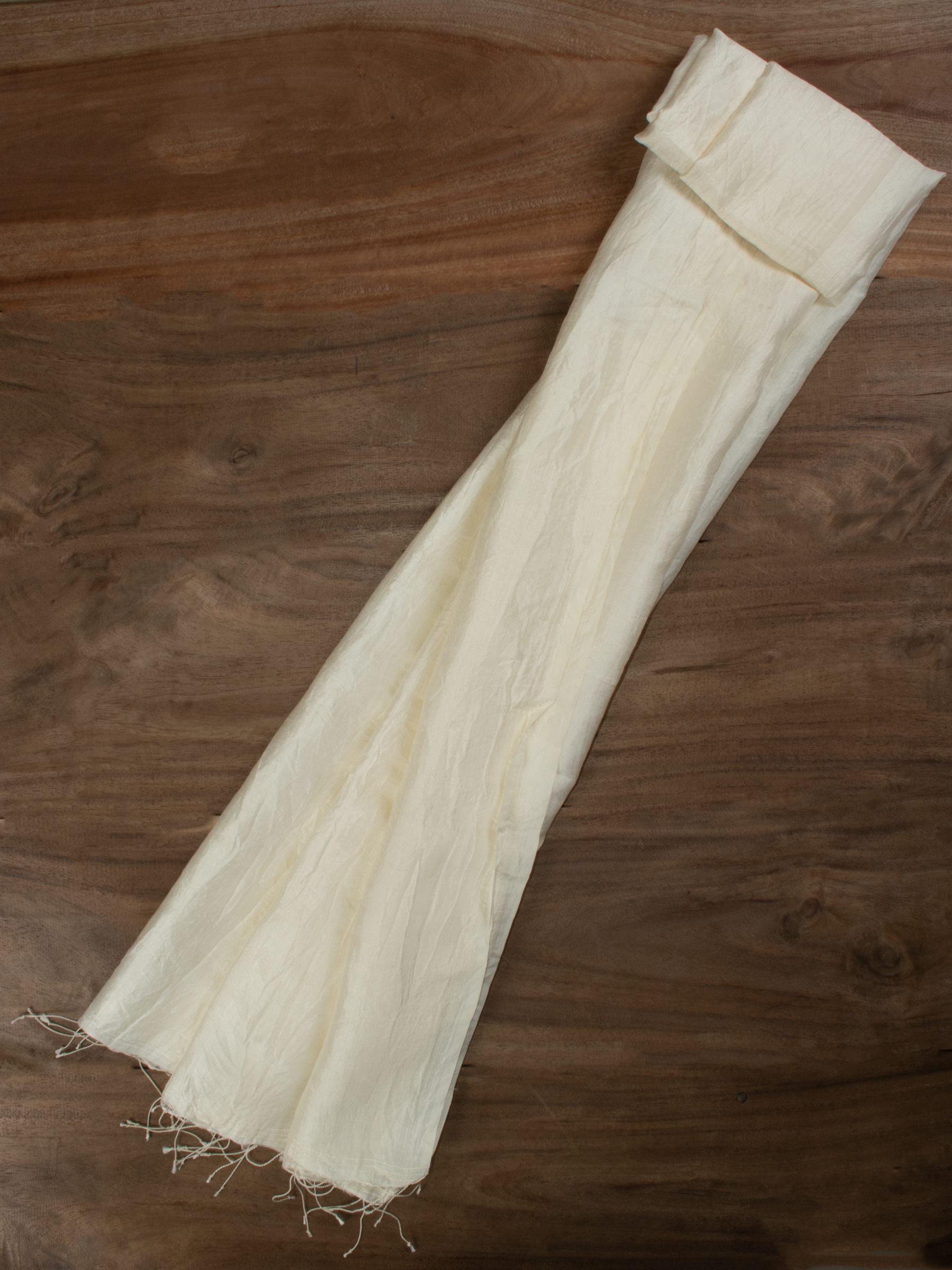 This natural white scarf is handwoven from pure mulberry silk, offering a soft, lustrous texture that drapes elegantly. Lightweight and breathable, it adds timeless sophistication to any outfit while reflecting sustainable, artisan-crafted luxury rooted in traditional weaving heritage.