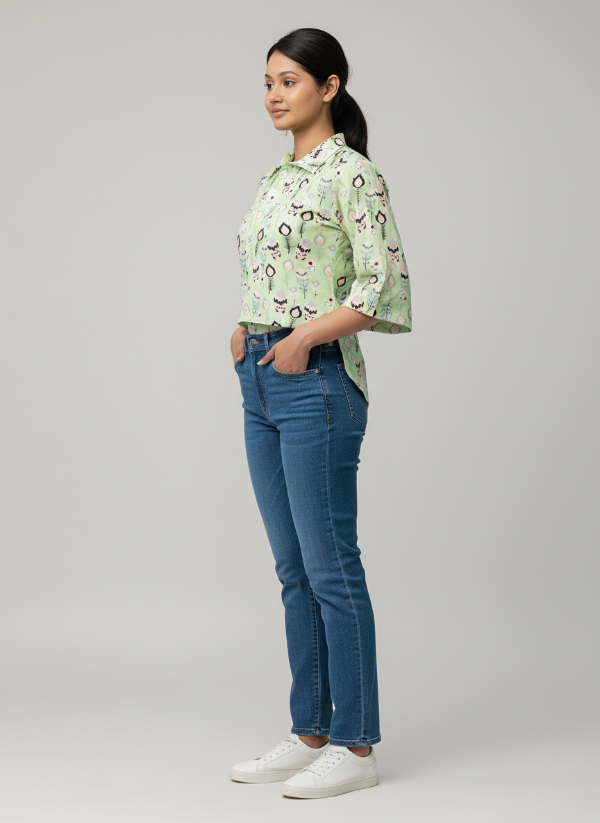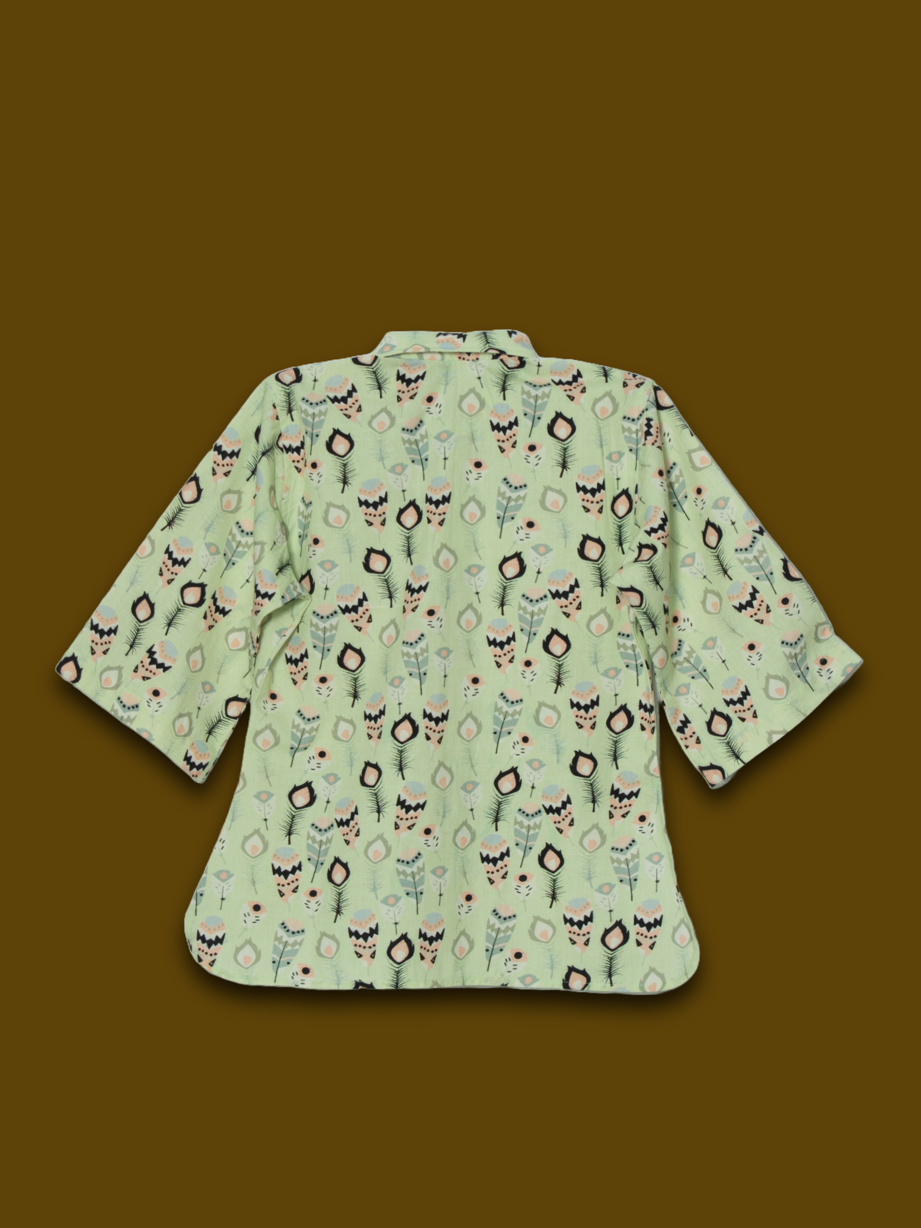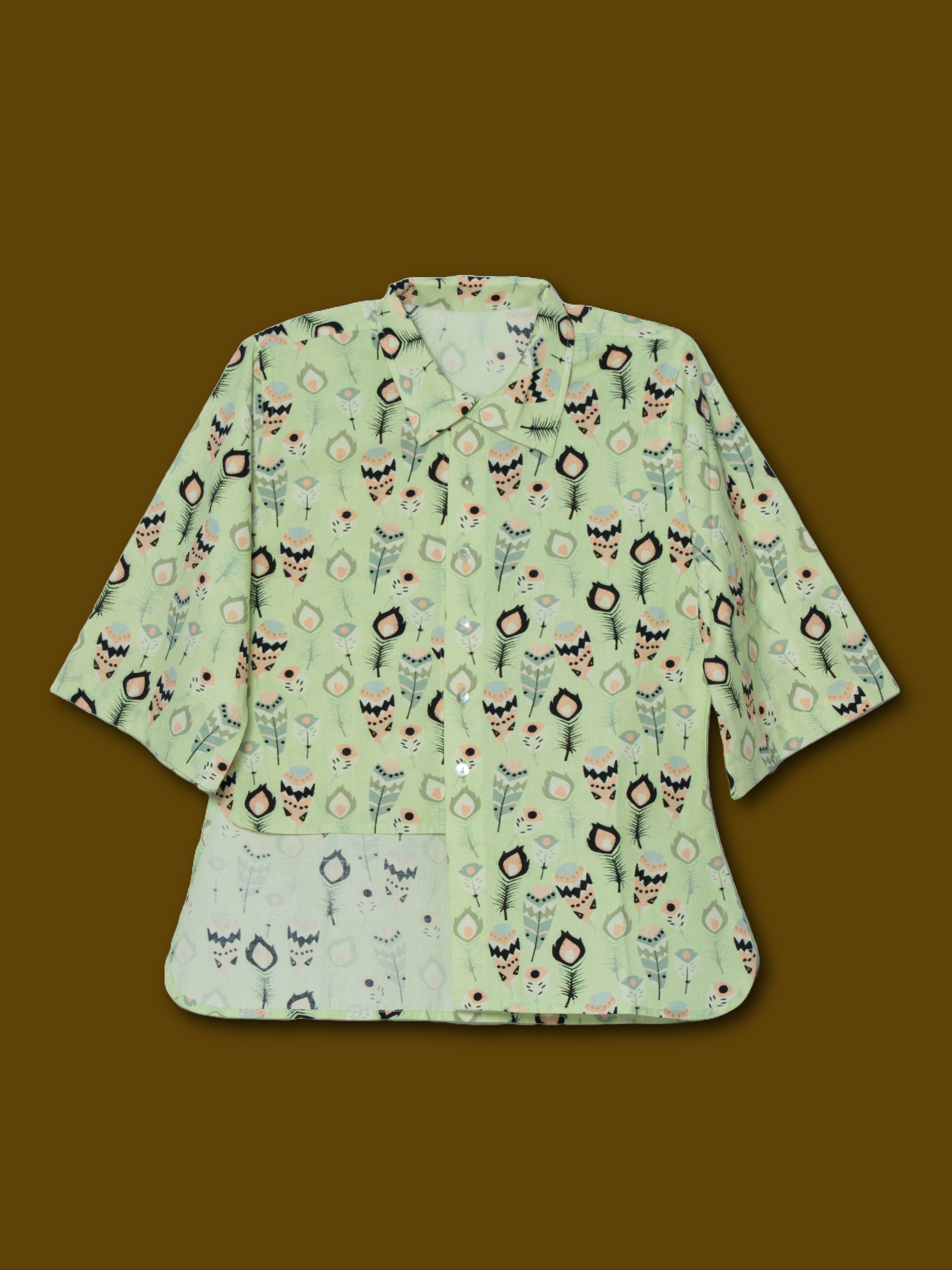 Playful yet polished, this One Sided Long Shirt brings a fresh twist to the classic collared shirt. Designed in a soft green base with whimsical prints, it features a center buttoned placket, relaxed bell sleeves, and an asymmetrical hemline for added flair. Perfect for casual outings or statement layering.