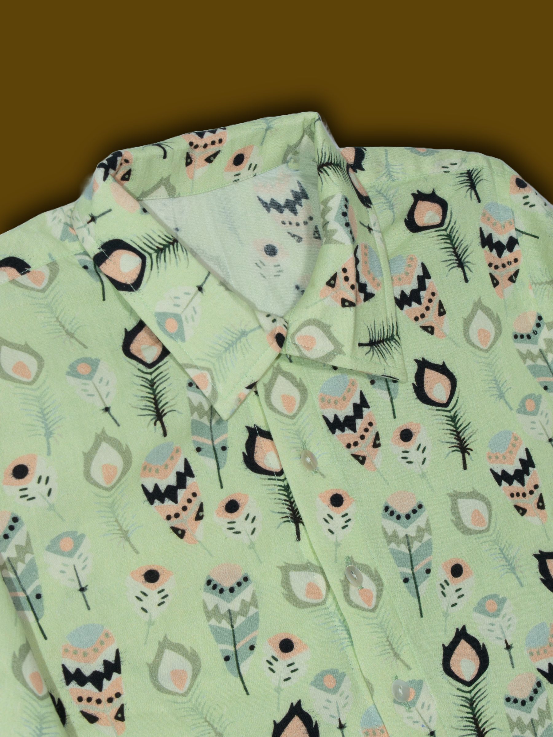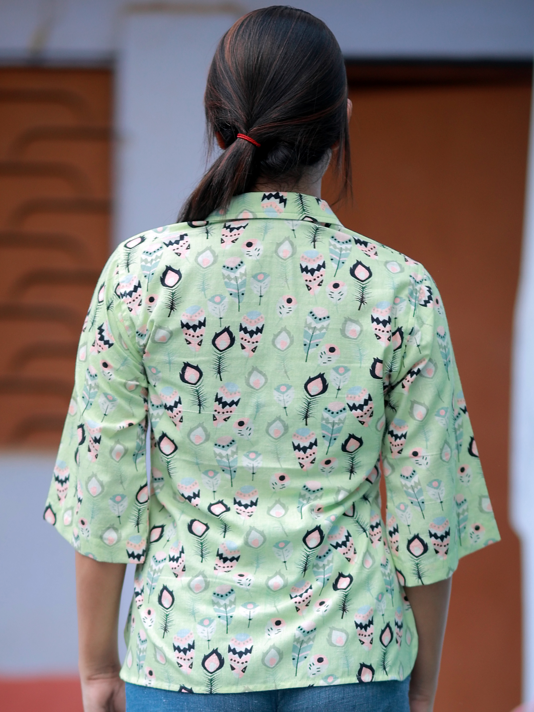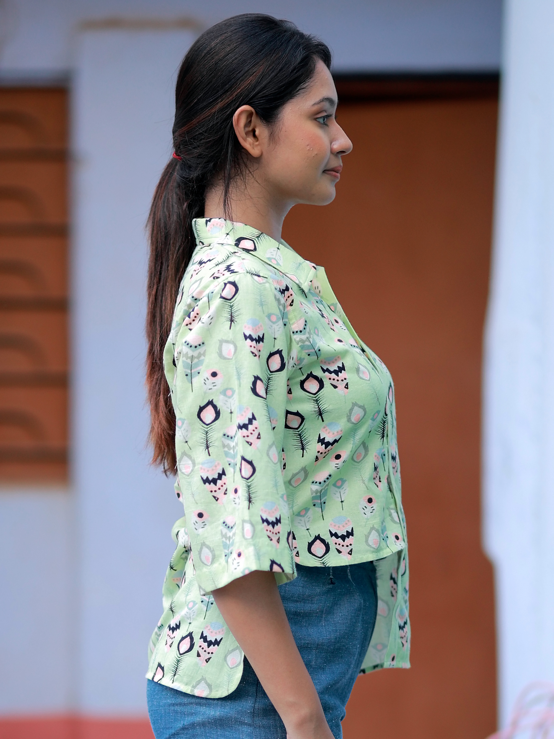 Playful yet polished, this One Sided Long Shirt brings a fresh twist to the classic collared shirt. Designed in a soft green base with whimsical prints, it features a center buttoned placket, relaxed bell sleeves, and an asymmetrical hemline for added flair. Perfect for casual outings or statement layering.
