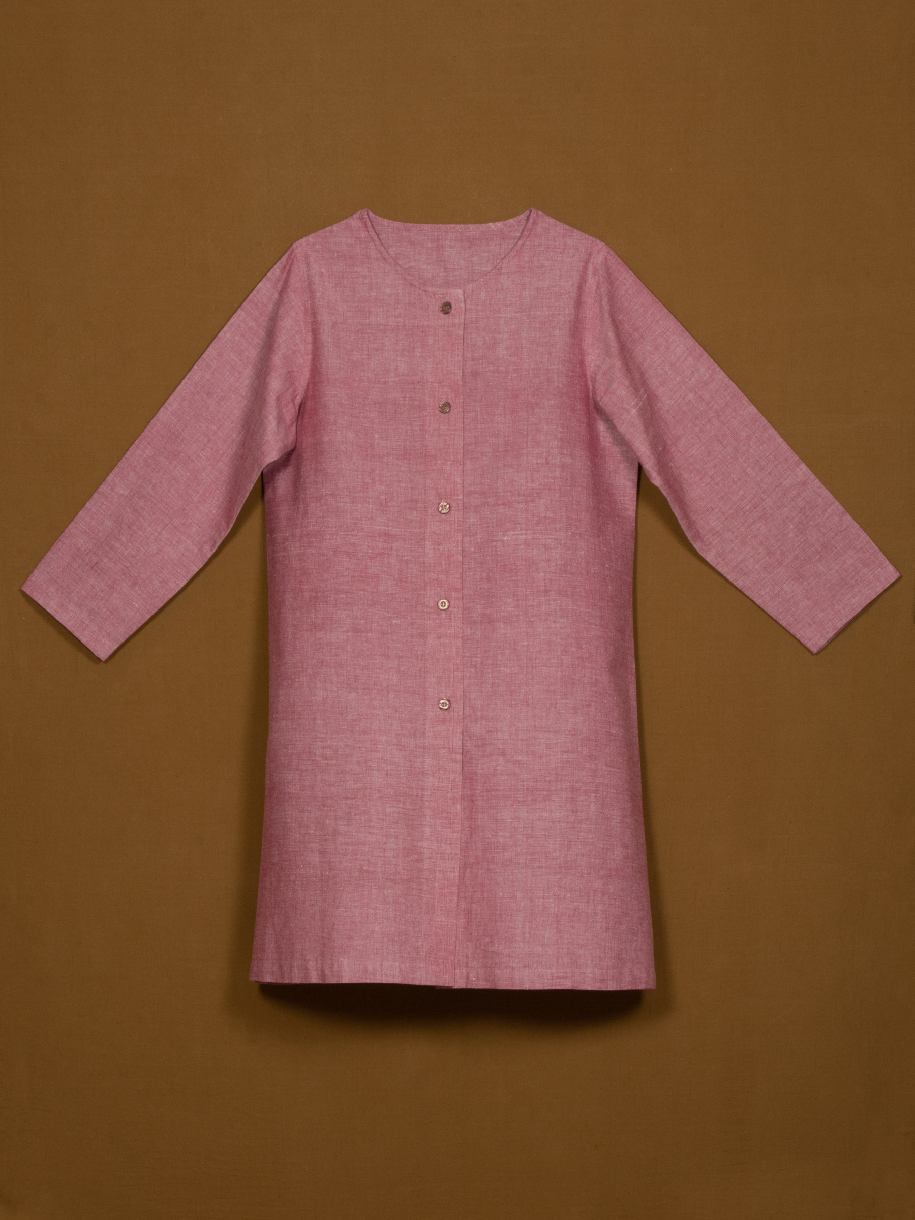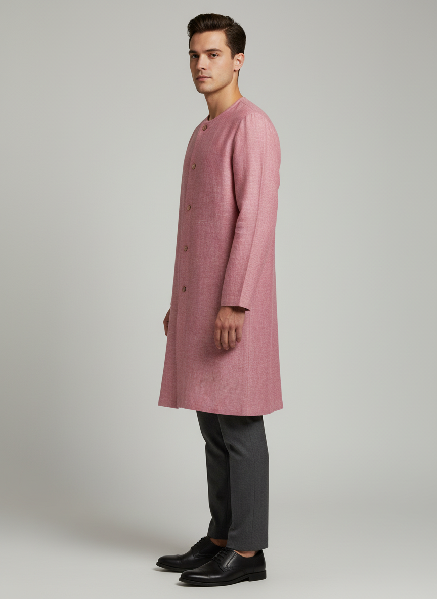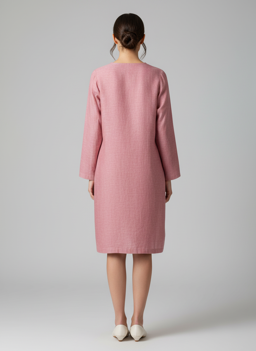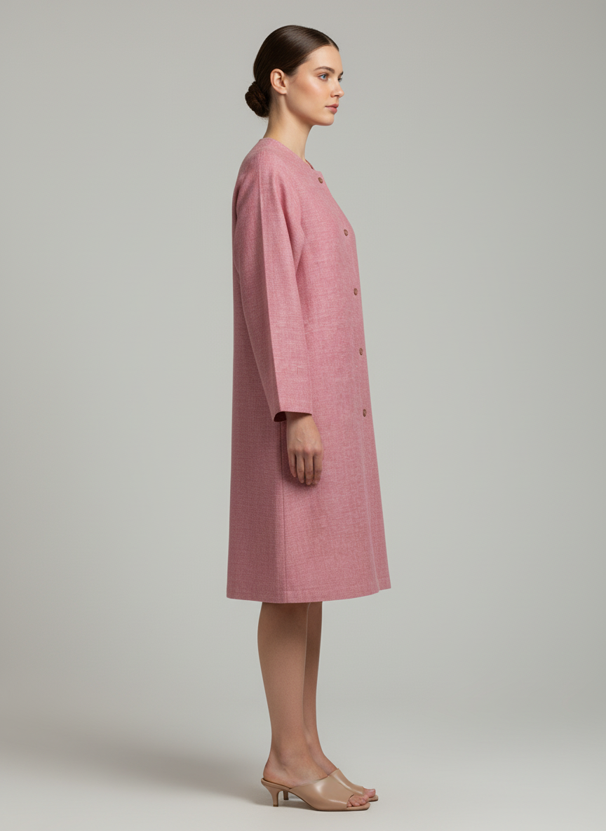 This minimalist design blends the ease of a knee-length coat with the sharp versatility of a unisex blazer. Featuring a continuous placket front, clean round neckline, and streamlined structure, it’s a timeless piece for modern sustainable wardrobes.