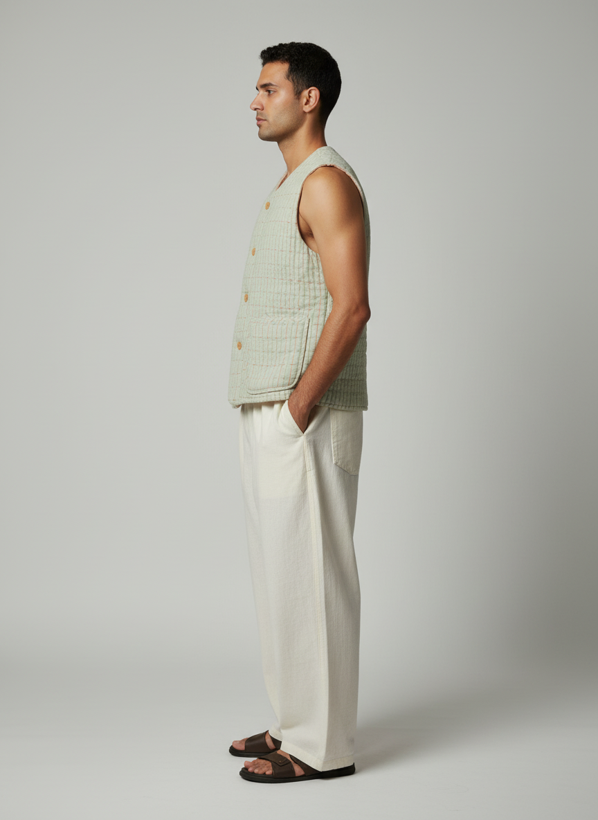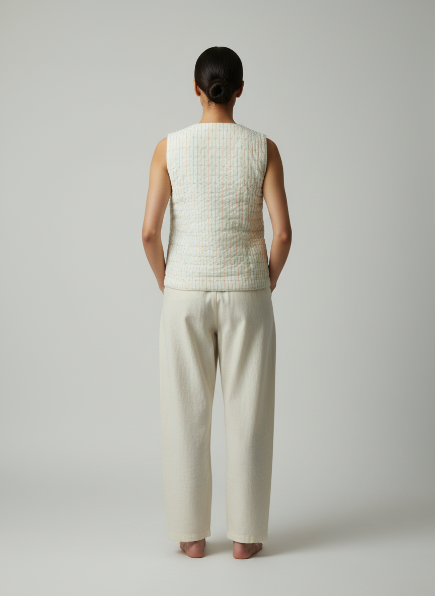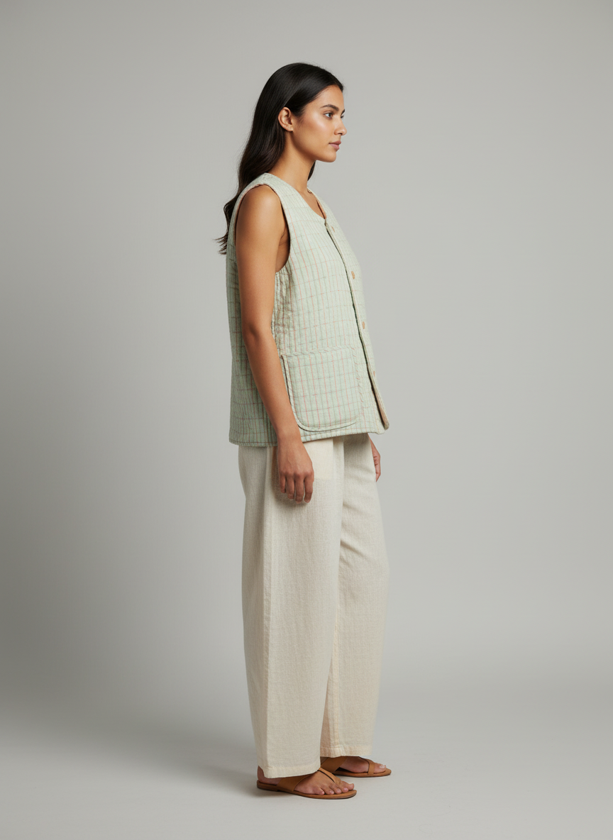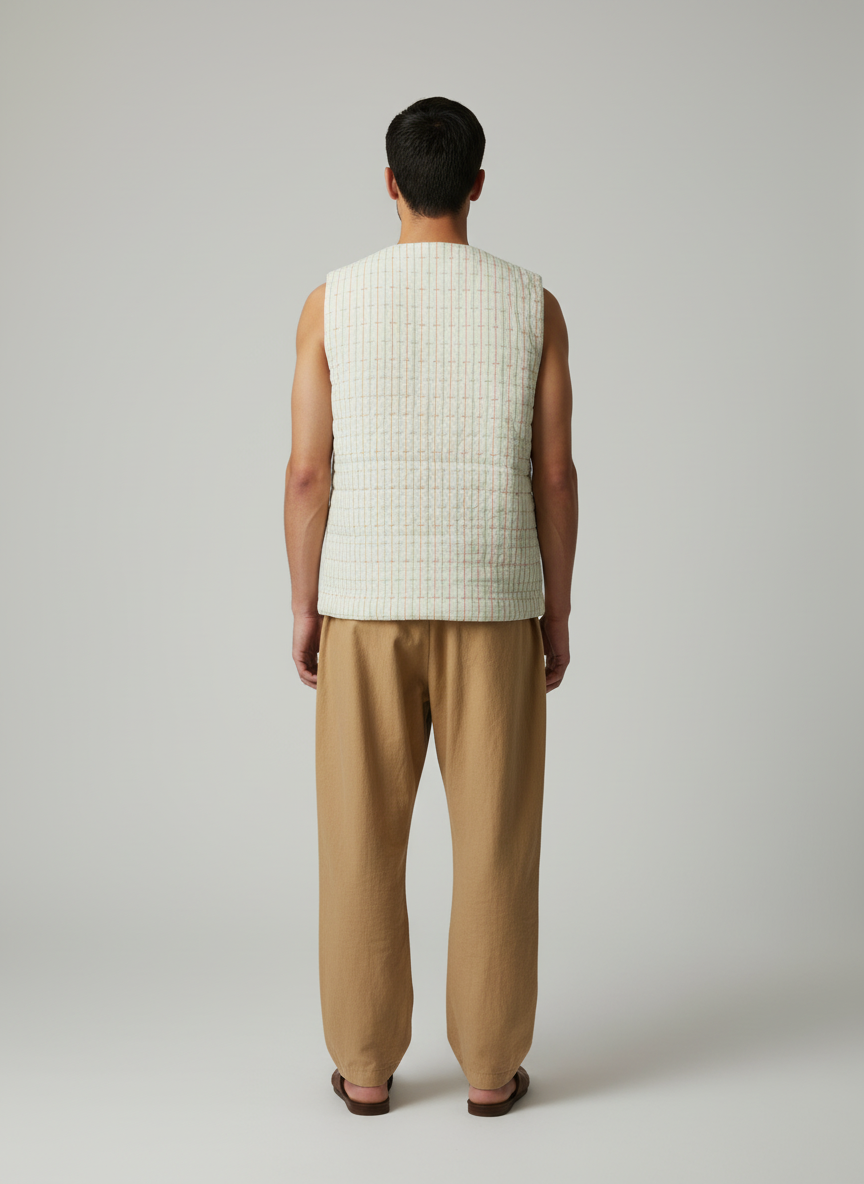 A versatile cotton vest designed for timeless layering, this piece blends comfort with understated style. With its round neck and regular fit, it is an easy essential for both casual and conscious wardrobes.
