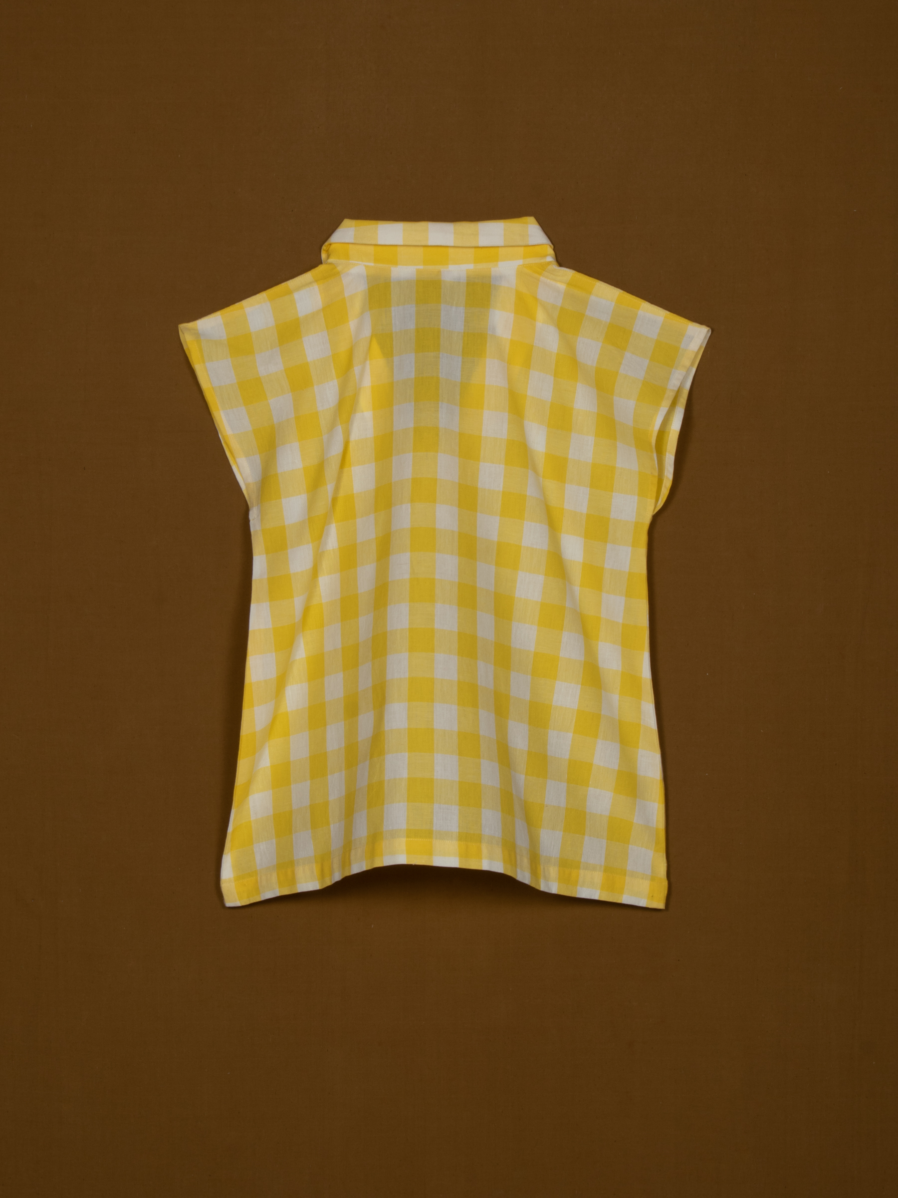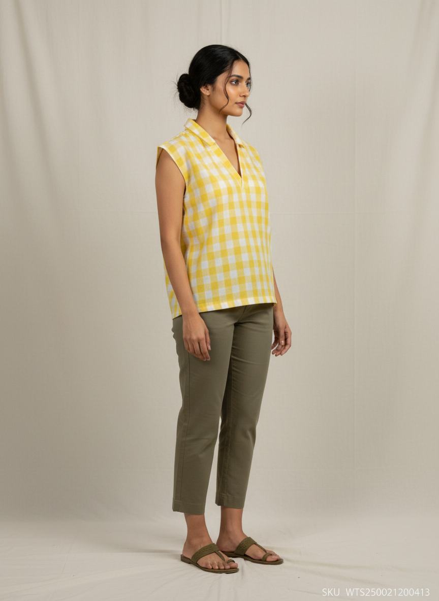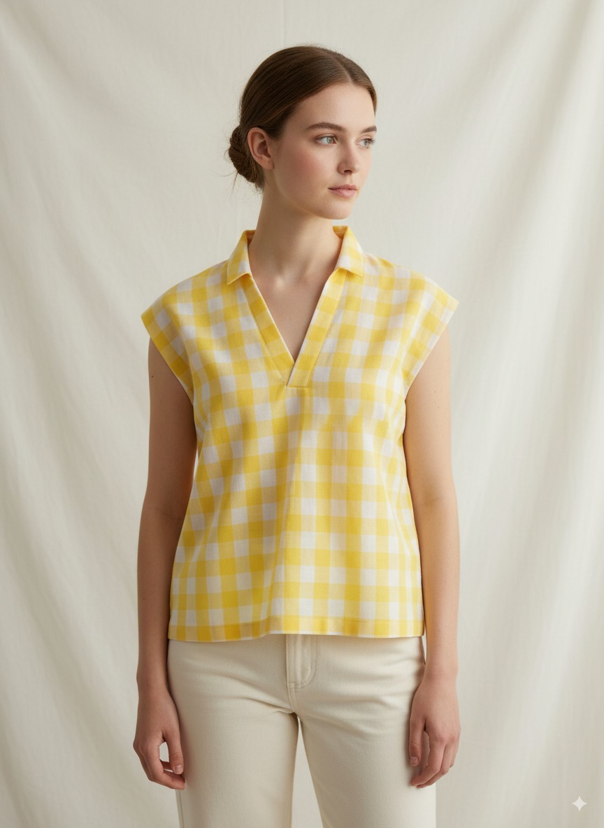 A refreshing take on women's tunic tops, this shirt-collar V-neck piece blends casual charm with timeless elegance. The breezy silhouette and vibrant check pattern make it versatile enough for laid-back outings, workdays, or weekend getaways, while its artisanal tailoring ensures comfort and sophistication in every detail.