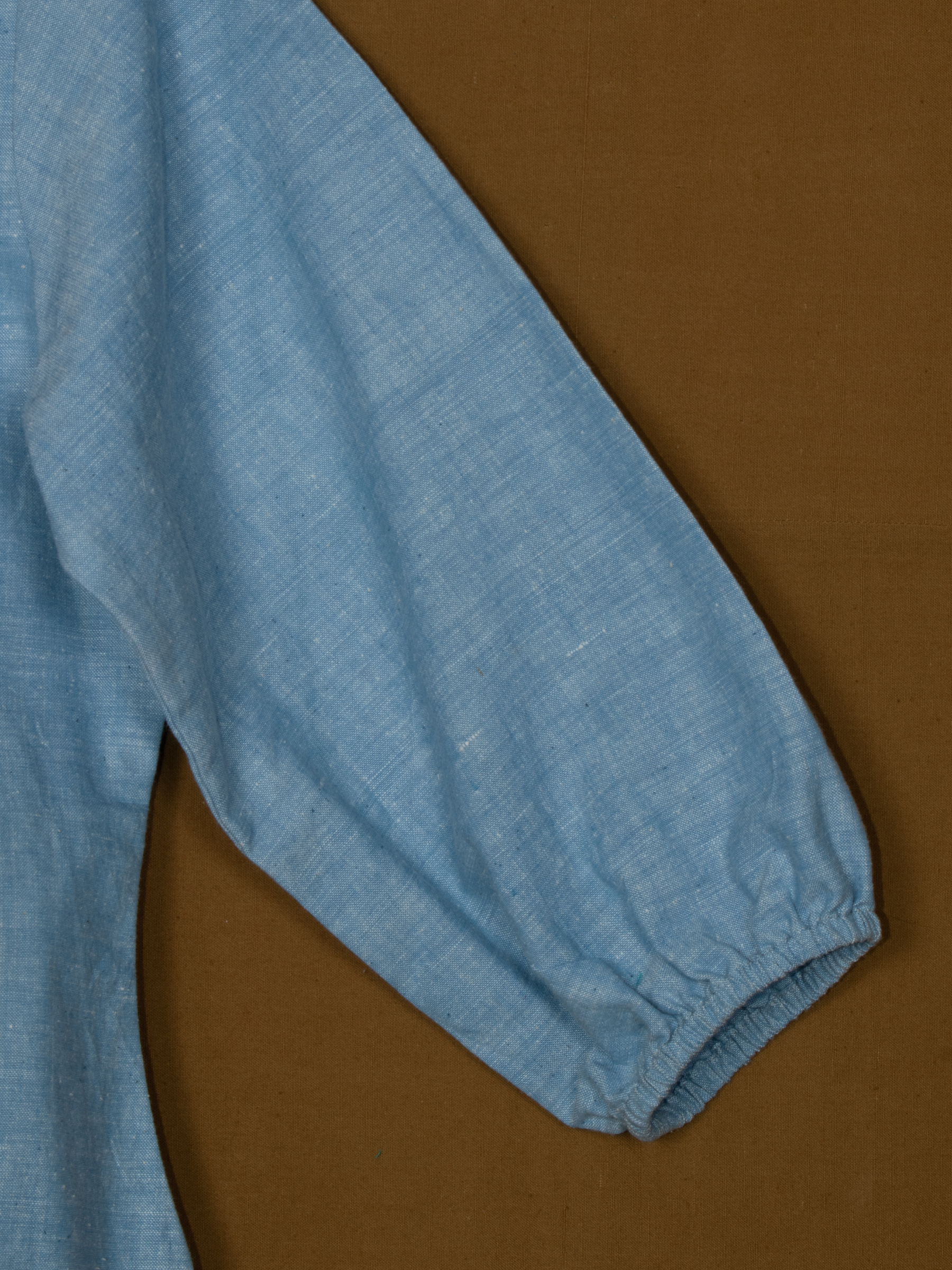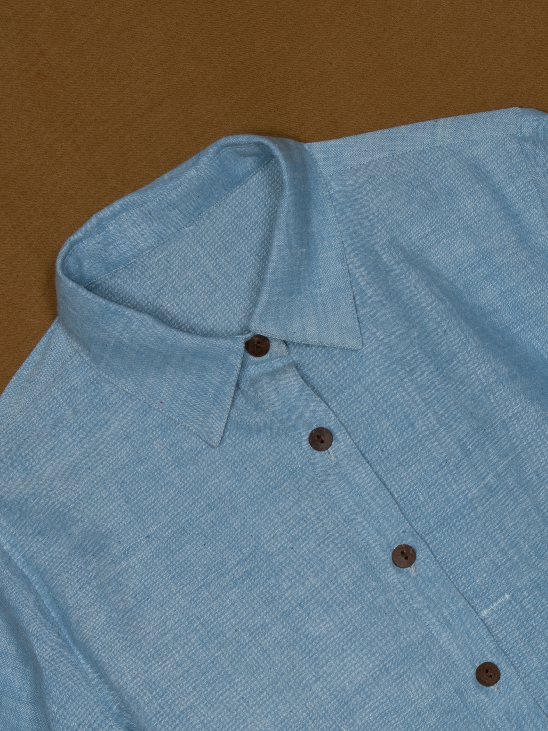 Soft blue shade with spread collar and button-down placket.