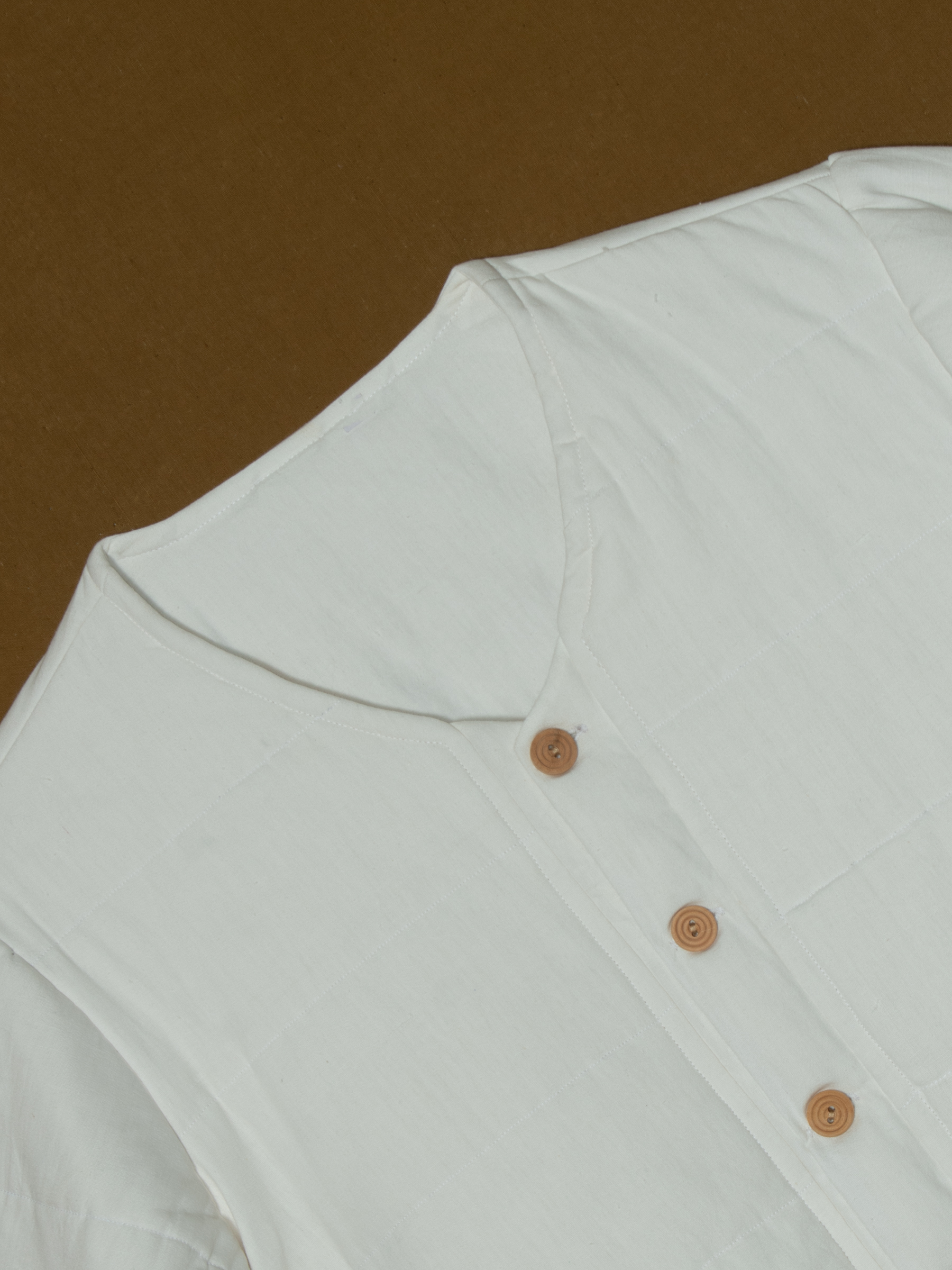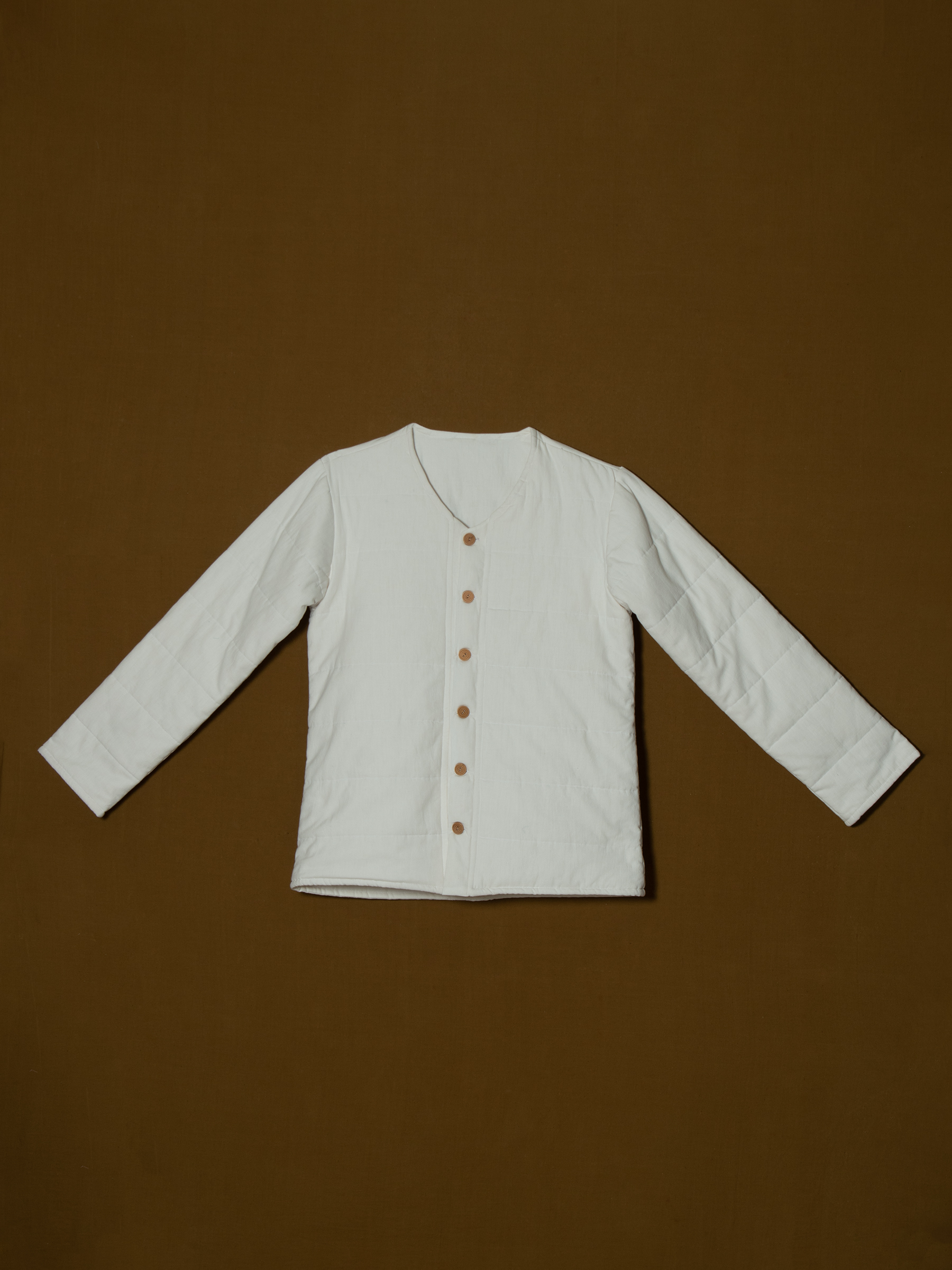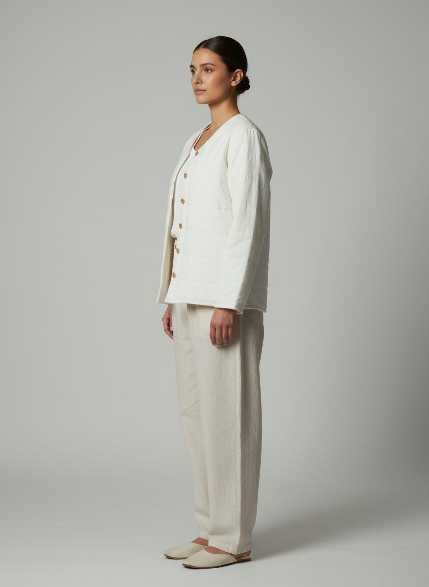 Drawing inspiration from the polished elegance of women's leather jackets, this structured V-cardigan offers a softer, sustainable alternative for winter layering. With its full sleeves, button-down front, and quilted batting for added warmth, it delivers both comfort and sophistication. Designed in breathable handwoven cotton, it’s a versatile piece for ethical wardrobes.