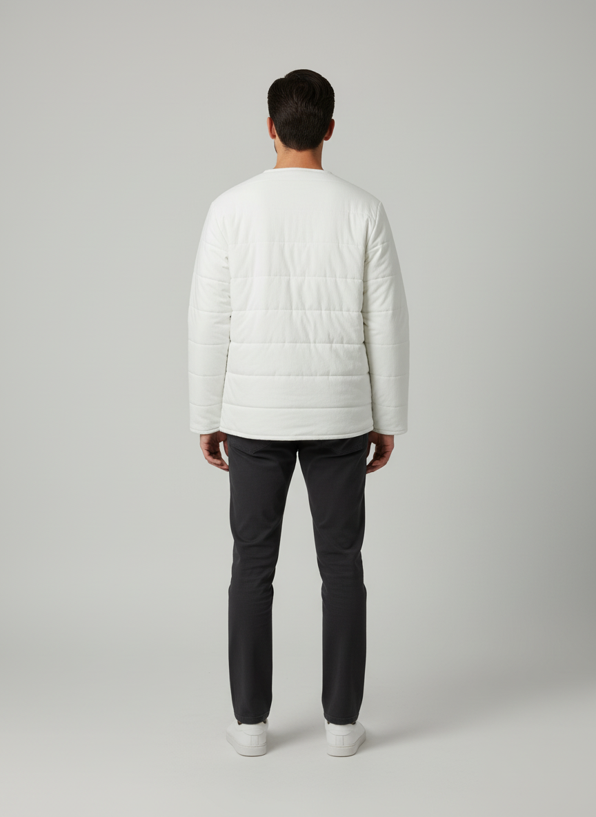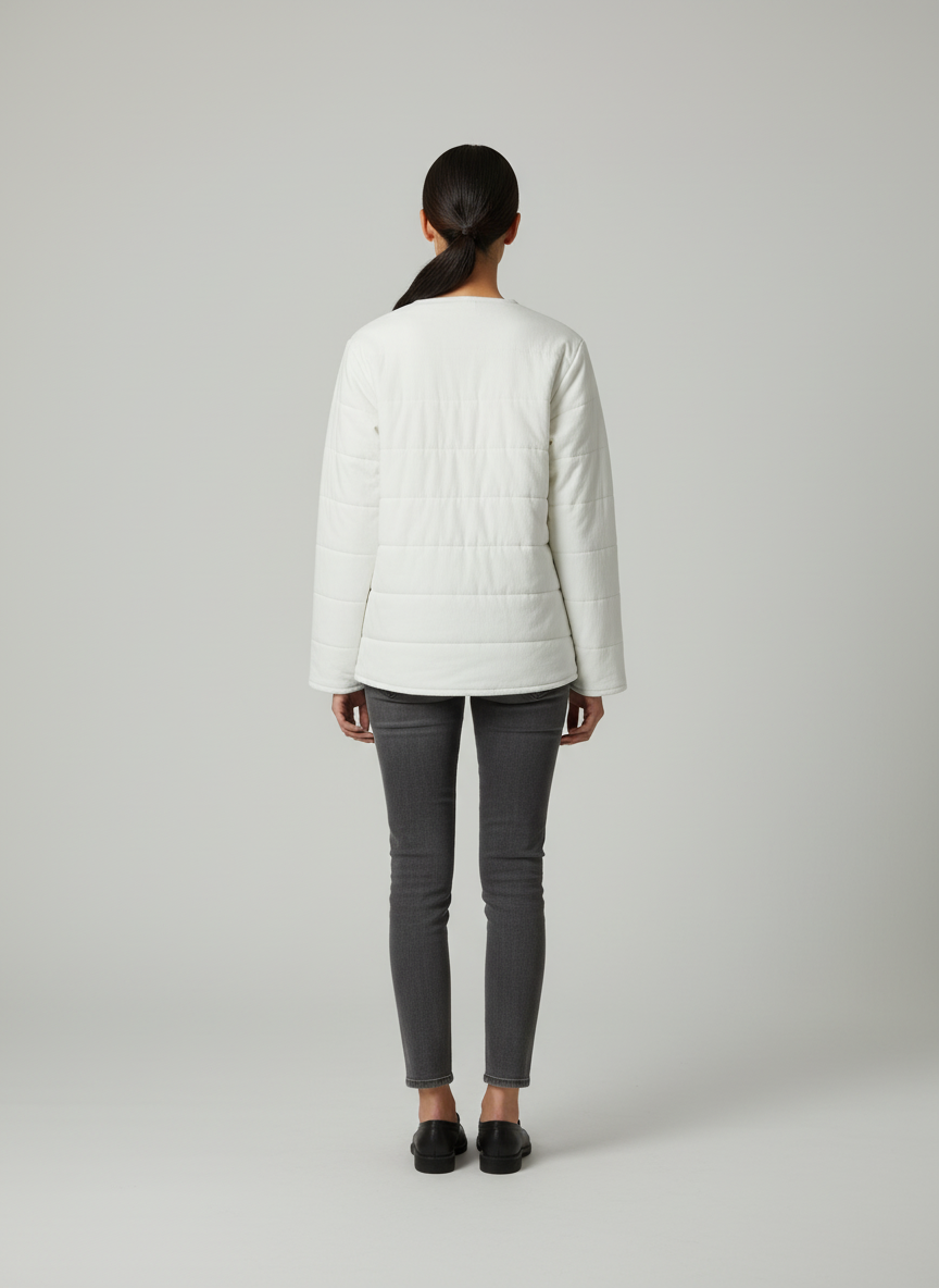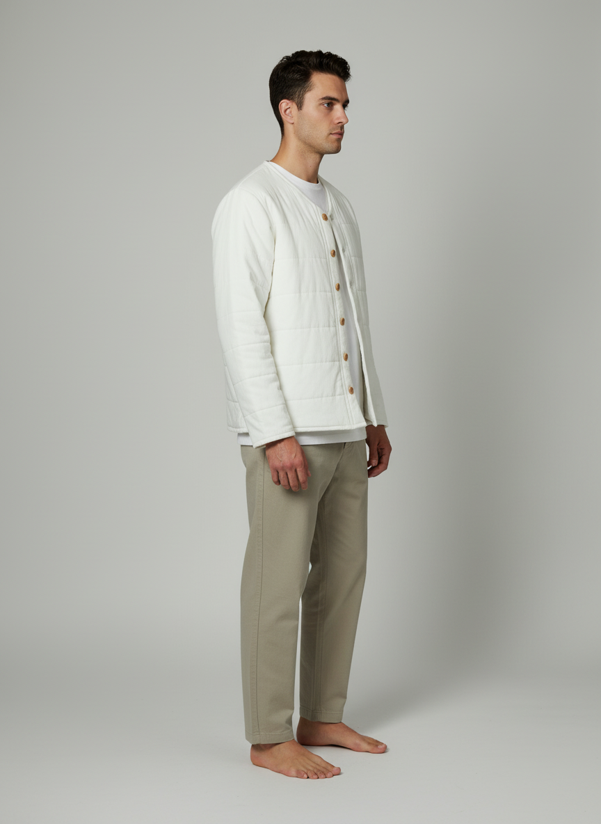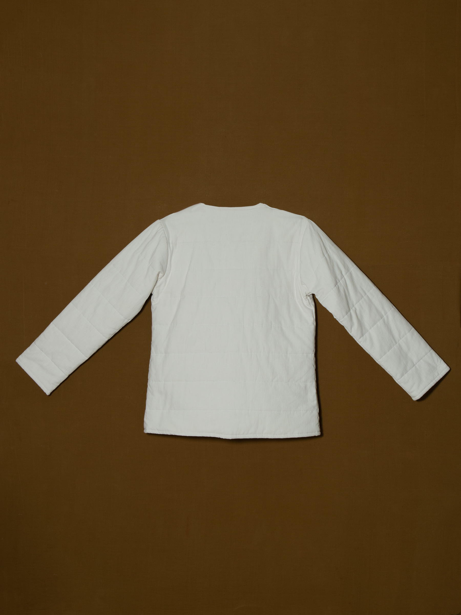 Drawing inspiration from the polished elegance of women's leather jackets, this structured V-cardigan offers a softer, sustainable alternative for winter layering. With its full sleeves, button-down front, and quilted batting for added warmth, it delivers both comfort and sophistication. Designed in breathable handwoven cotton, it’s a versatile piece for ethical wardrobes.