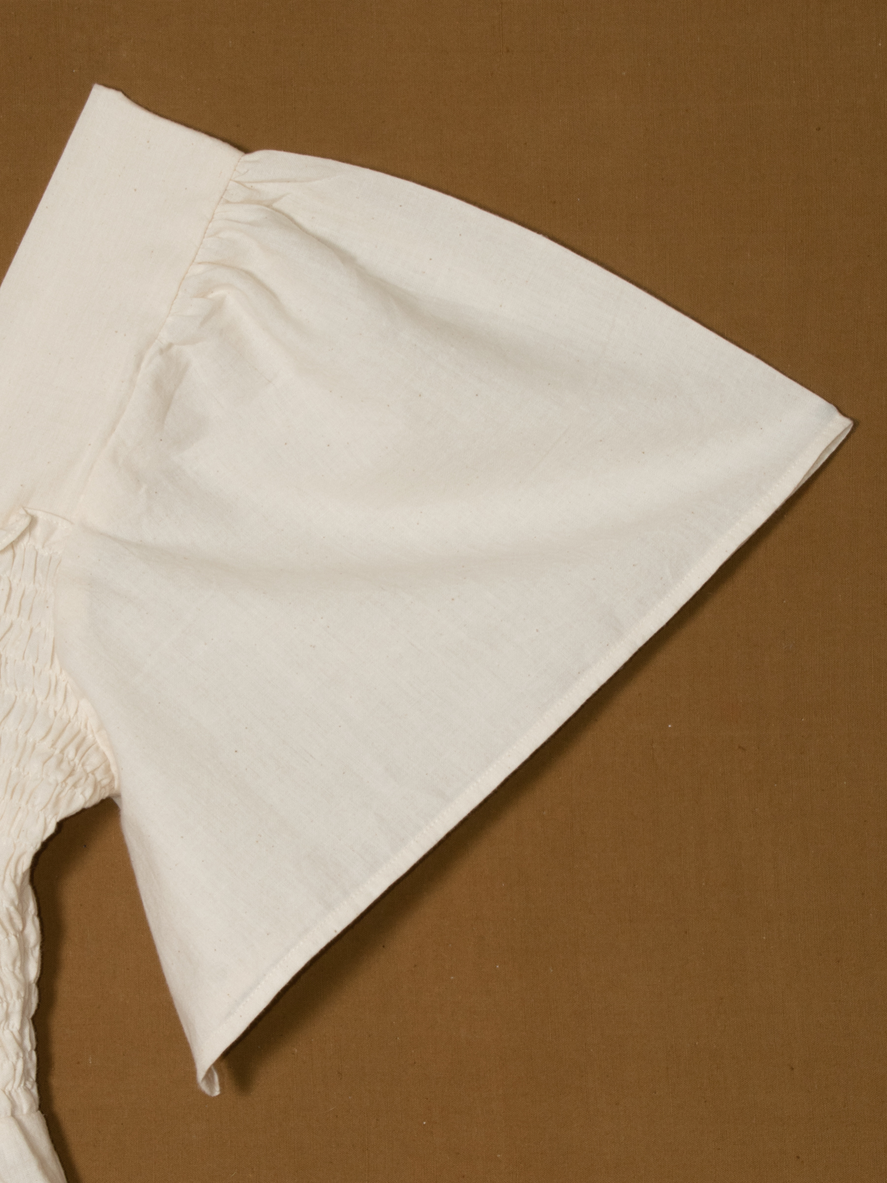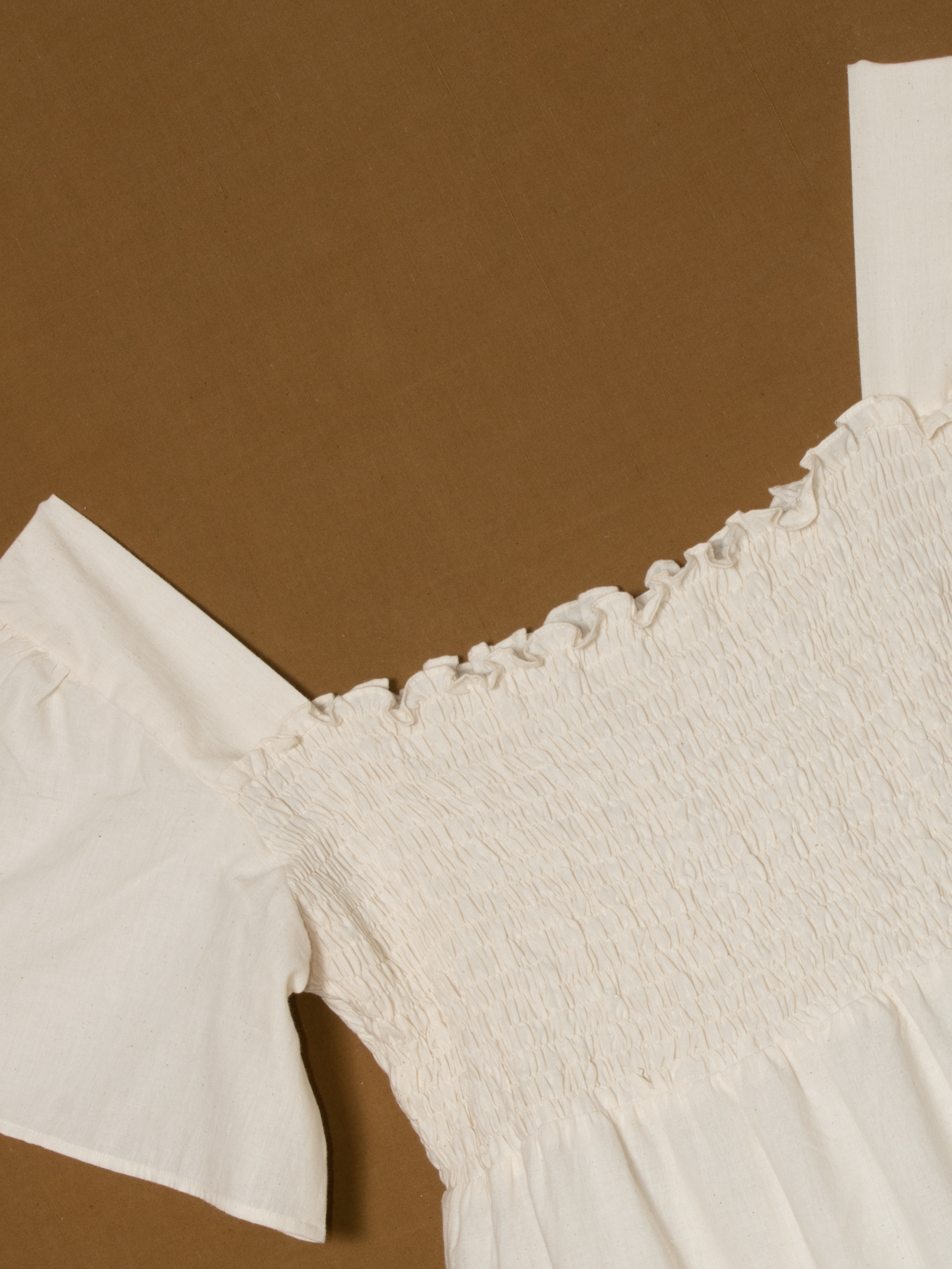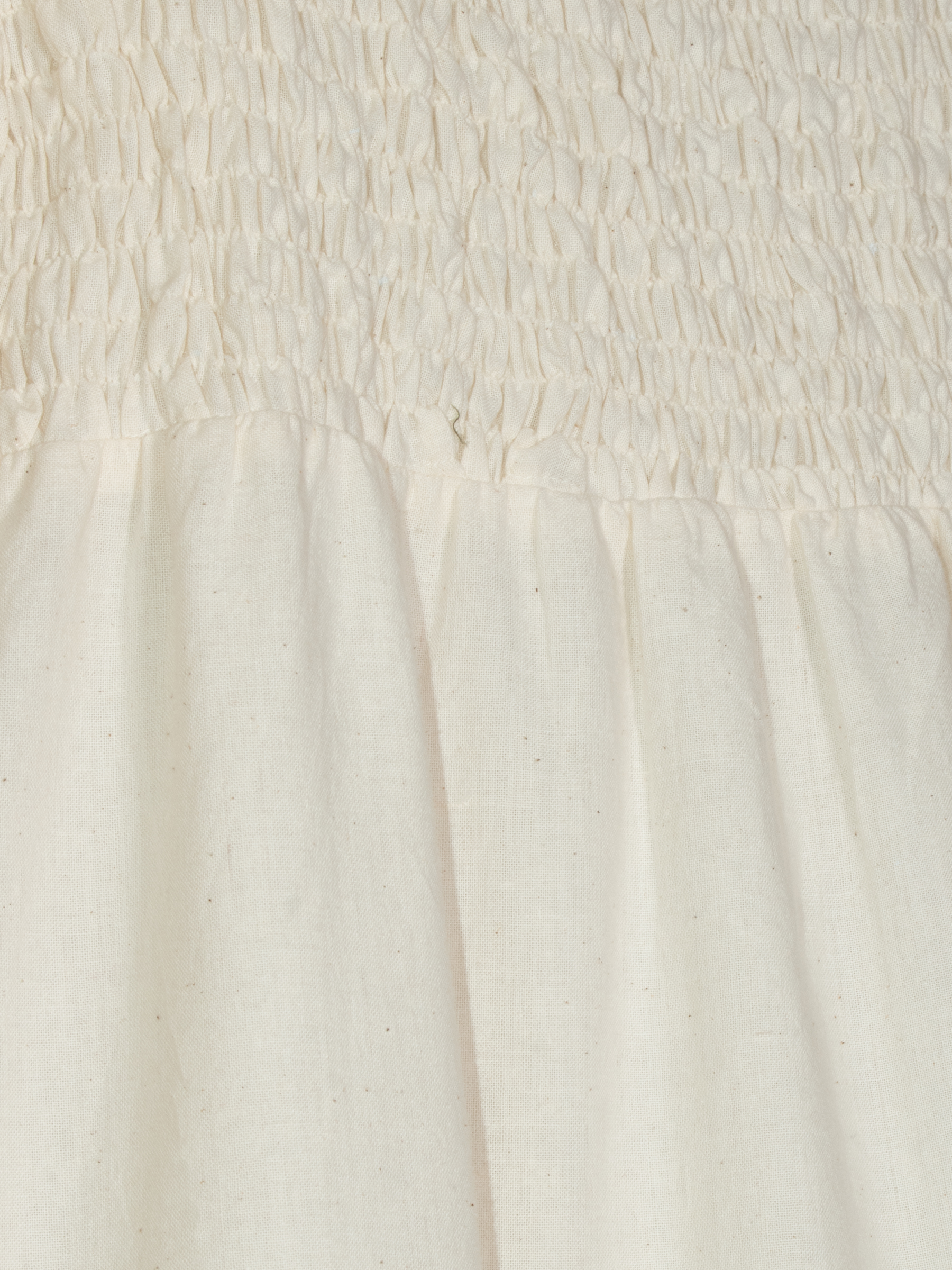 Ivory shade with smocked bodice and flounce sleeves.