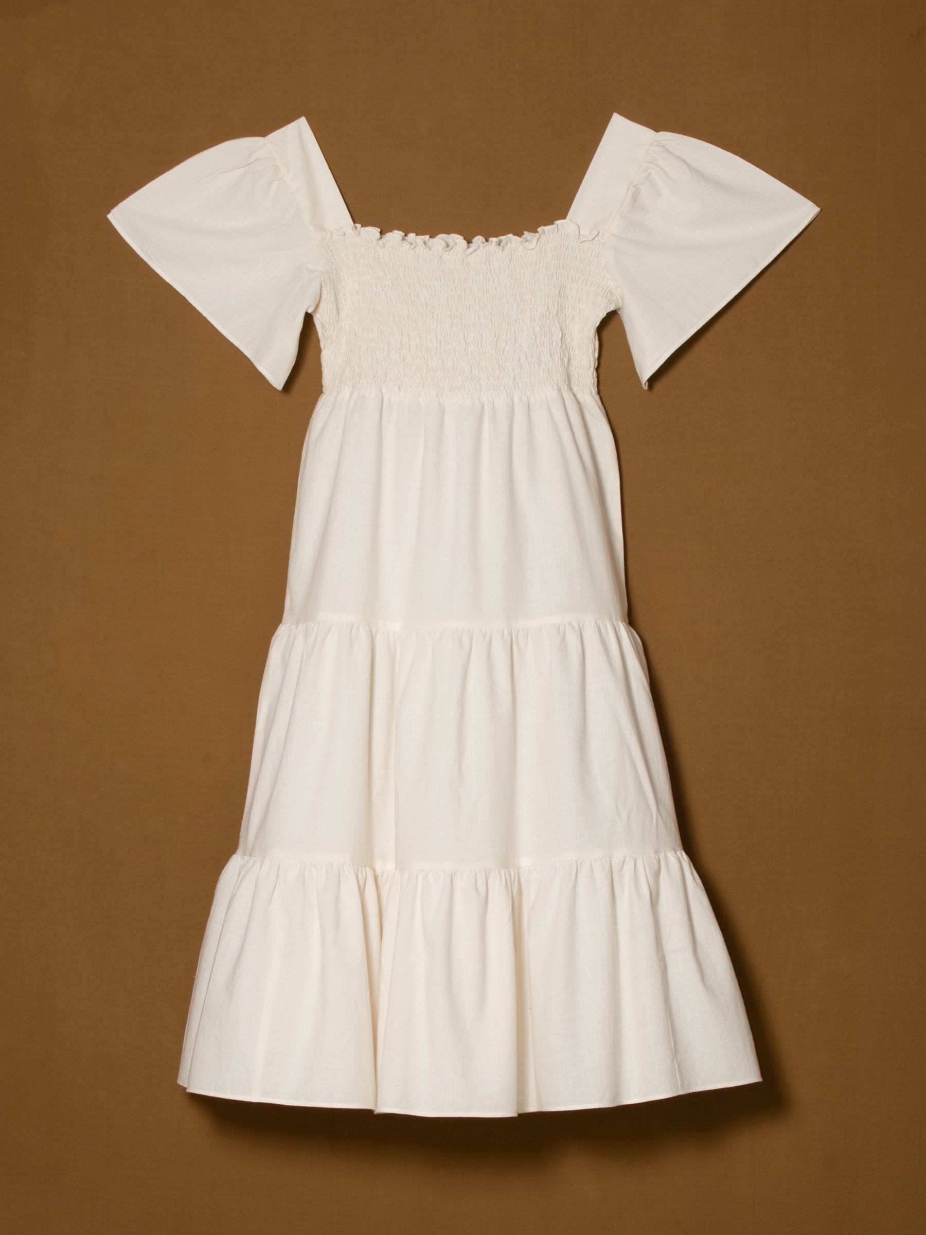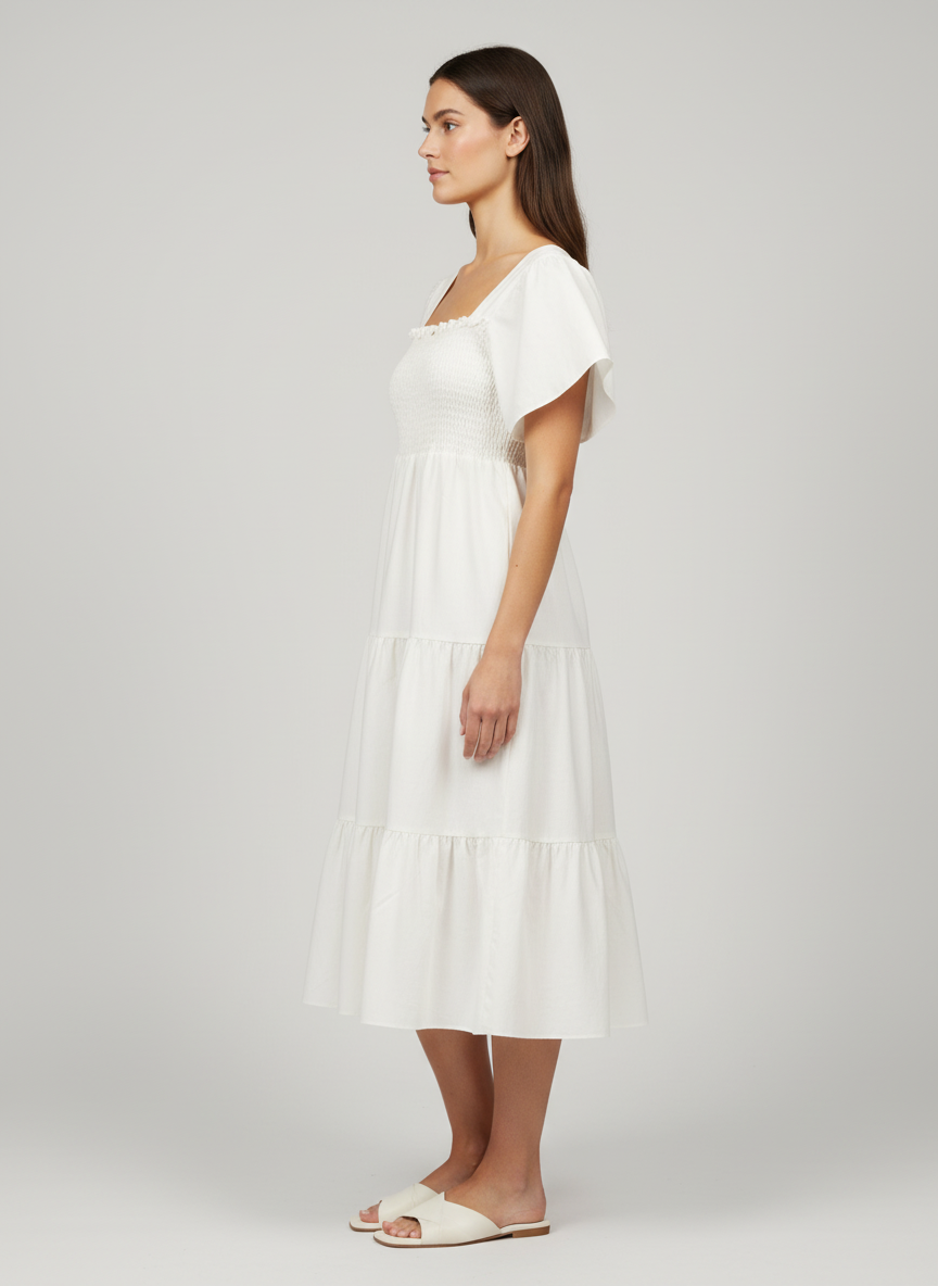 Romantic and graceful, this Three Tiered Smoky Dress adds a dreamy charm to women’s party dresses. Designed in a soft ivory tone, it features flounce sleeves and a smocked bodice that flows into three cascading tiers for volume and movement. Perfect for evening soirées, celebrations, or elegant gatherings.