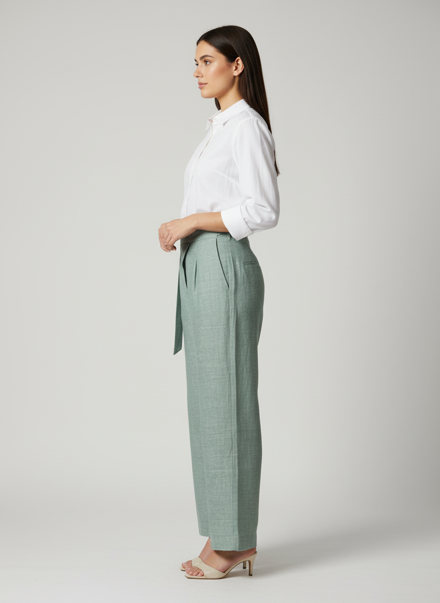 Effortless and versatile, this Tie-Up Waist-Band Trouser brings relaxed sophistication to women’s trouser styles. Designed in a muted green tone with a clean straight cut, it features a tie-up waistband that adds comfort and adjustability. Lightweight and breathable, it’s perfect for casual days, workwear, or travel.