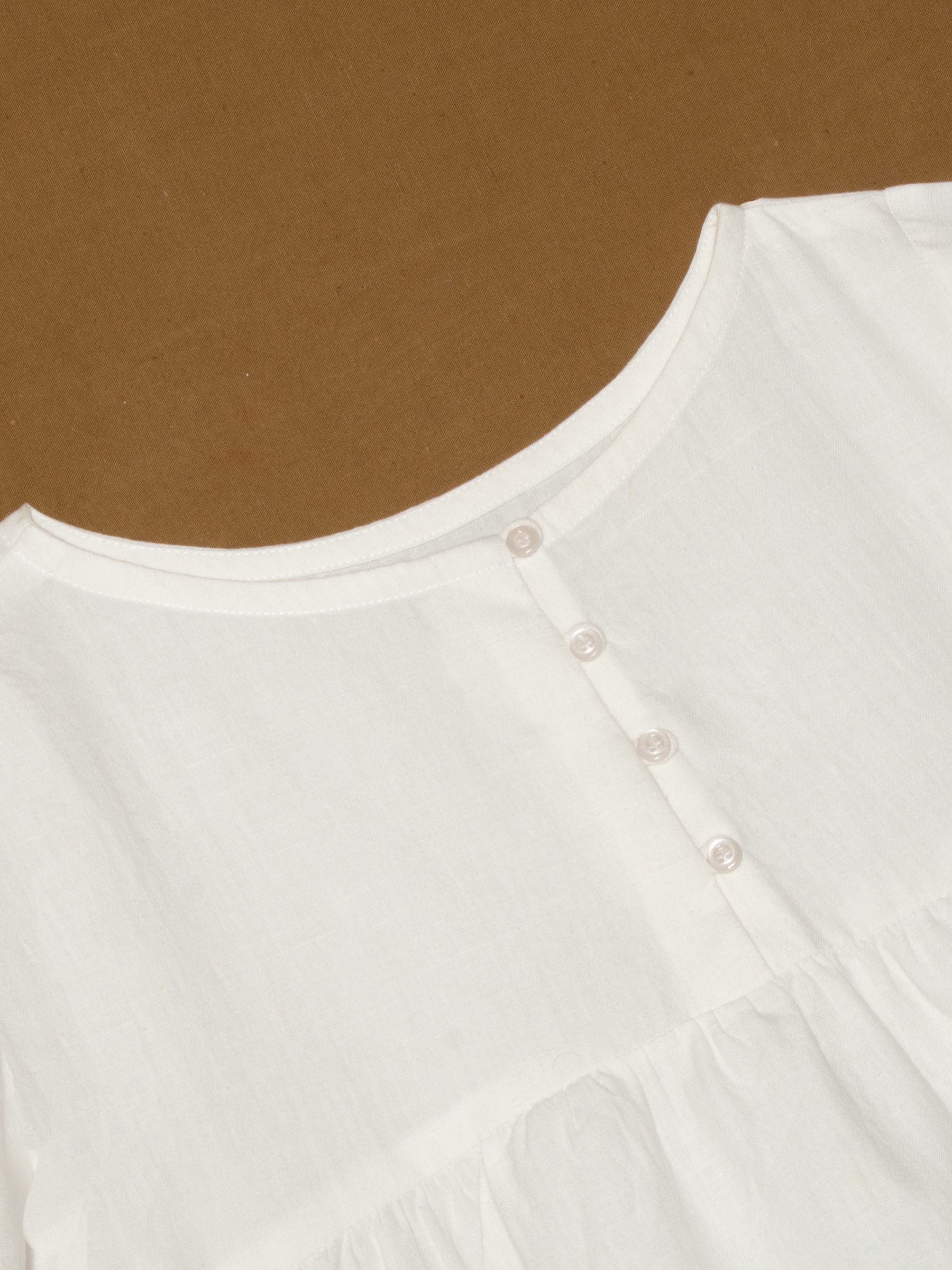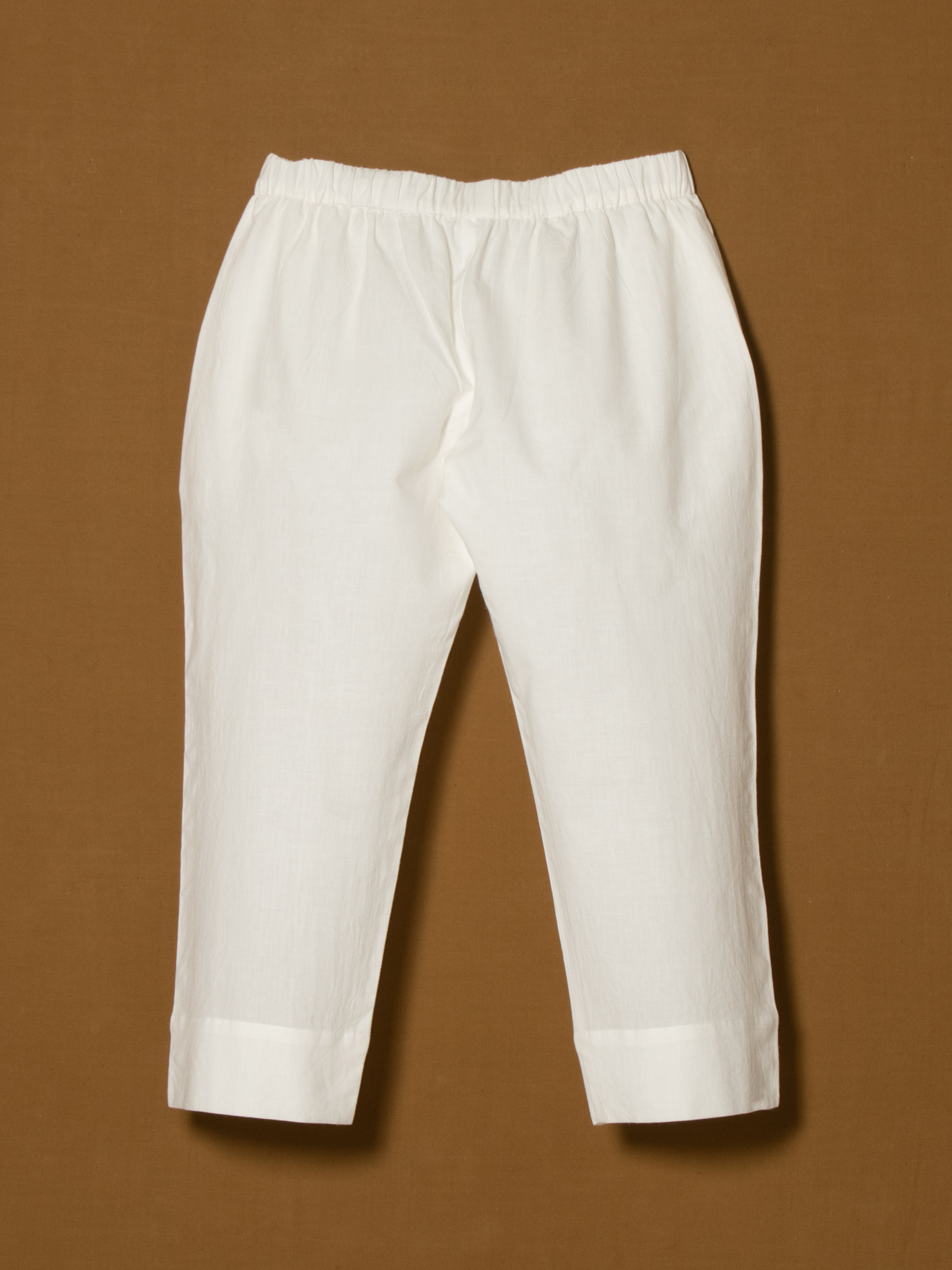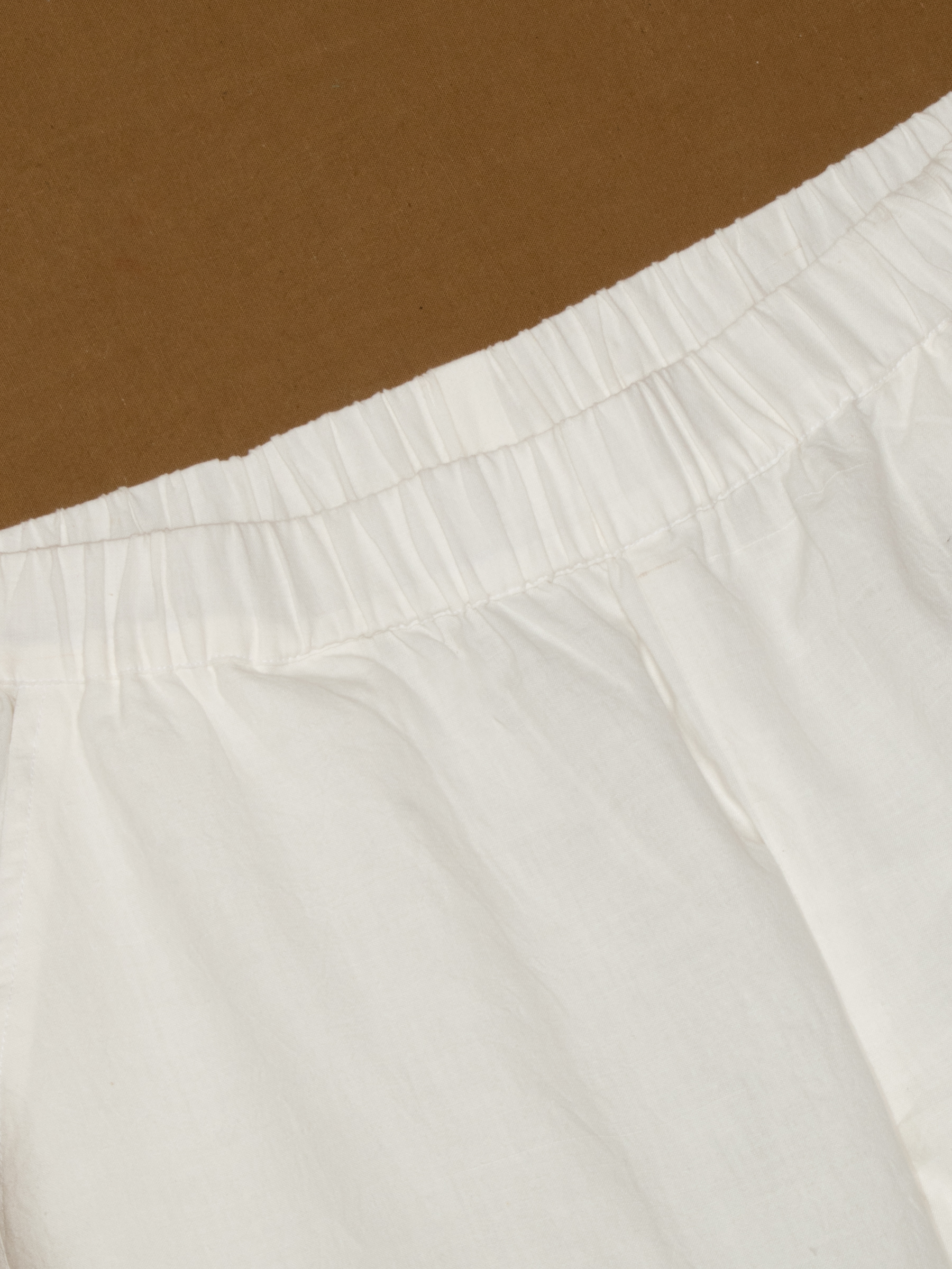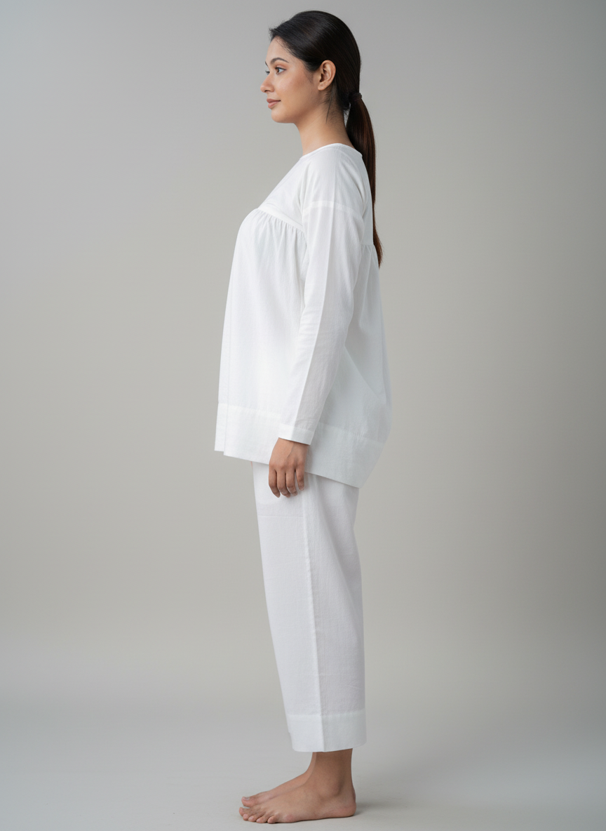 This White co-ord set embodies minimal elegance with its clean silhouette and versatile design. Crafted from breathable, handwoven fabric, it offers comfort and durability while supporting conscious craftsmanship. The set features a flowy top with subtle gathers and straight-fit pants, making it an effortless choice for both casual and elevated occasions. Fully customizable in fabric and design, it allows designers and brands to experiment with textures, patterns, or dyeing for a unique finish.