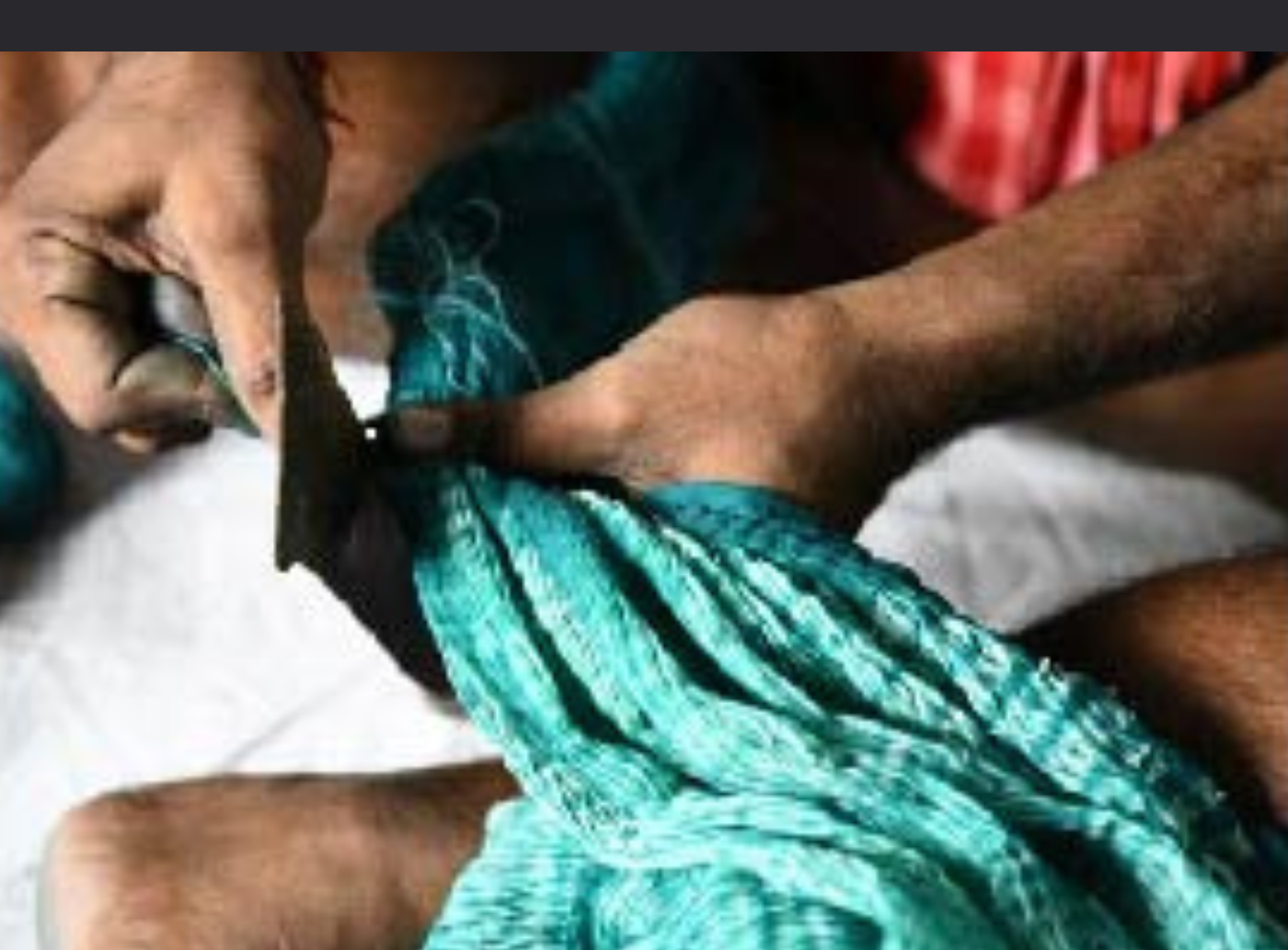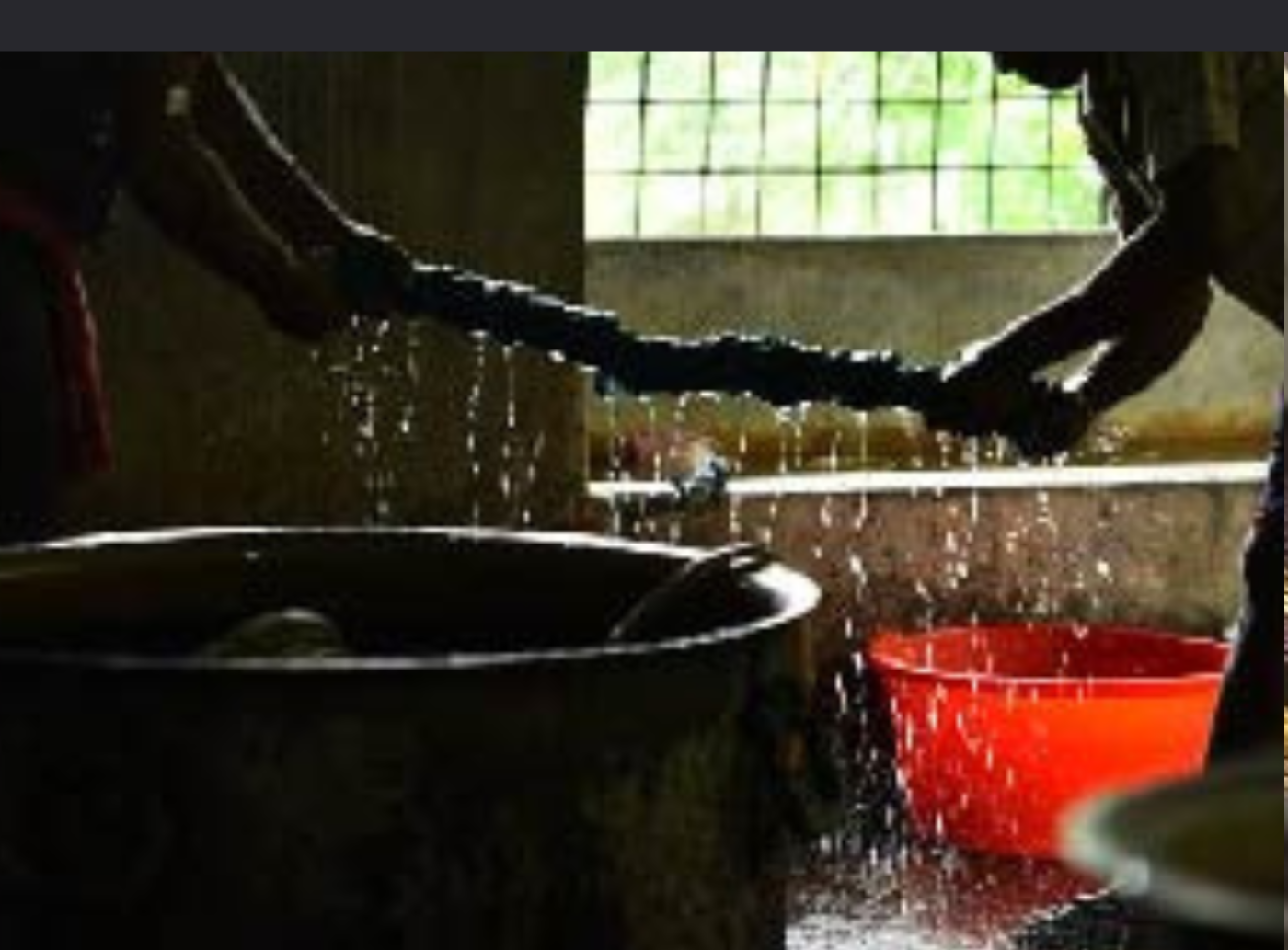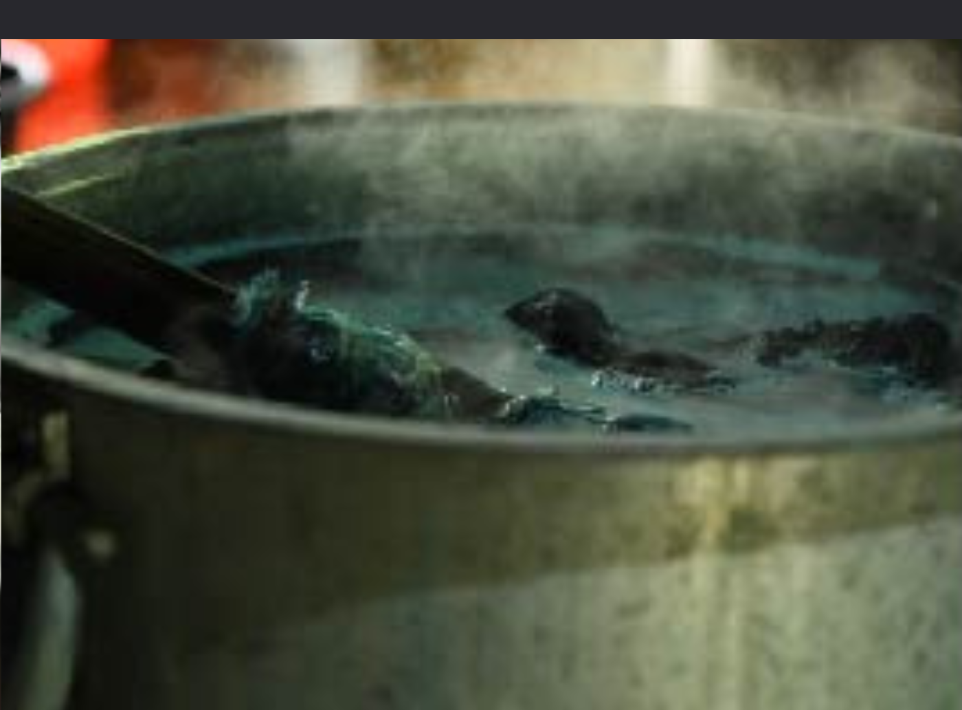 The fabric, which has been gathered and tied, is then immersed in the dye bath to enable the dye to penetrate the fabric as much as possible.