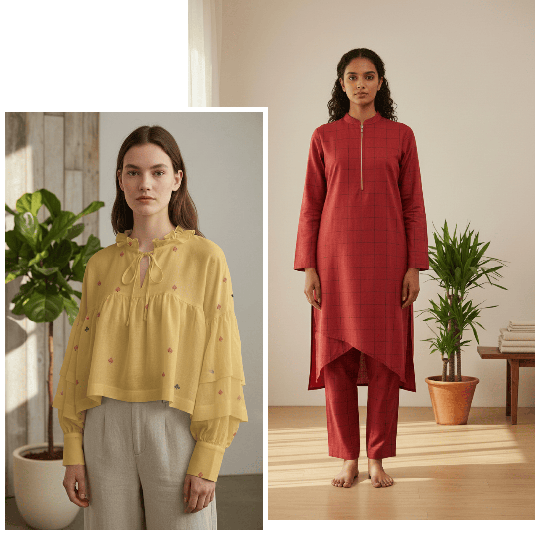 Each fabric — whether Jamdani, Khadi, or Matka silk — tells a chromatic story of soil, water, and hands that shaped it.
