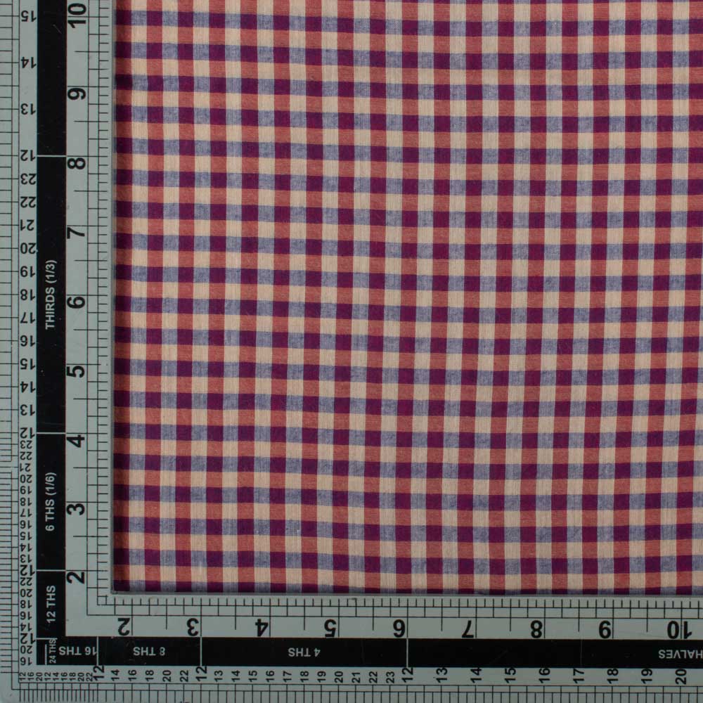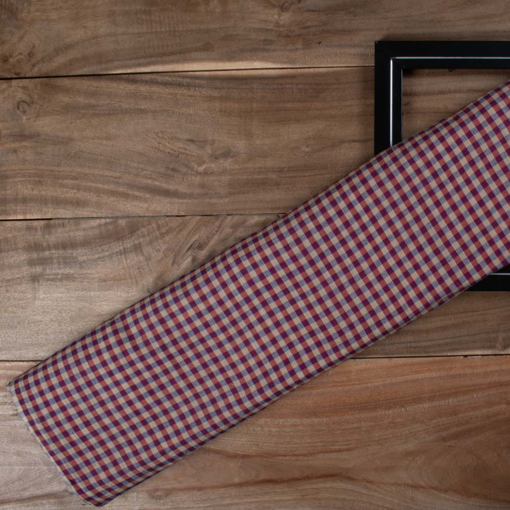 This Beige Red Blue Check Pure Cotton 60 GSM Handwoven Fabric gives you a clean, breathable base with a bold check layout that reads crisp without shouting. The lightweight construction suits shirts, dresses, resort wear, and relaxed separates where airflow matters more than drama. The warp and weft keep the checks stable so the pattern does not skew during cutting, which saves you headaches and wastage.
