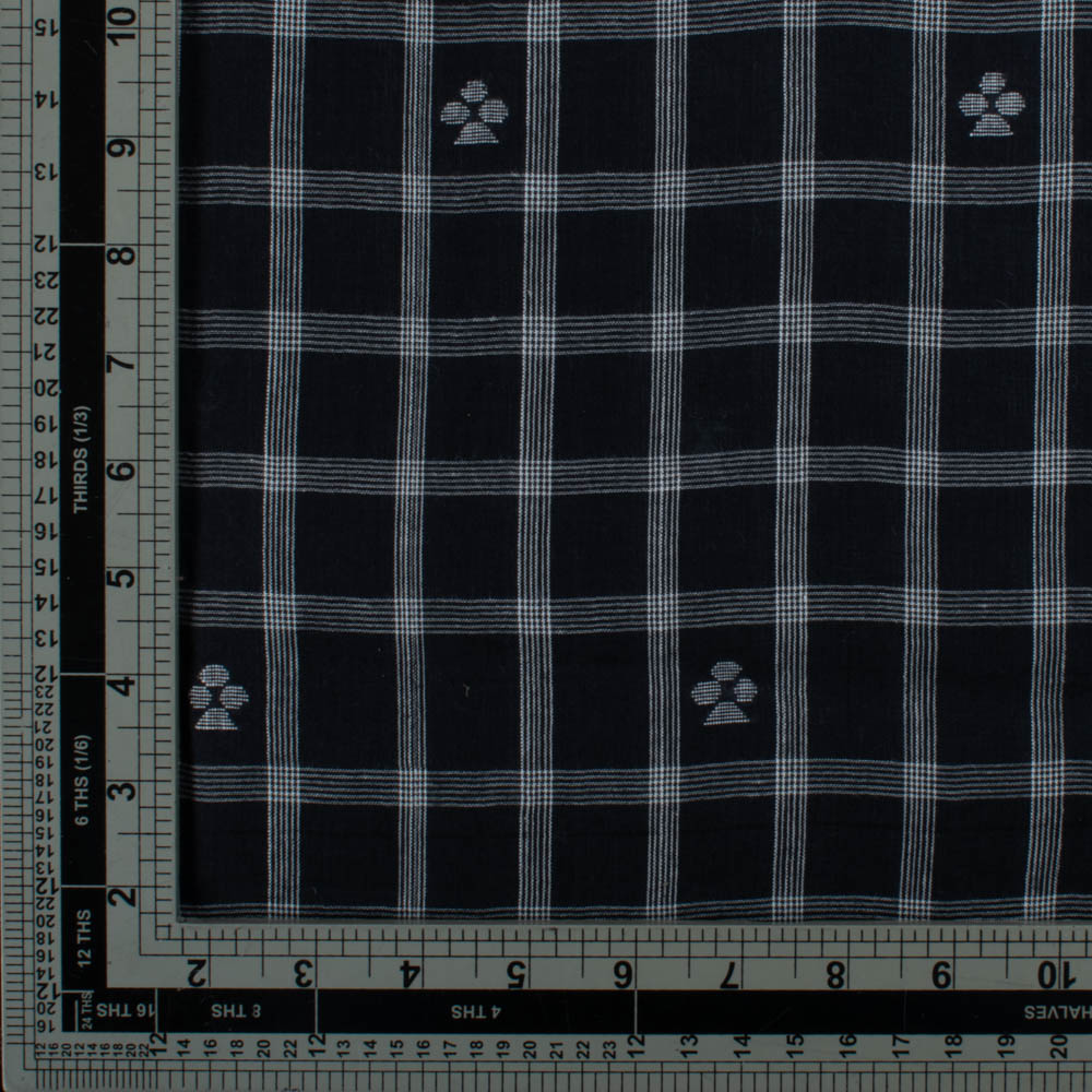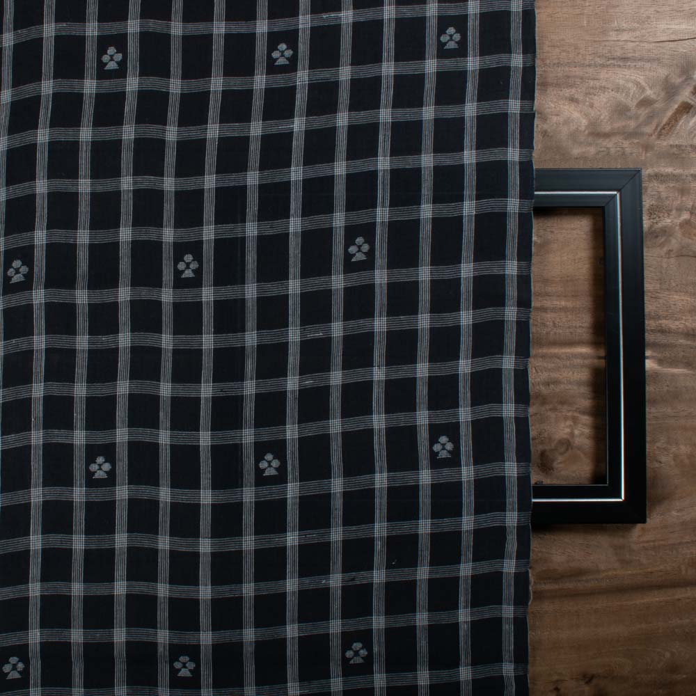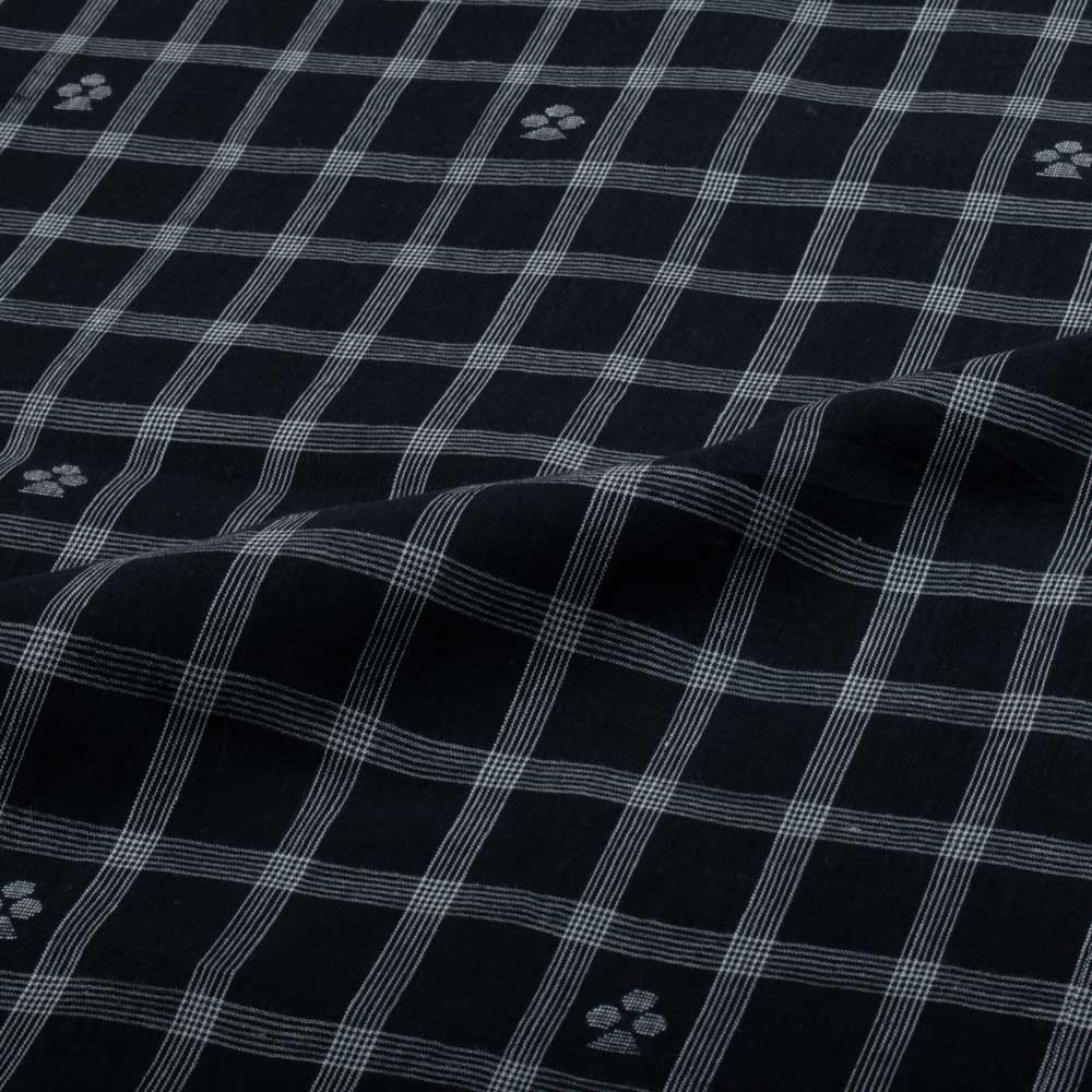 Handwoven in pure cotton, this jamdani fabric pairs a deep black base with crisp white checks and subtle extra-weft motifs. At 70 GSM it feels light, cool, and comfortable on skin while offering a neat fall suited to everyday wear. The grid adds structure; the jamdani work brings craft character. Tailor refined shirts, dresses, kurtas, overlays, dupattas, and kidswear, or use as a contrast panel with solids. Minor slubs and weave variations are natural signs of small-batch artisan production and make each meter unique.