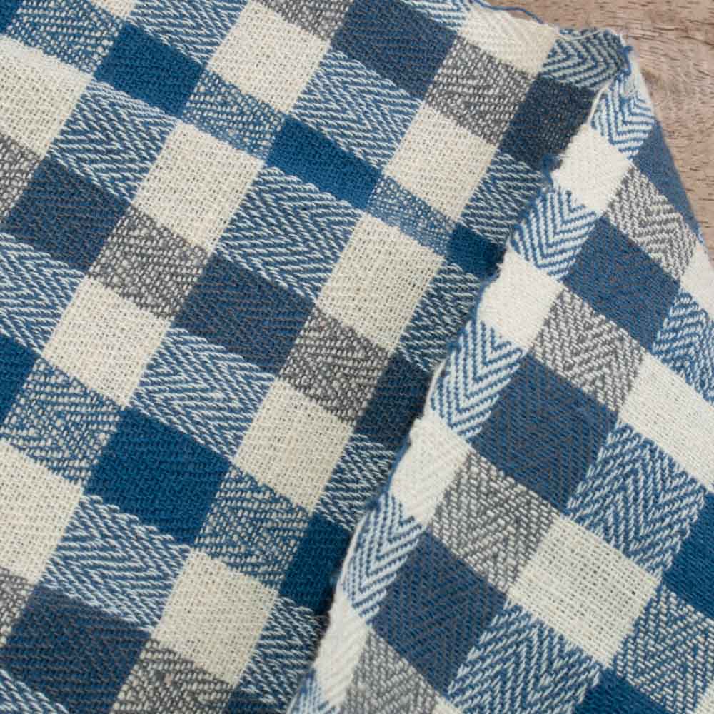 Our Herringbone Check Blue White and Grey Hemp Cotton 150 GSM Handwoven Fabric is designed for ethical and sustainable designers. Featuring a hemp warp and cotton weft, this medium-weight jacquard fabric offers a soft, breathable, and durable finish. The intricate herringbone check pattern enhances its timeless appeal, making it perfect for elevated apparel, sophisticated home décor, and artisanal accessories. A refined blend of texture and durability, this fabric brings versatility and elegance to conscious creations.