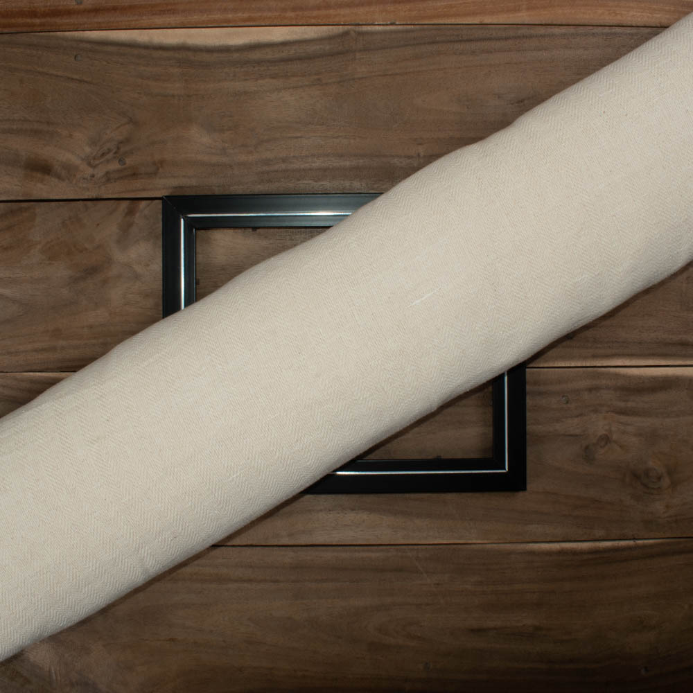 Crafted for ethical and sustainable designers, this Jacquard Fabric in subtle Cream showcases a refined Herringbone pattern, handwoven with a cotton warp and linen weft. At 185 GSM, it offers a medium weight with a soft, breathable, and durable finish. Exceptionally versatile, it's ideal for elegant garments, outerwear, and refined home textiles that embody timeless craftsmanship and conscious luxury.