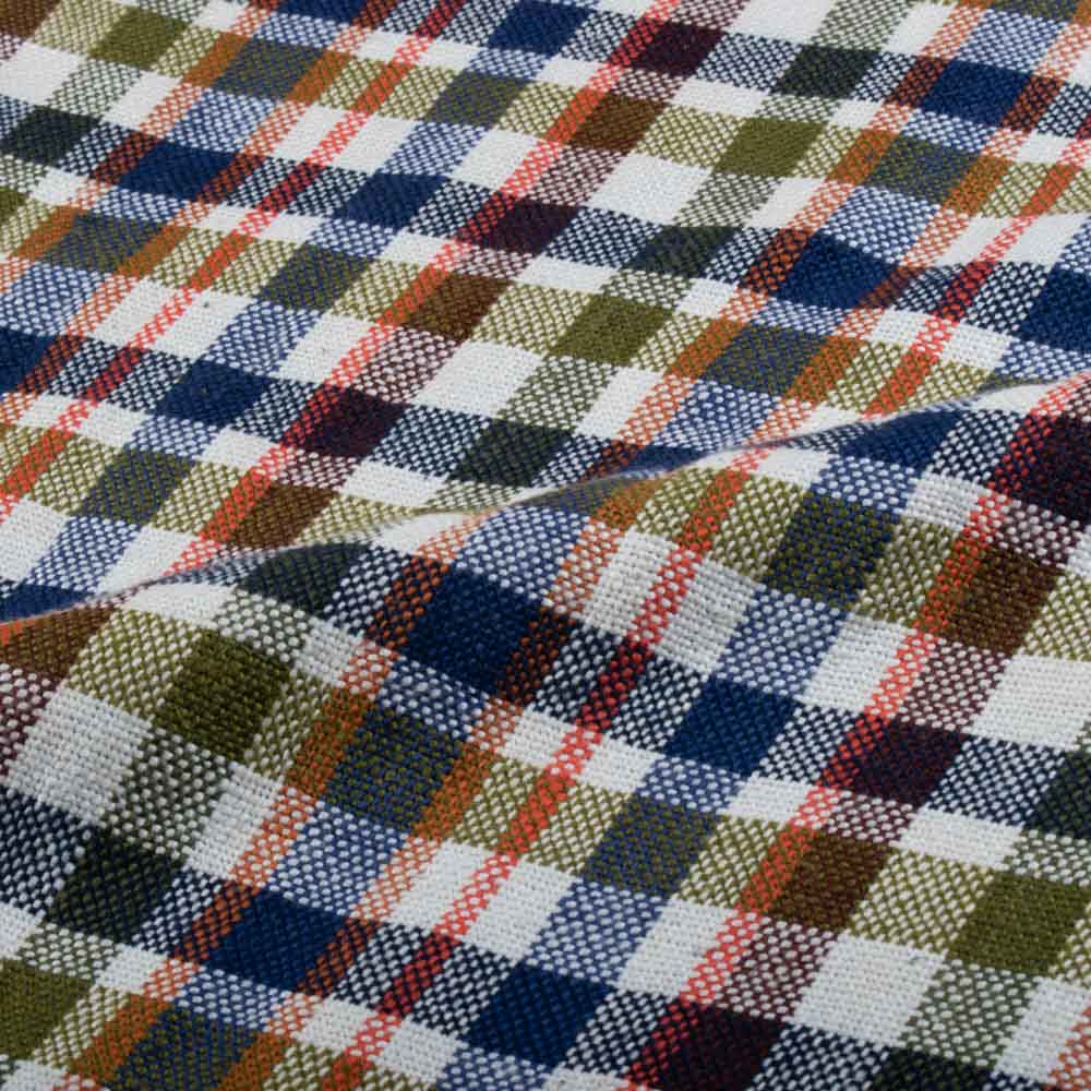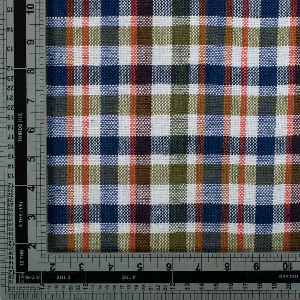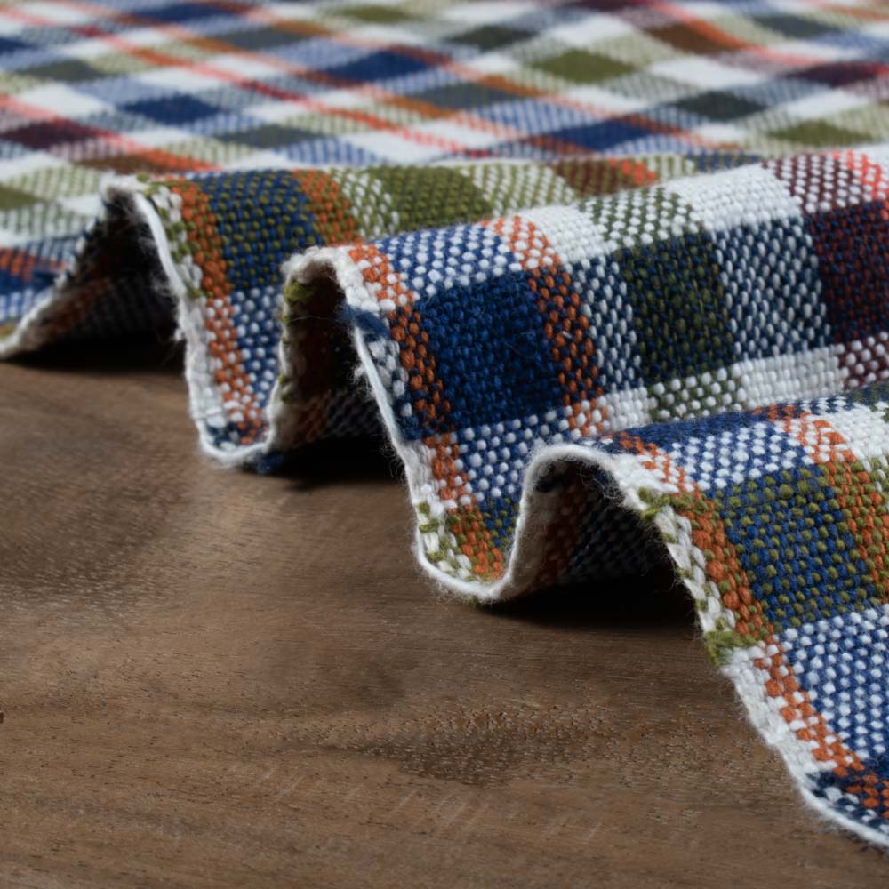This Multicolour Check Pure Khadi 311 GSM Handwoven Fabric offers a warm, structured drape ideal for winter and transseasonal wardrobes. Handspun yarns and a bold mix of navy, olive, rust, and white checks create a heritage look that works for jackets, shackets, overshirts, dresses, co-ords, skirts, and tailored trousers. The heavier weight keeps its shape while staying breathable and comfortable against the skin even with long wear.