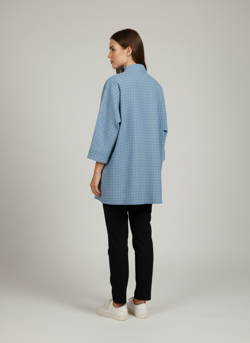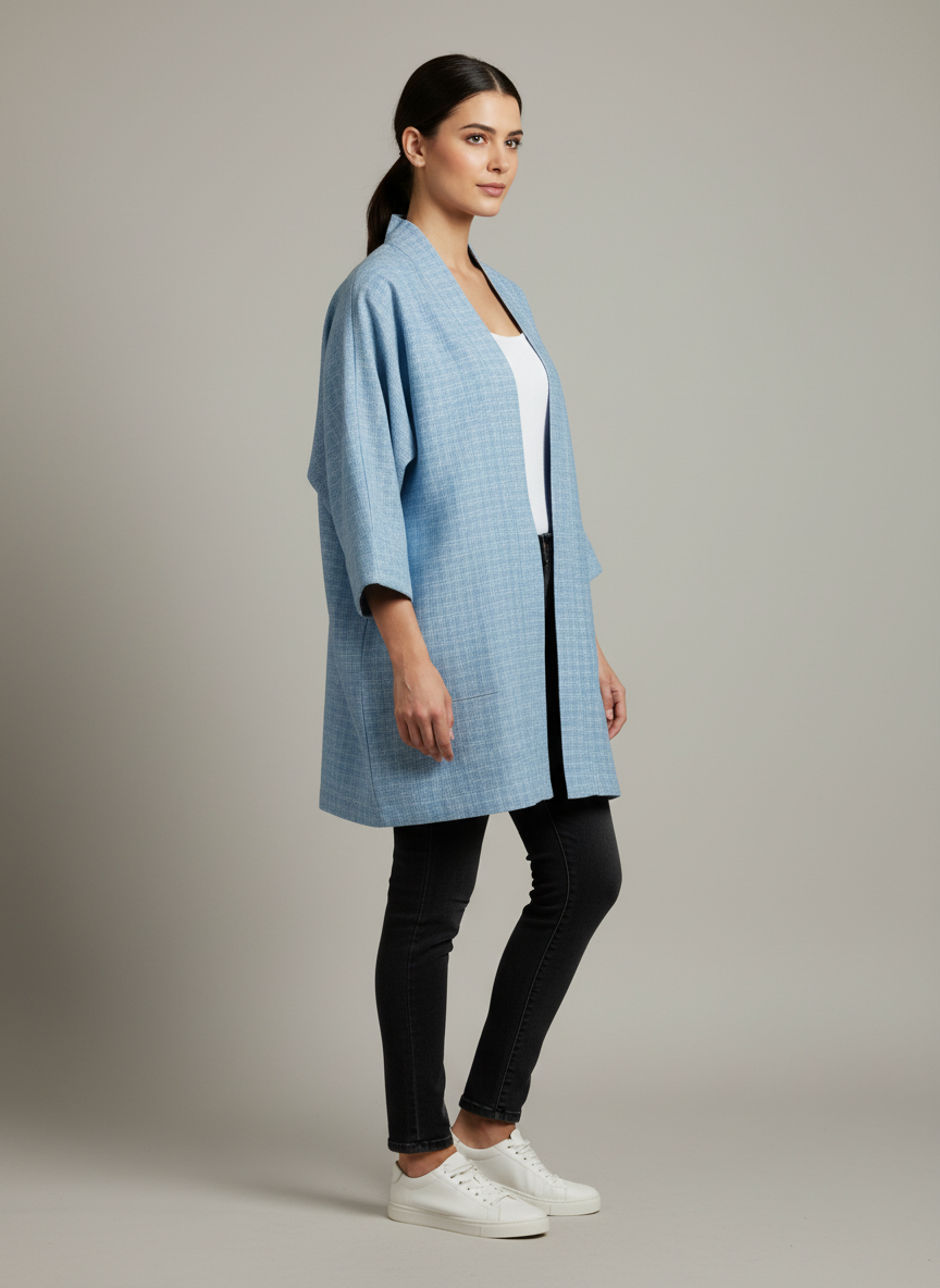 This handwoven coat in a soothing blue tone combines minimal elegance with artisanal craftsmanship. Designed for modern women who value sustainable fashion, it offers the versatility and comfort of women's coats and jackets while staying lightweight and breathable. Perfect for layering, its clean silhouette makes it suitable for both casual wear and elevated occasions. Fully customizable in fabric, color, and design, it brings together timeless style with conscious making.