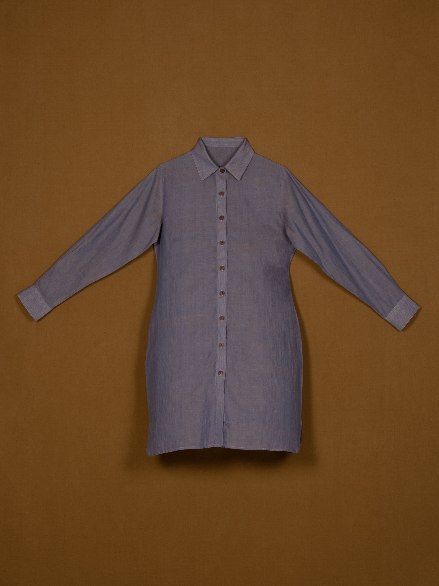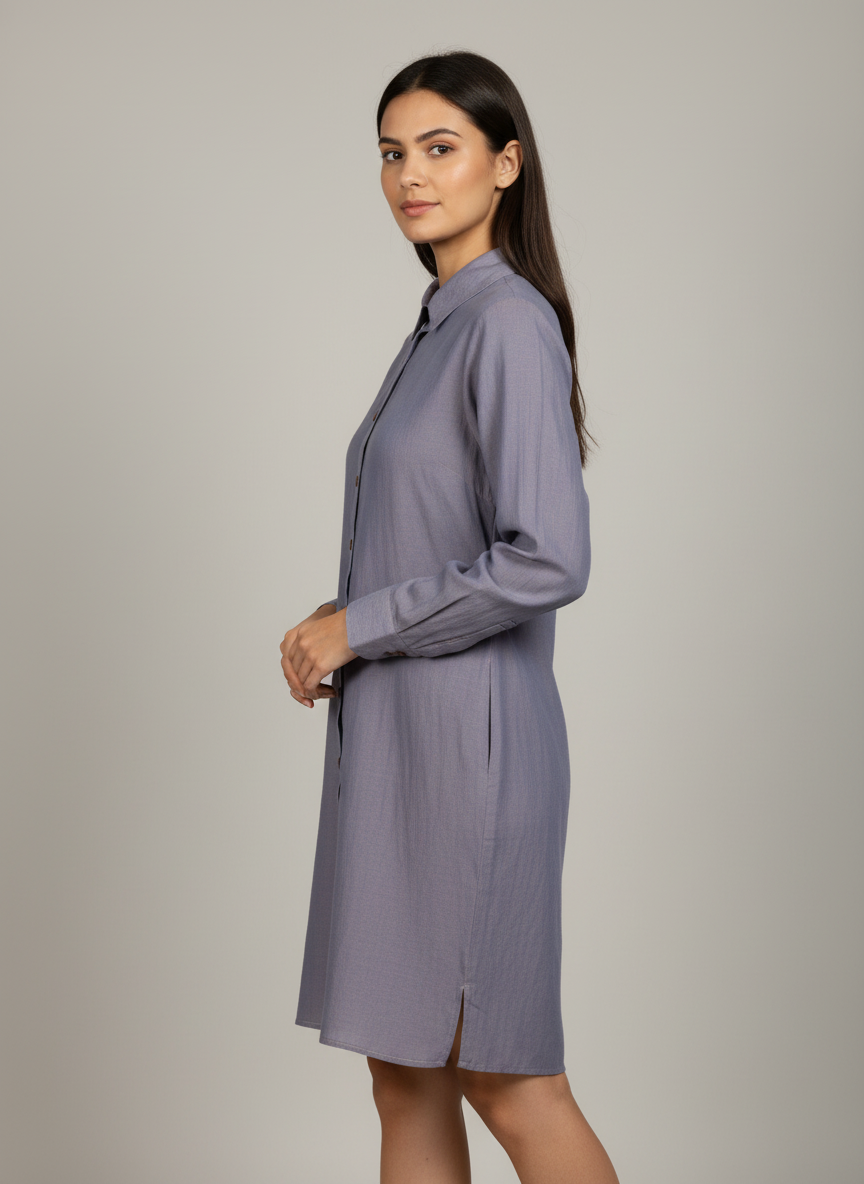 Minimal and versatile, this Shirt Dress blends tailored details with the breezy comfort of a women’s summer dress. Designed in a soft blue tone with a spread collar, button-down front, and long sleeves, it balances structure with ease. The knee-length cut and side slit make it perfect for warm days, casual wear, or semi-formal styling.