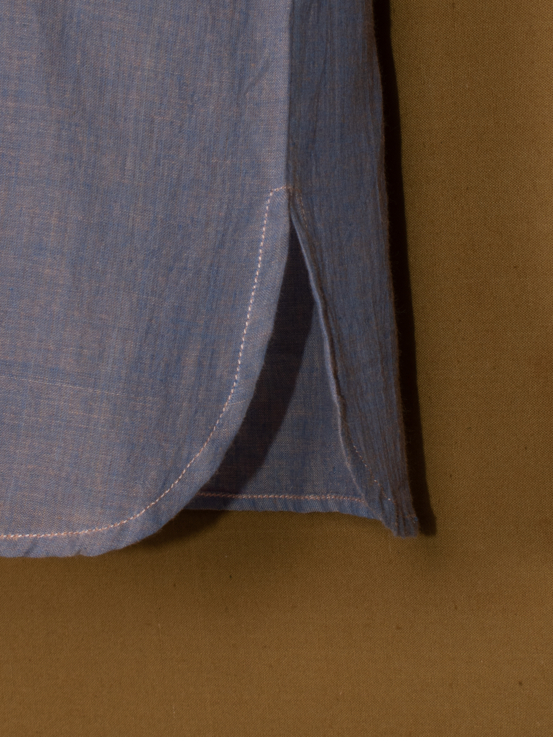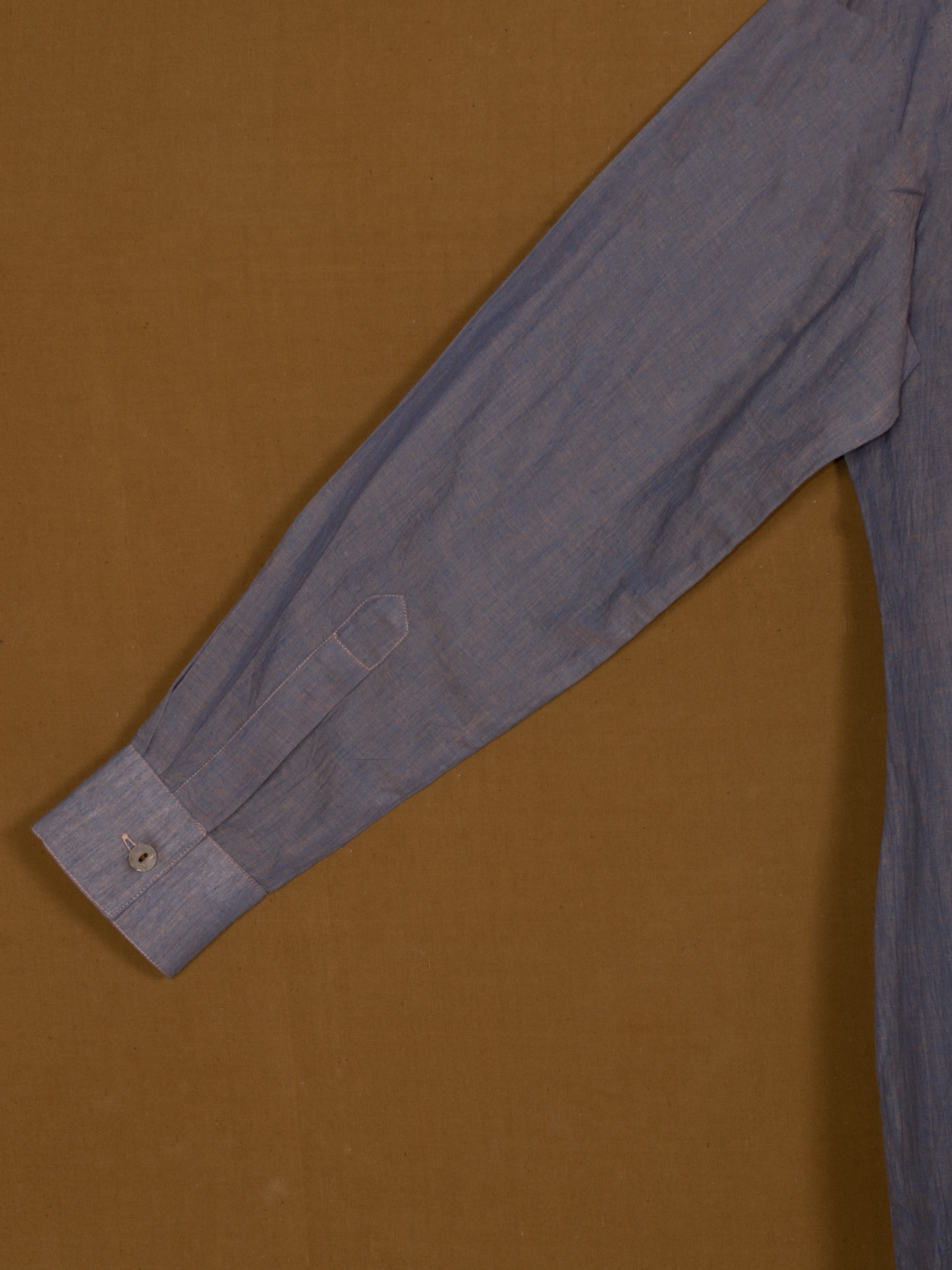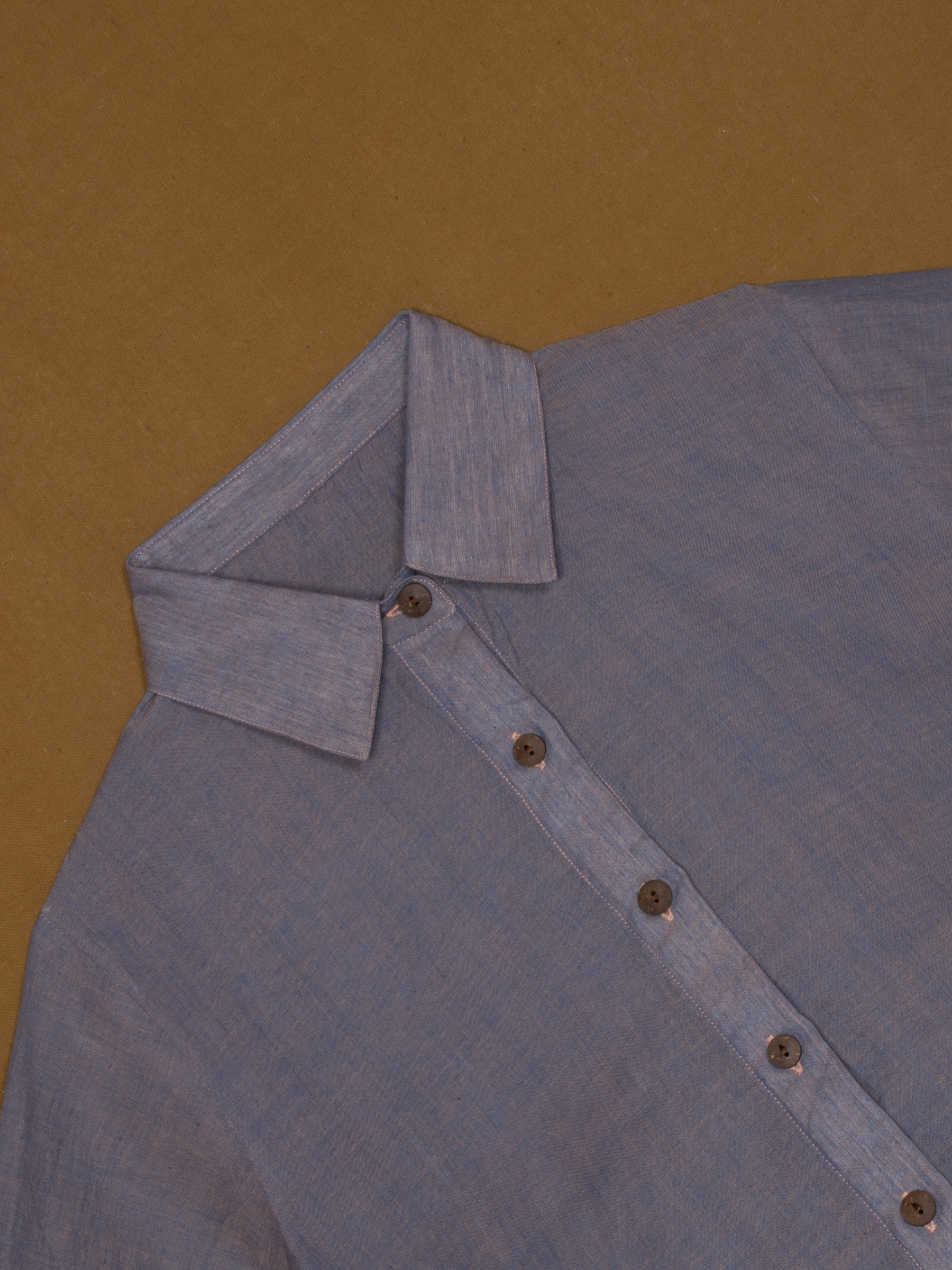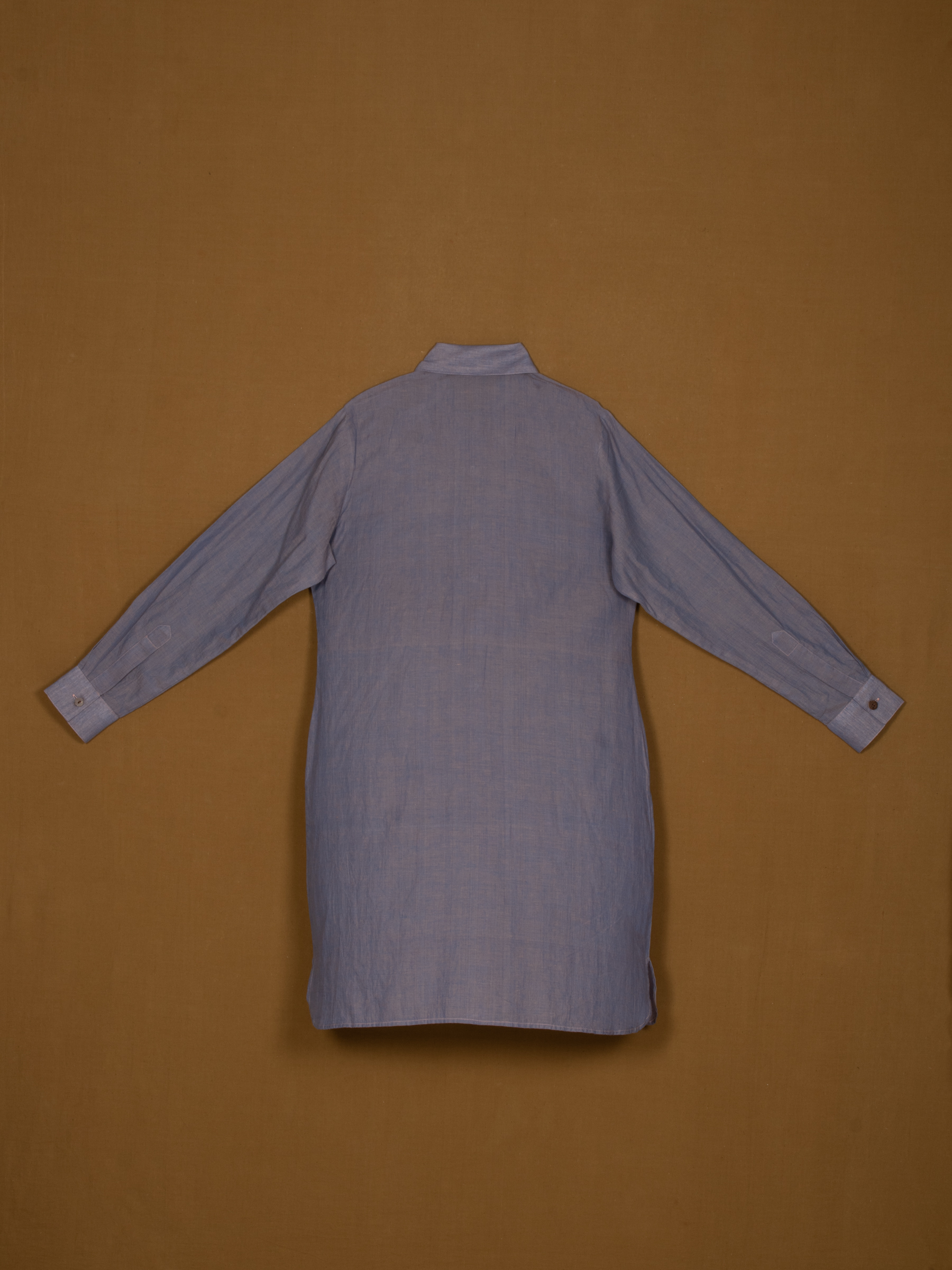 Soft blue tone with spread collar and buttoned placket.