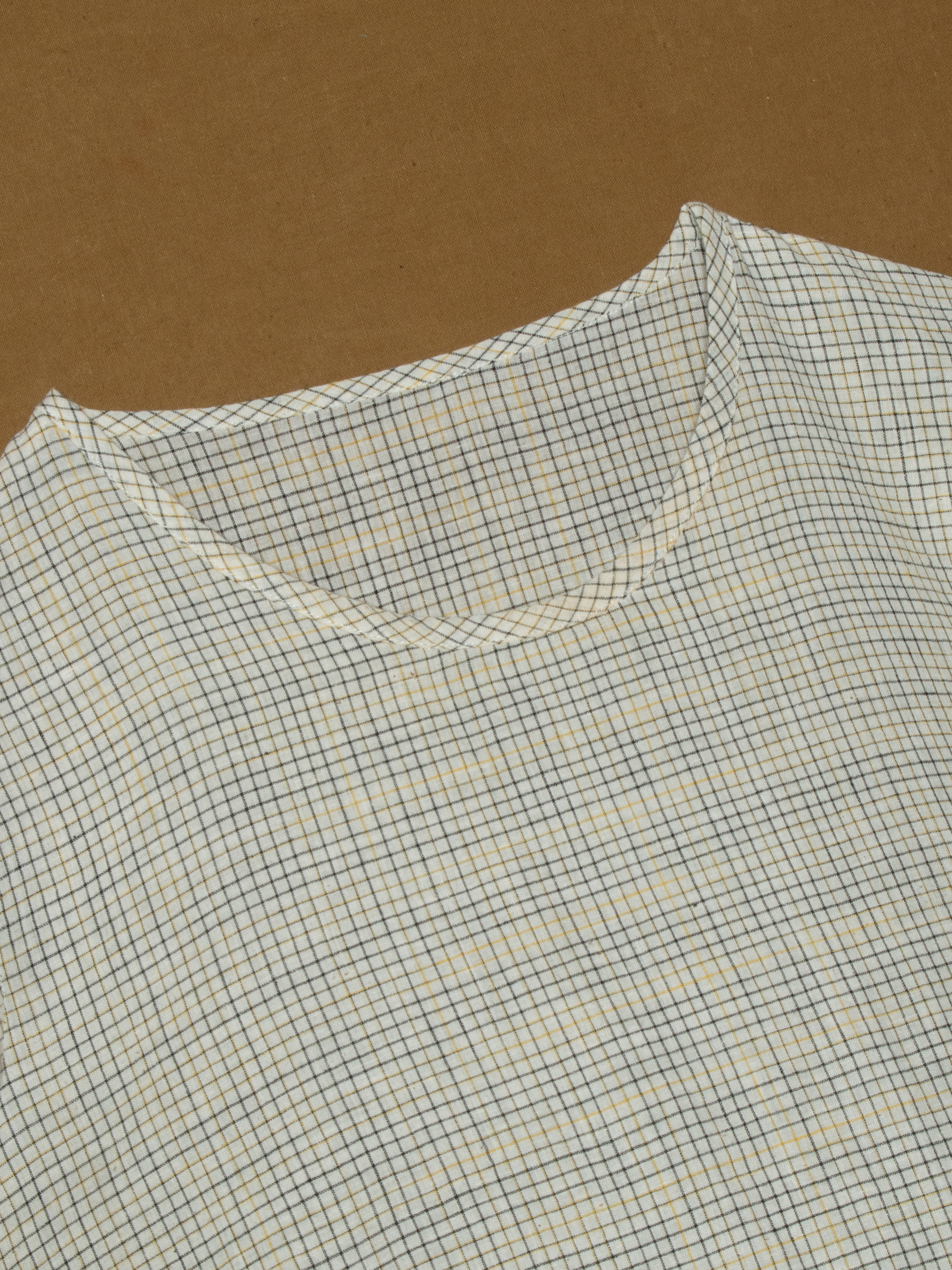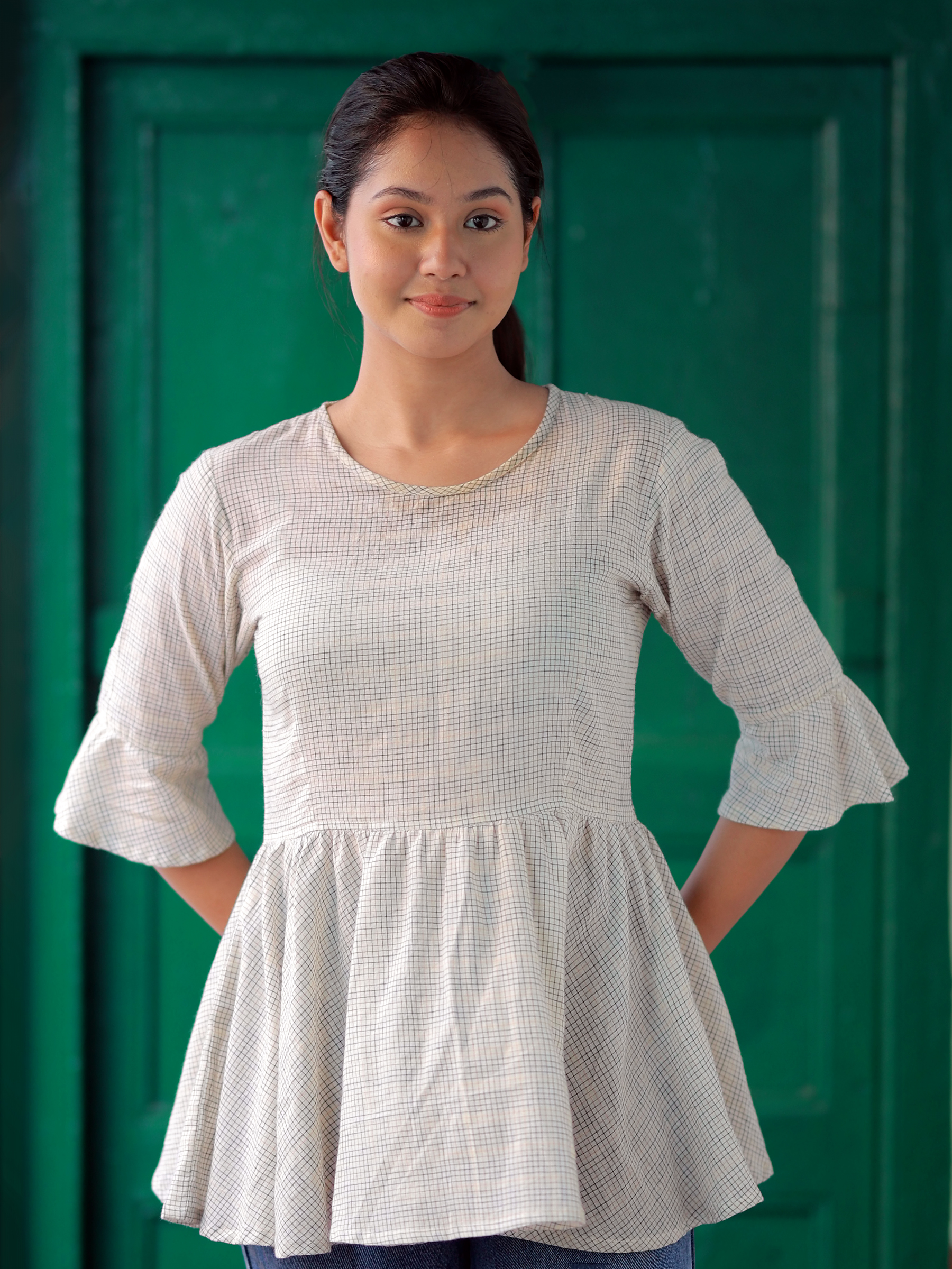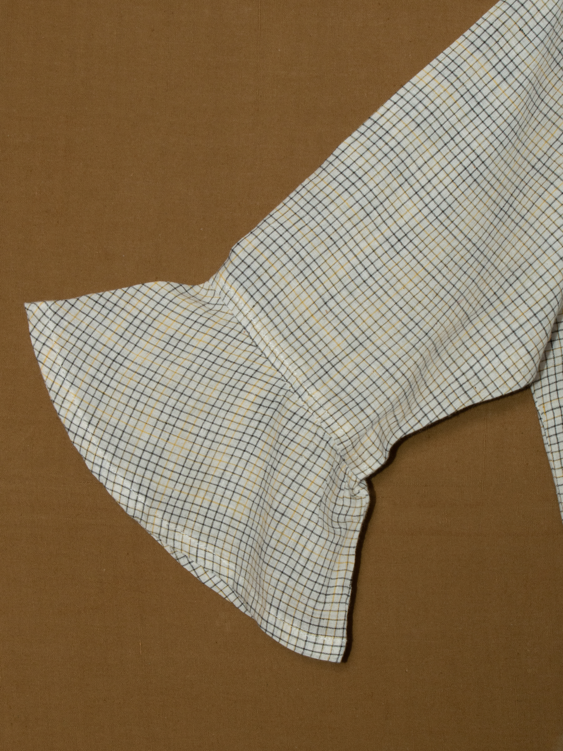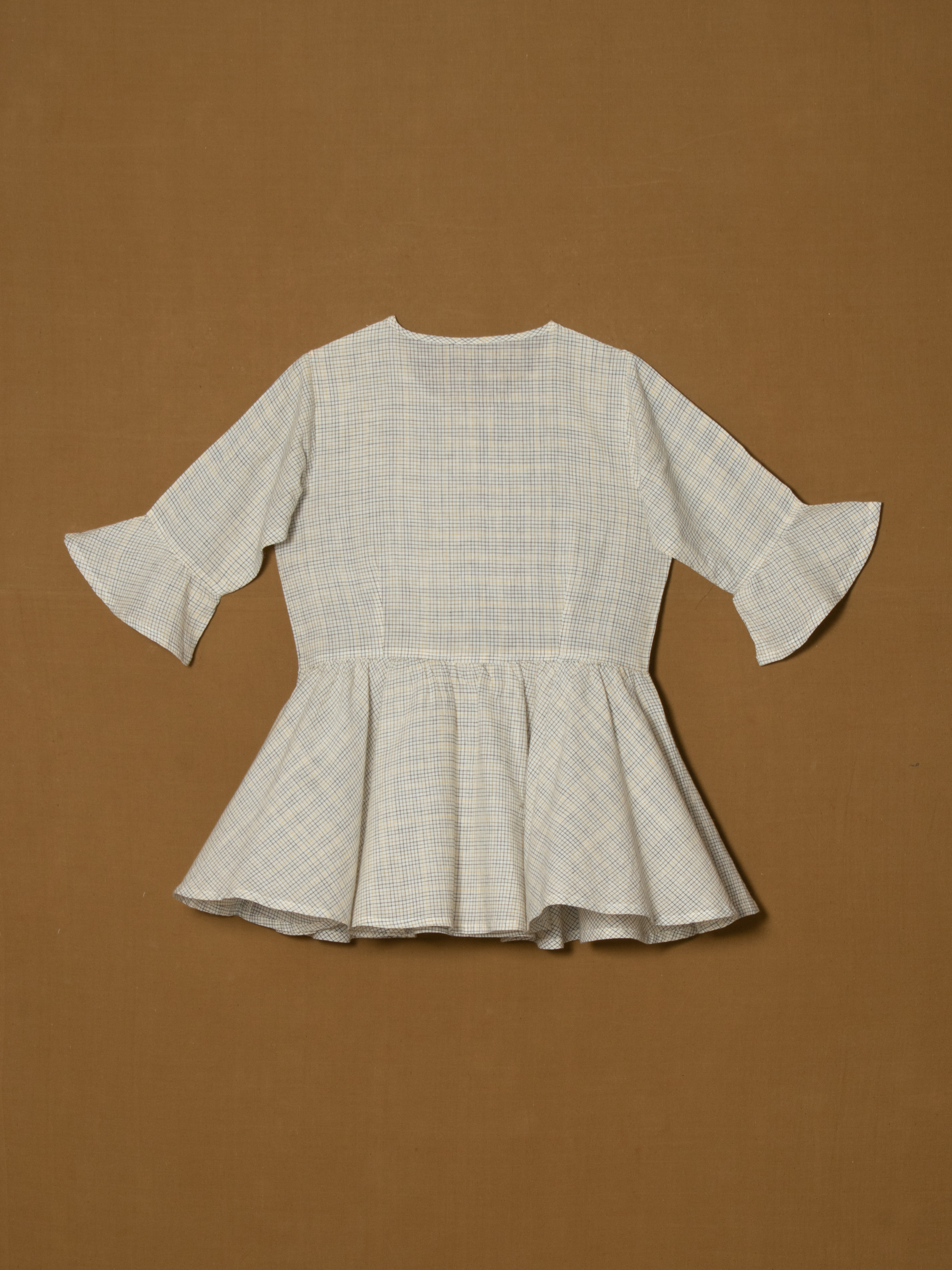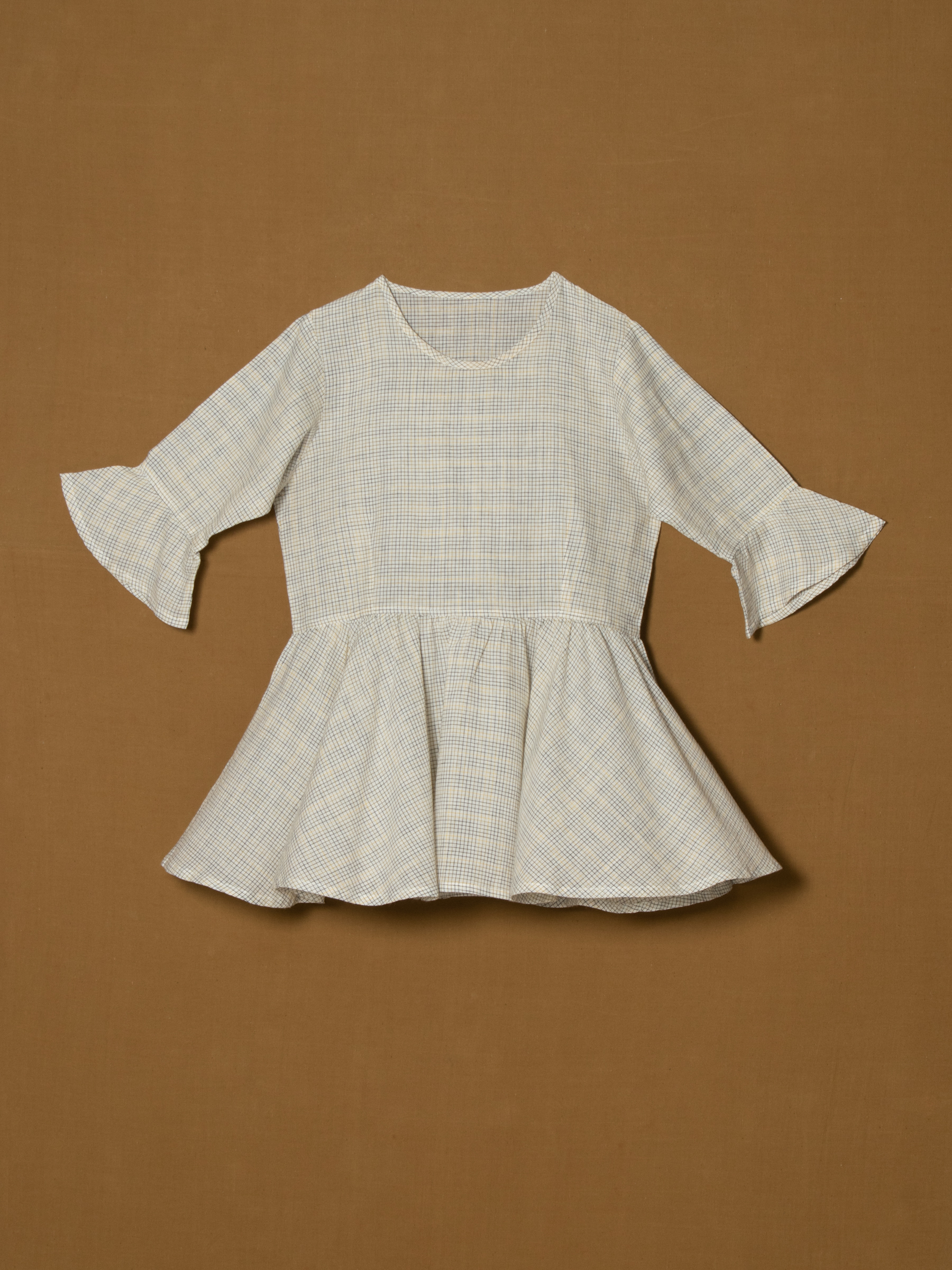 Subtle check pattern with bell sleeves.