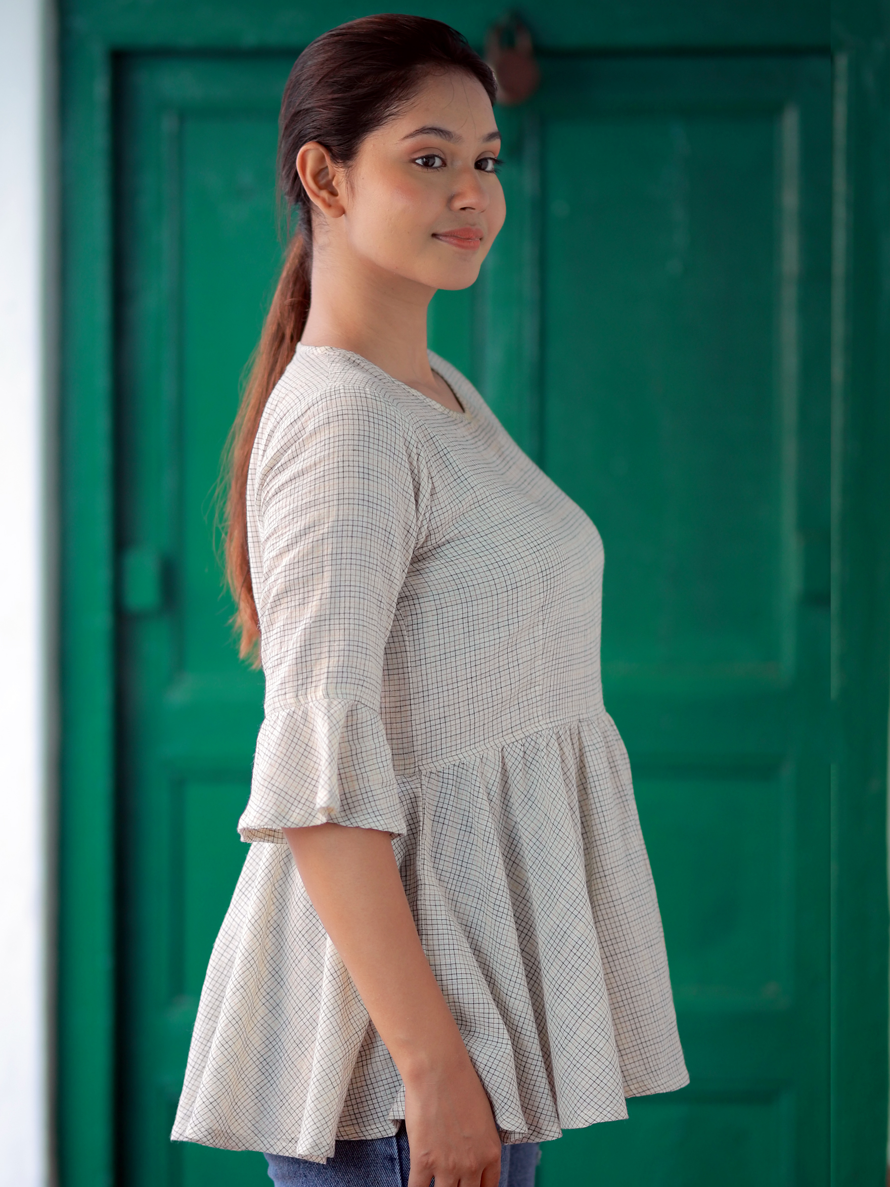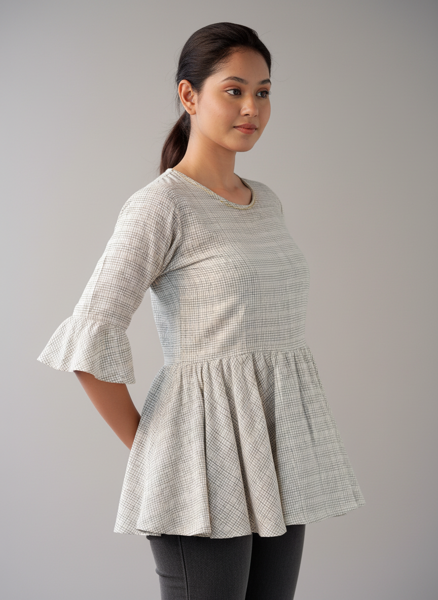 Playful and chic, this Short Free Style Top adds a touch of charm to women’s top collections. Designed in a subtle check pattern with flared bell sleeves and soft bottom gatherings, it offers a breezy silhouette that blends comfort with elegance. Perfect for casual outings or semi-formal wear, it’s both versatile and stylish.