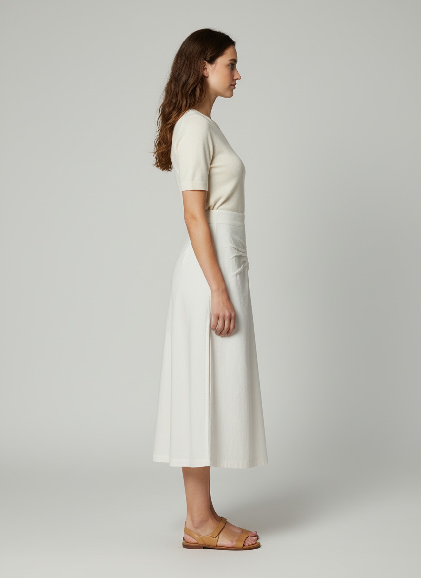 Contemporary yet classic, this Skirt with Front Ruching brings a sophisticated touch to women’s skirts. The front ruching detail enhances the silhouette while maintaining comfort and elegance. Its clean ivory tone and soft drape make it a versatile piece for both professional and social settings.