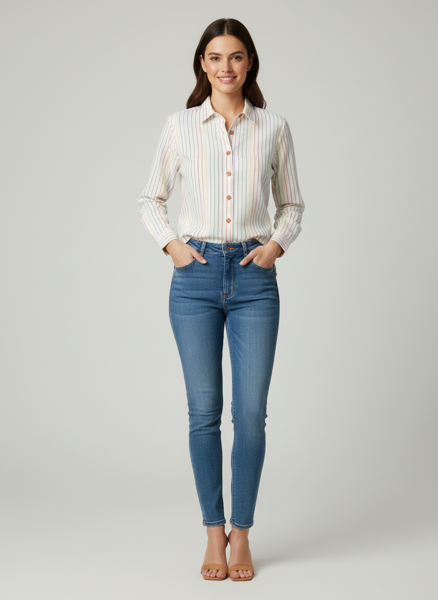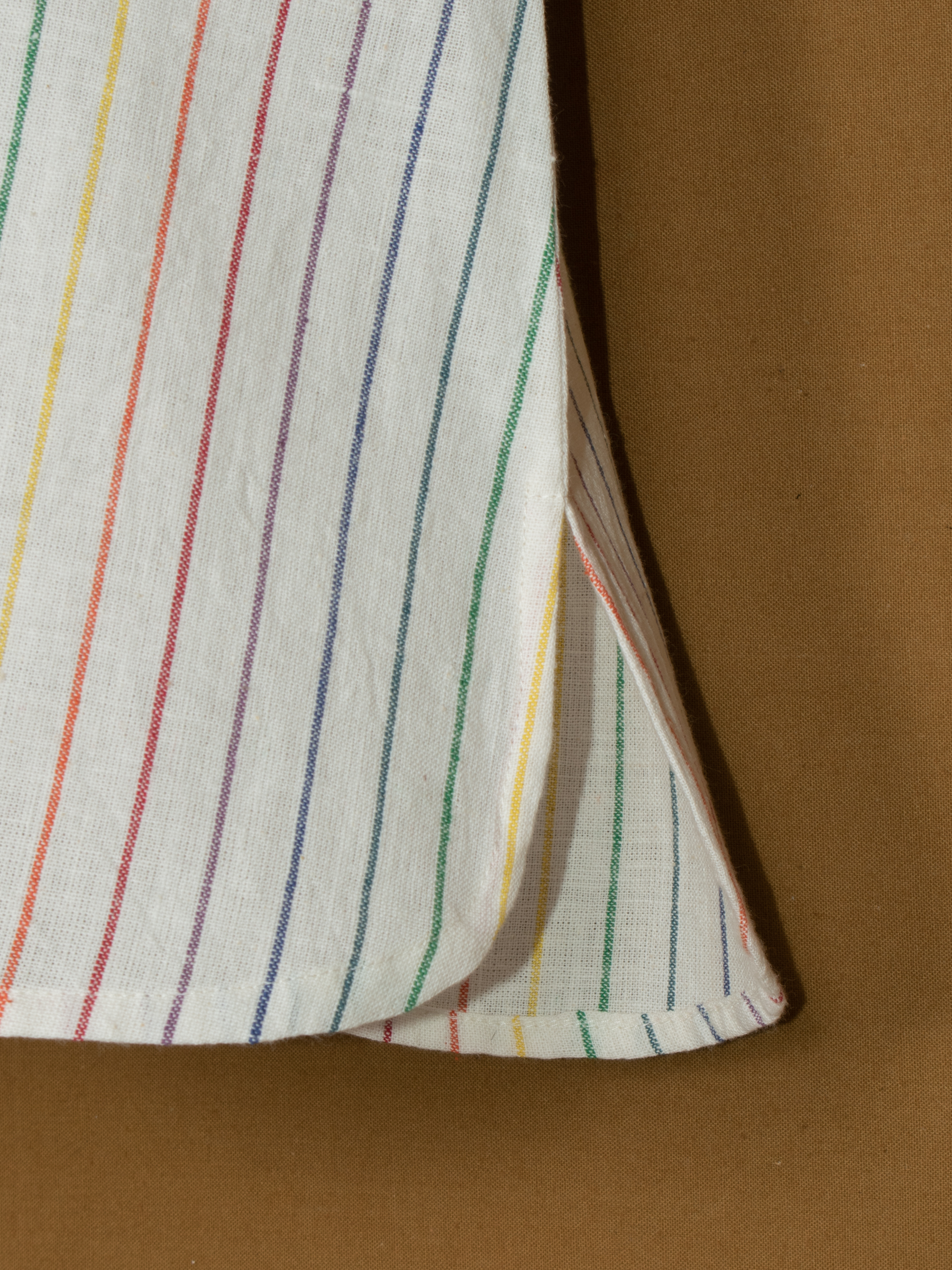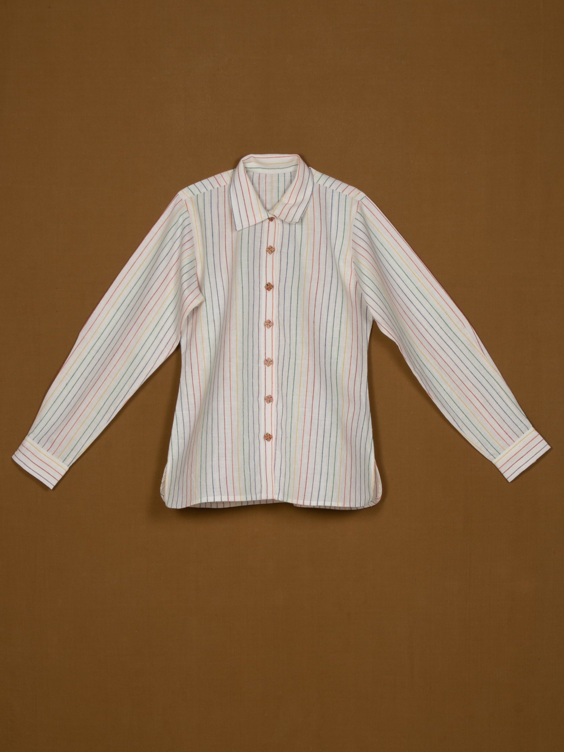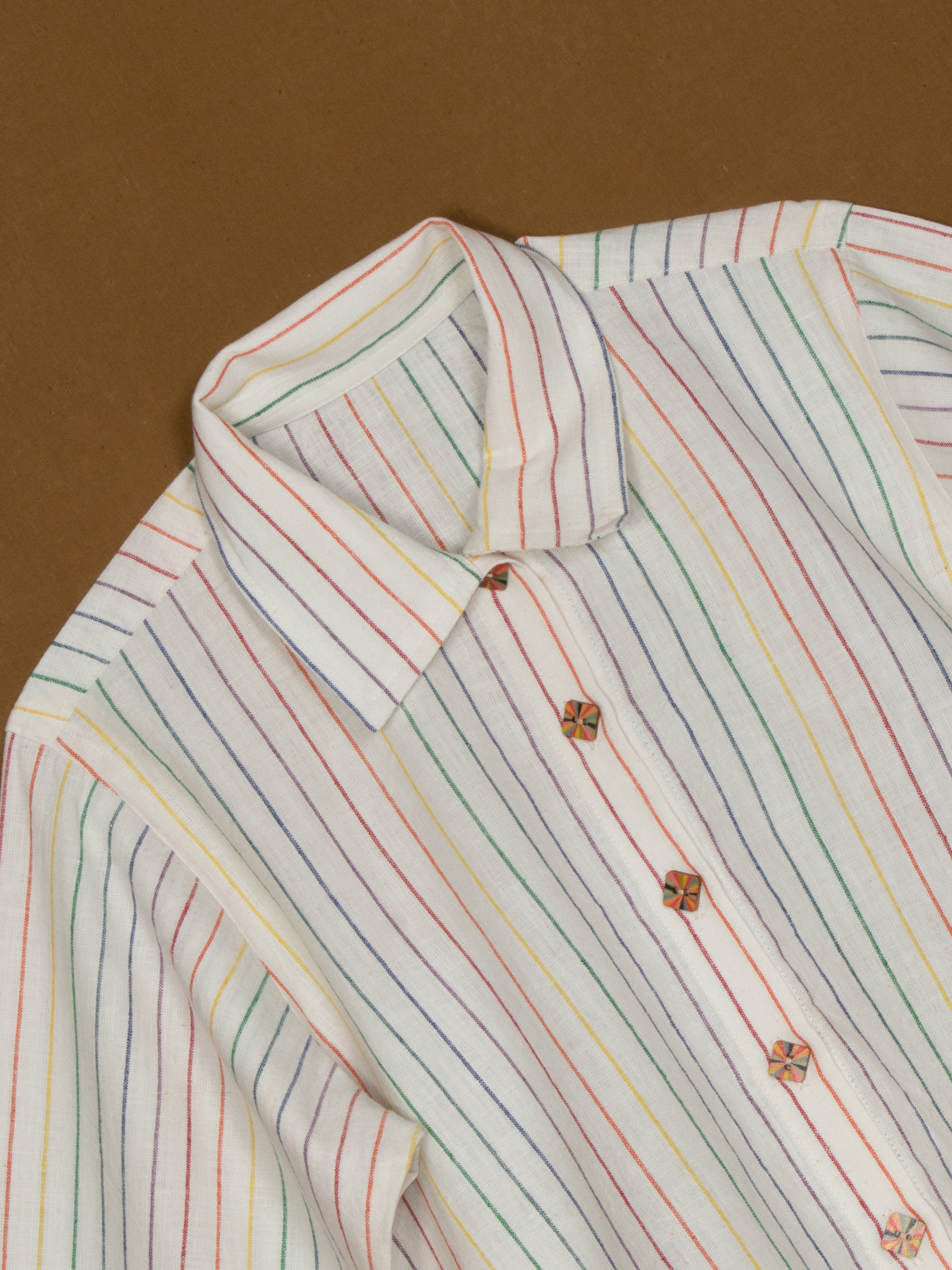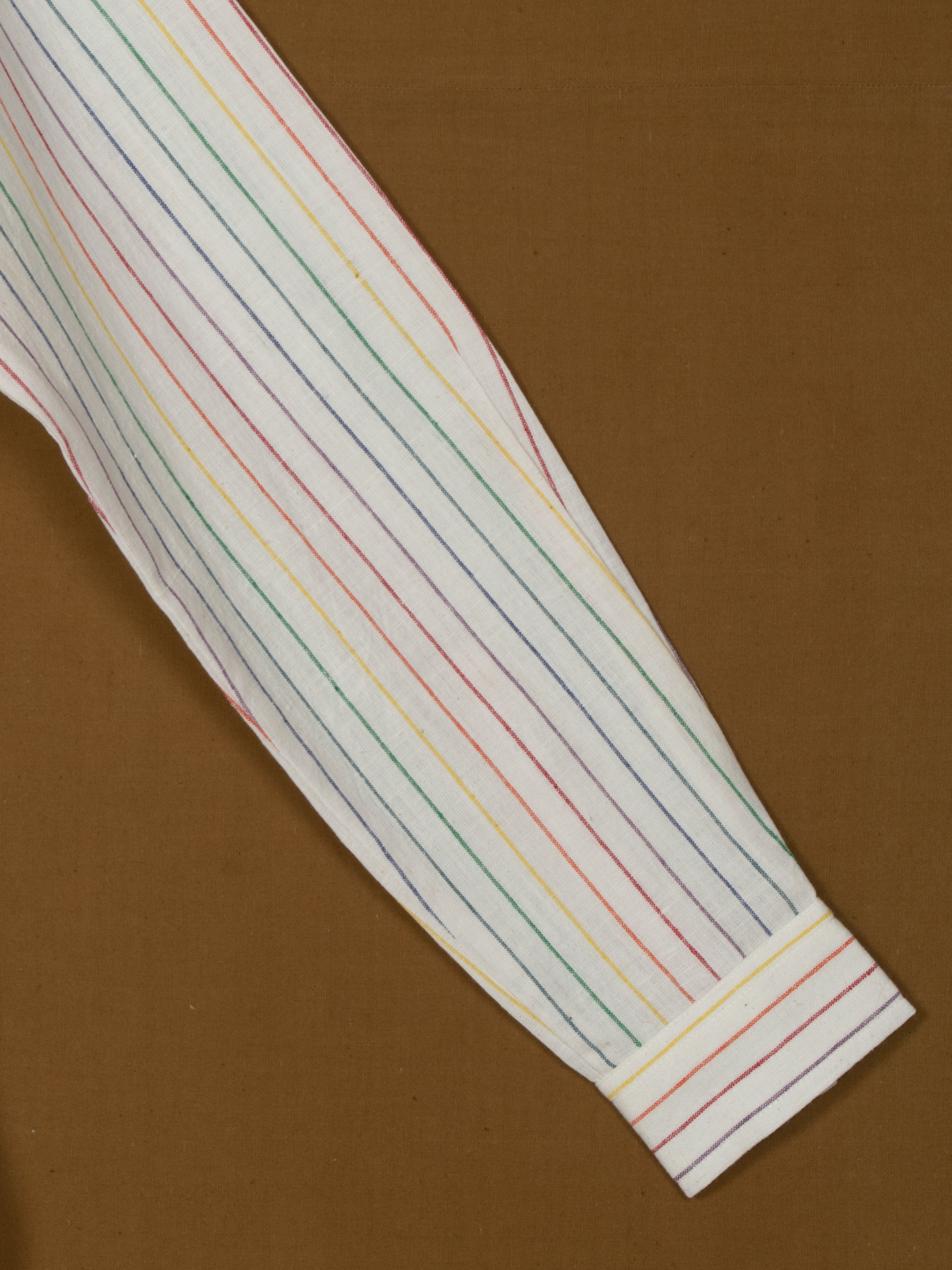 Classic and versatile, this Spread Collared Shirt refreshes the timeless collared shirt with subtle charm. Designed in a crisp white base with multicolor vertical stripes, it features a button-down placket and long sleeves finished with a single-button cuff. Ideal for workwear or casual layering, it balances structure with ease.