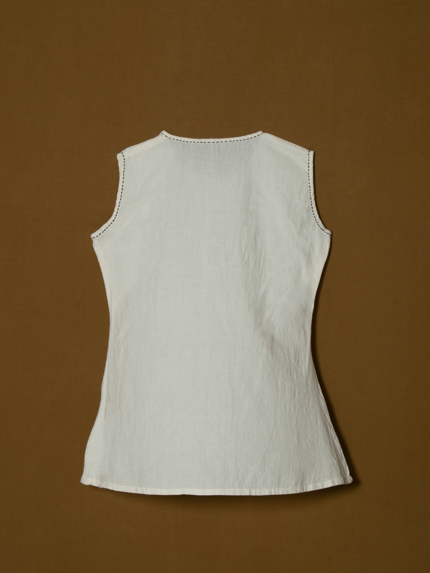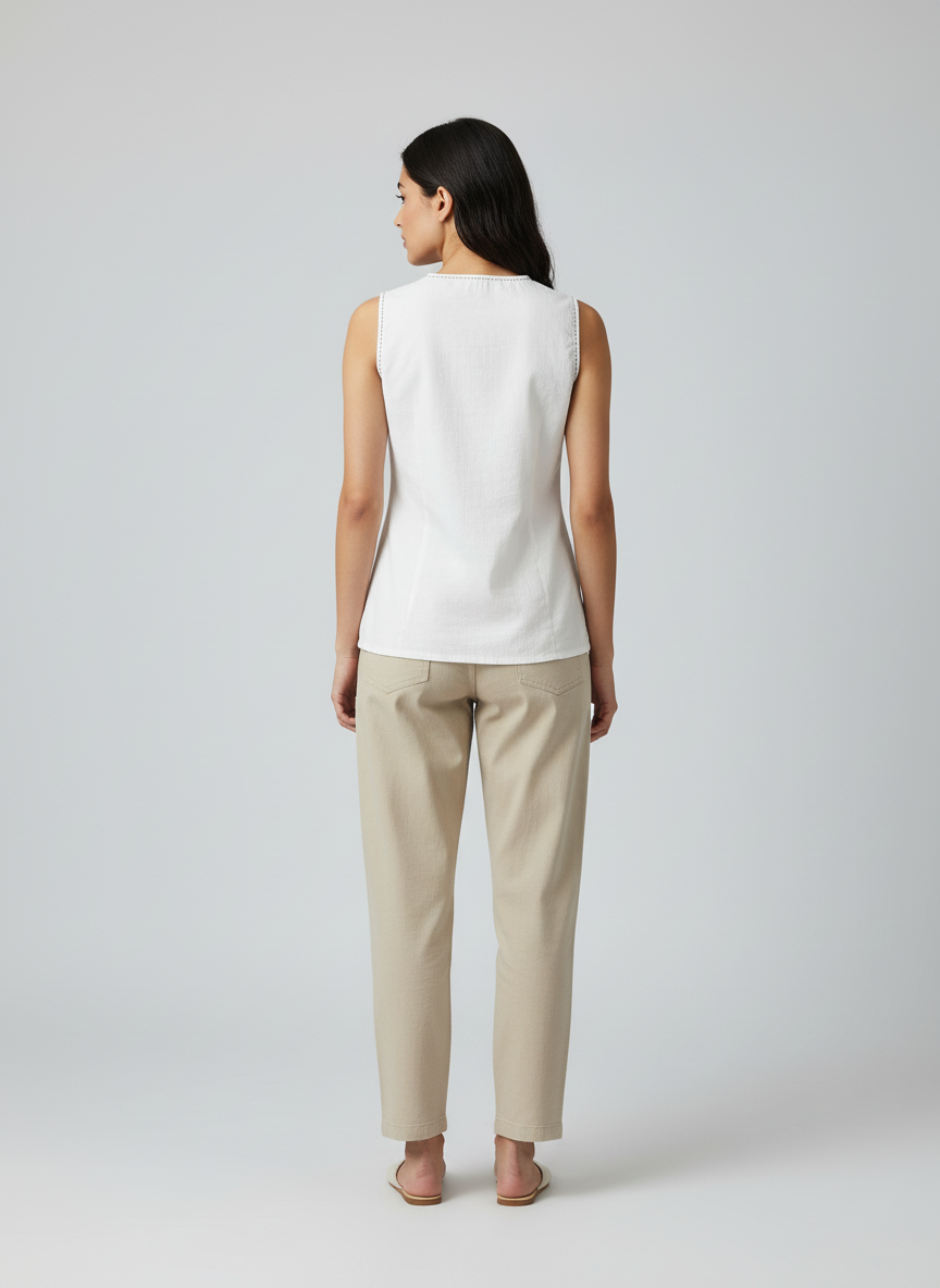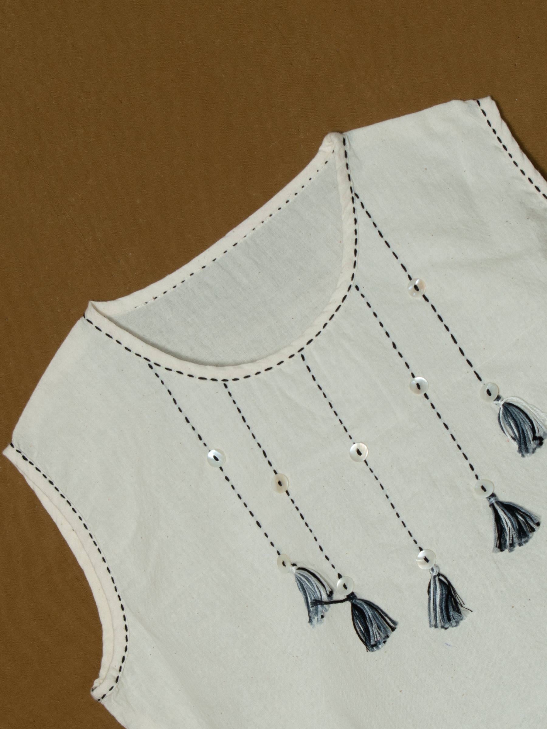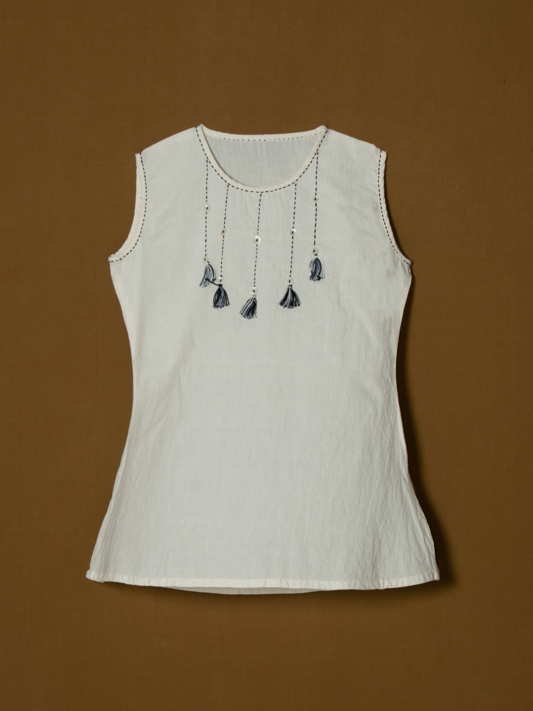 White sleeveless women's top with tassel embellishments.