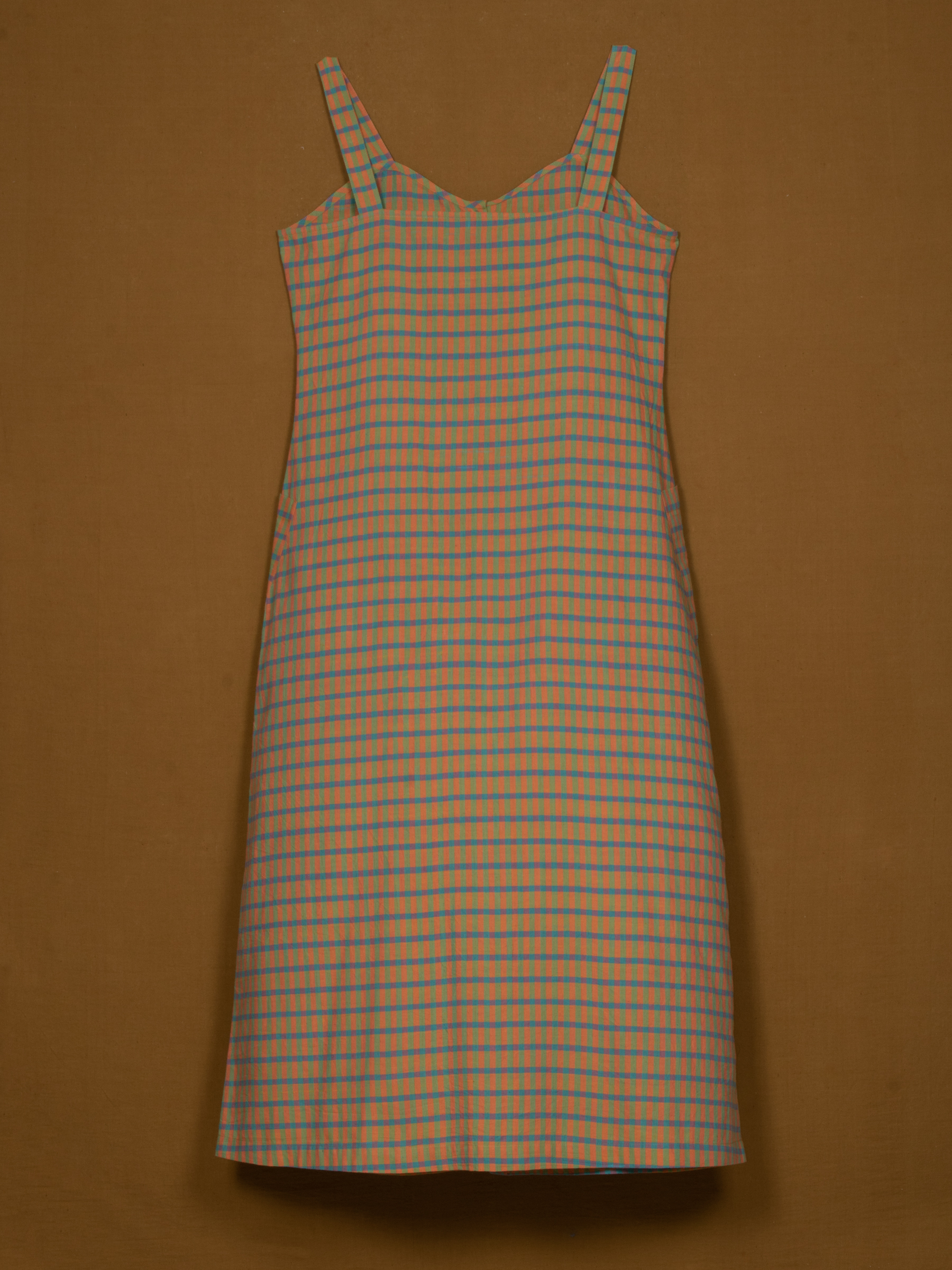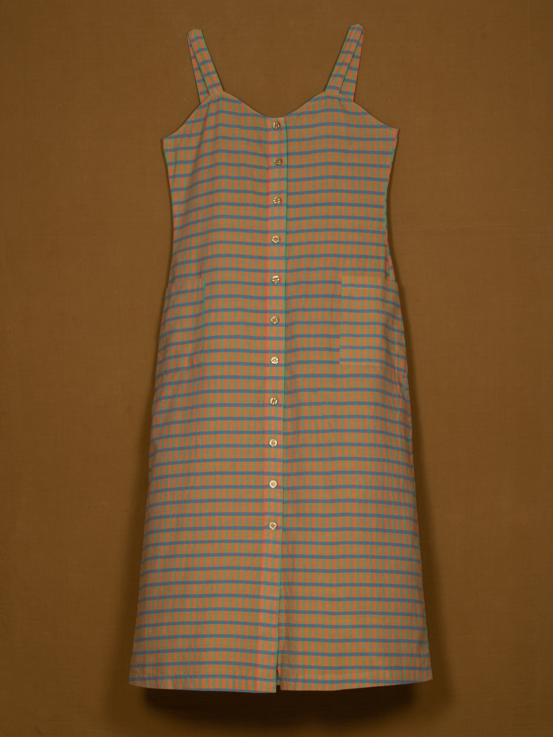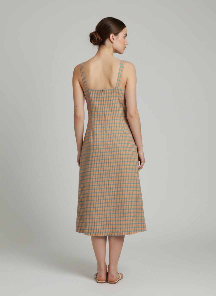 Fresh and easygoing, this Three Fourth Front Opening Dress is a vibrant addition to women’s summer dress collections. Designed in a colorful check pattern with slim straps and a continuous button-down placket, it offers a playful yet structured silhouette. Lightweight and breathable, it’s perfect for warm days, casual outings, or relaxed gatherings.