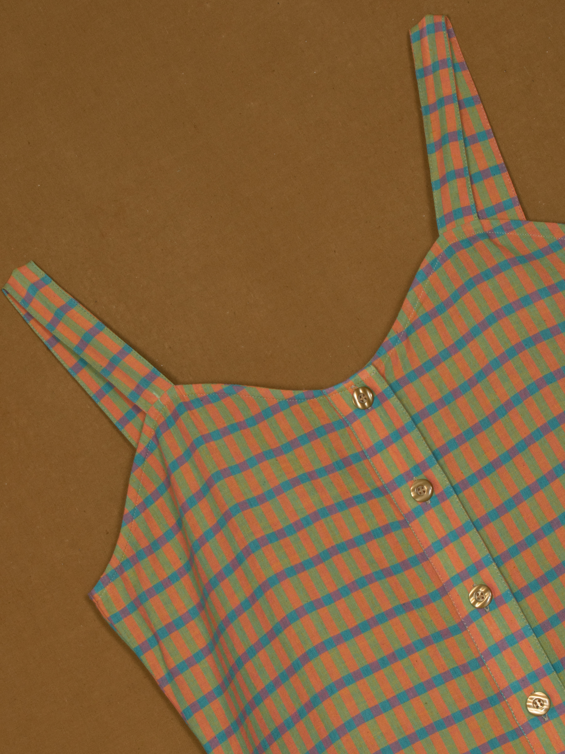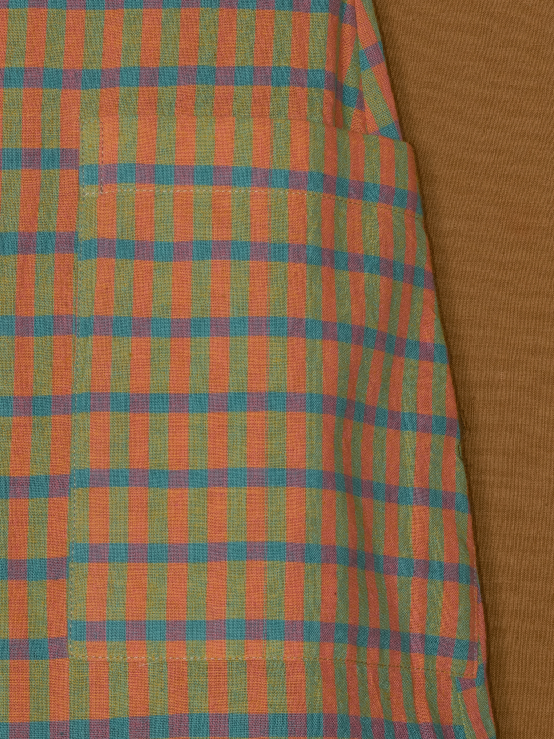 Colorful check pattern with continuous front placket.
